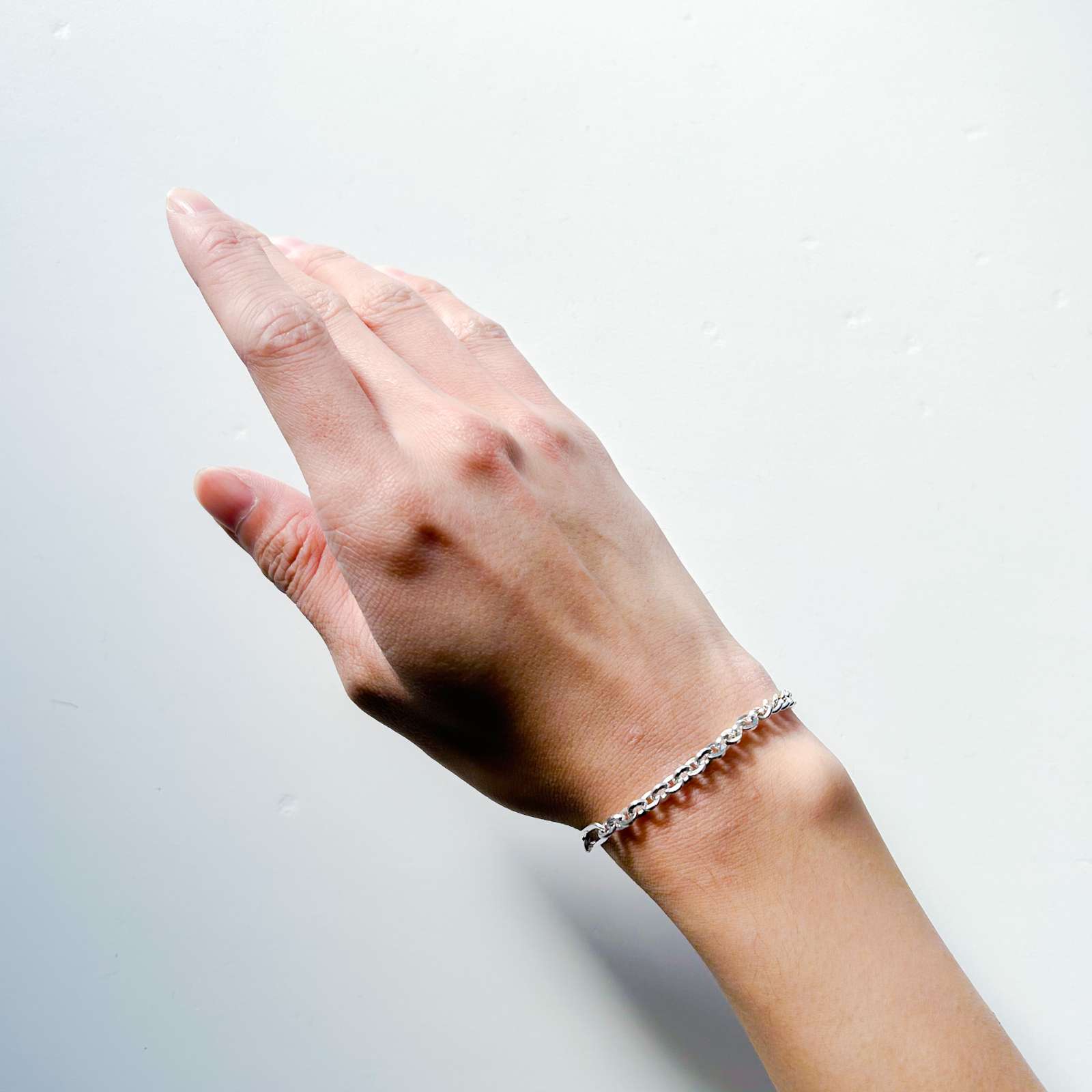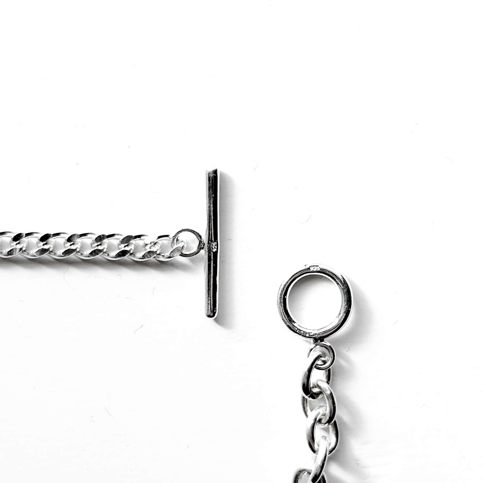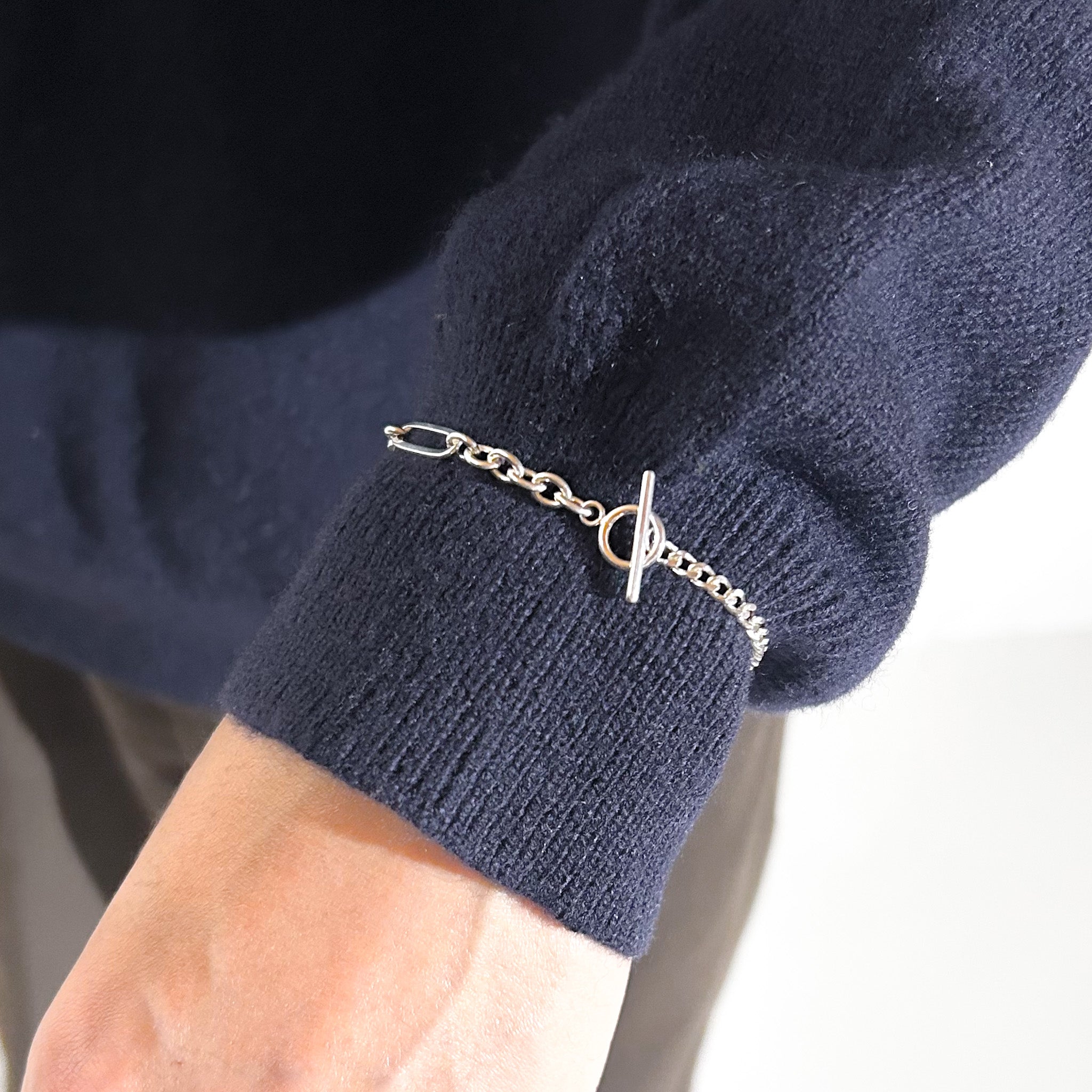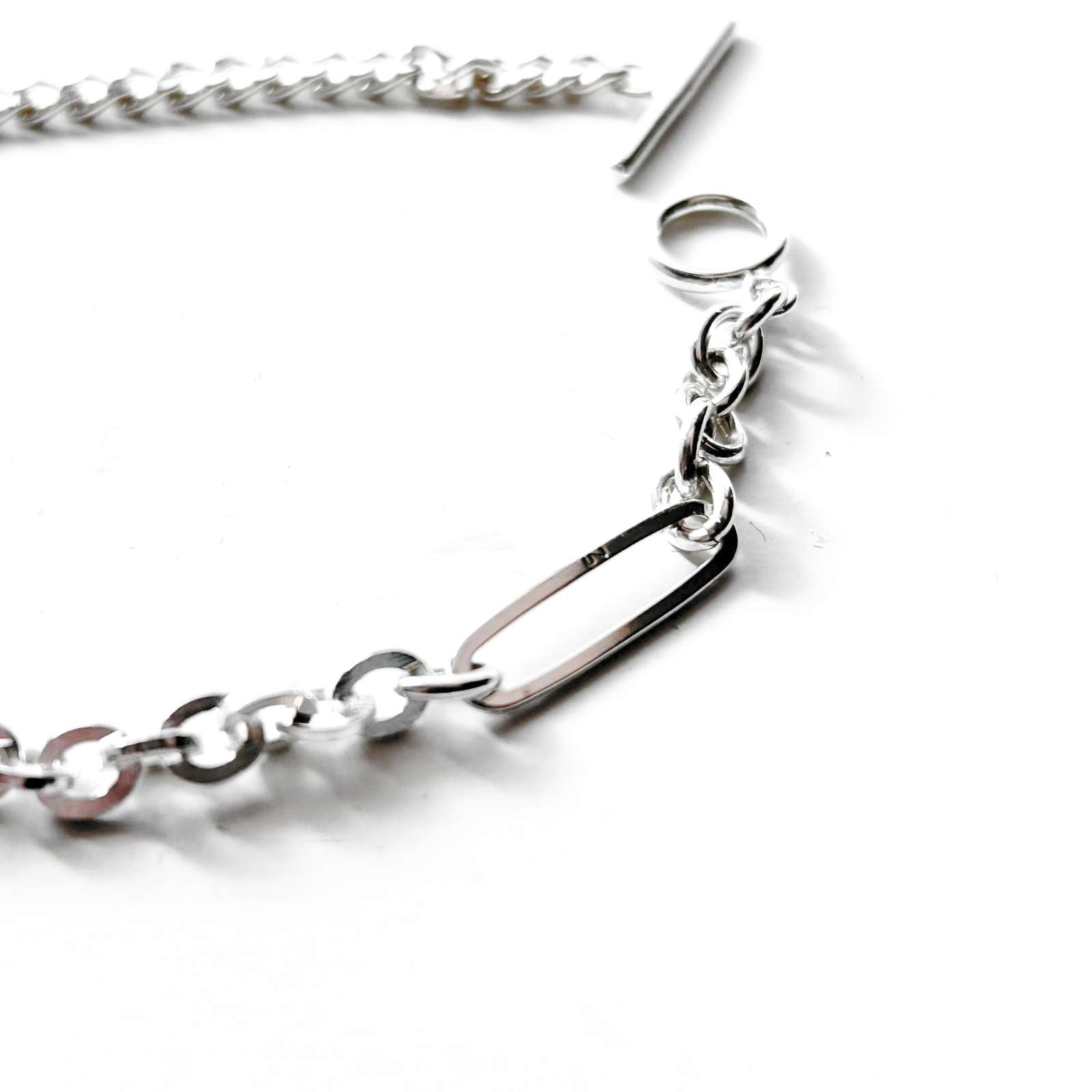4種類のチェーンを組み合わせたブレスレットです。 小判型チェーンのコマにNLの刻印が入ります。 男性はMサイズ推奨、女性はSサイズ推奨です。