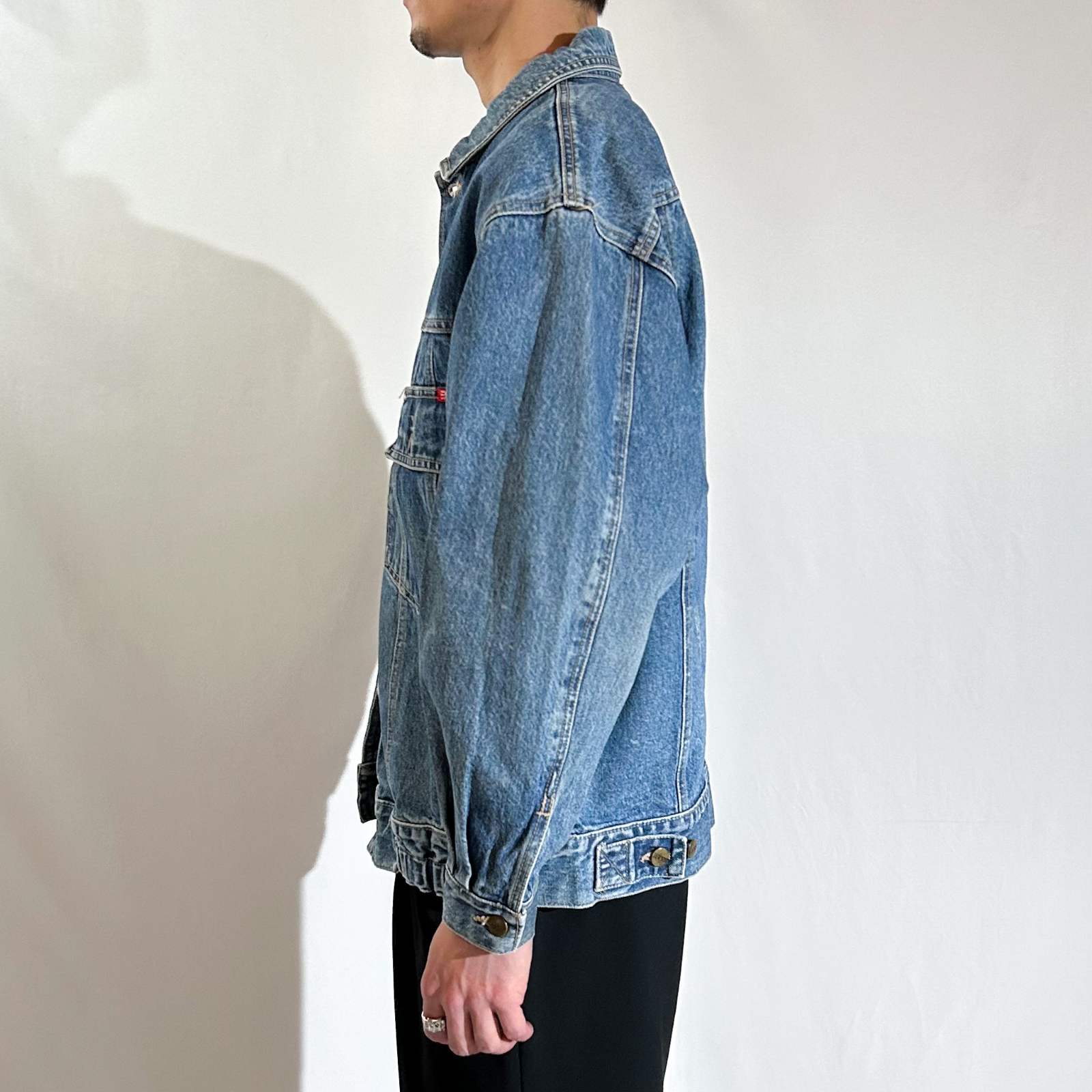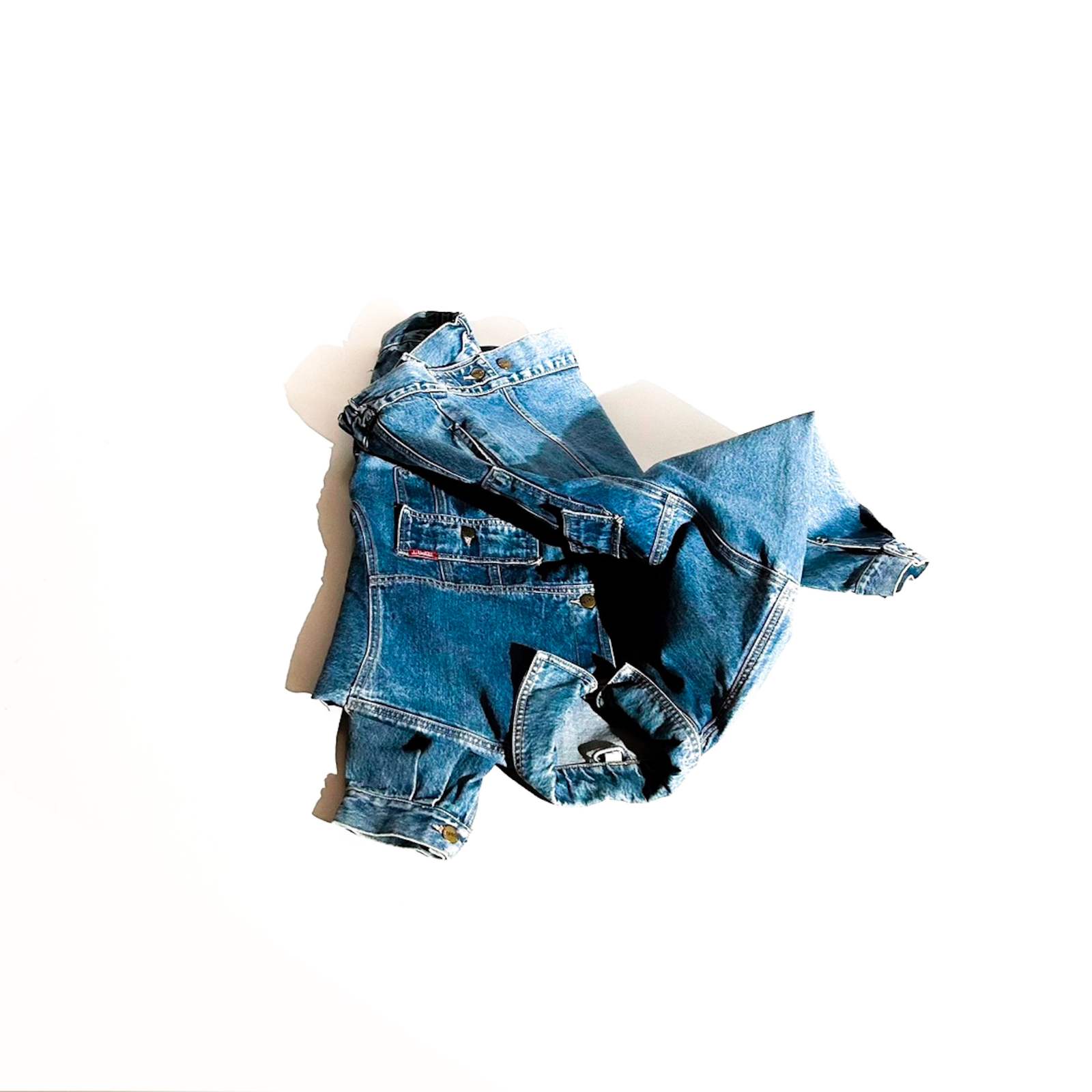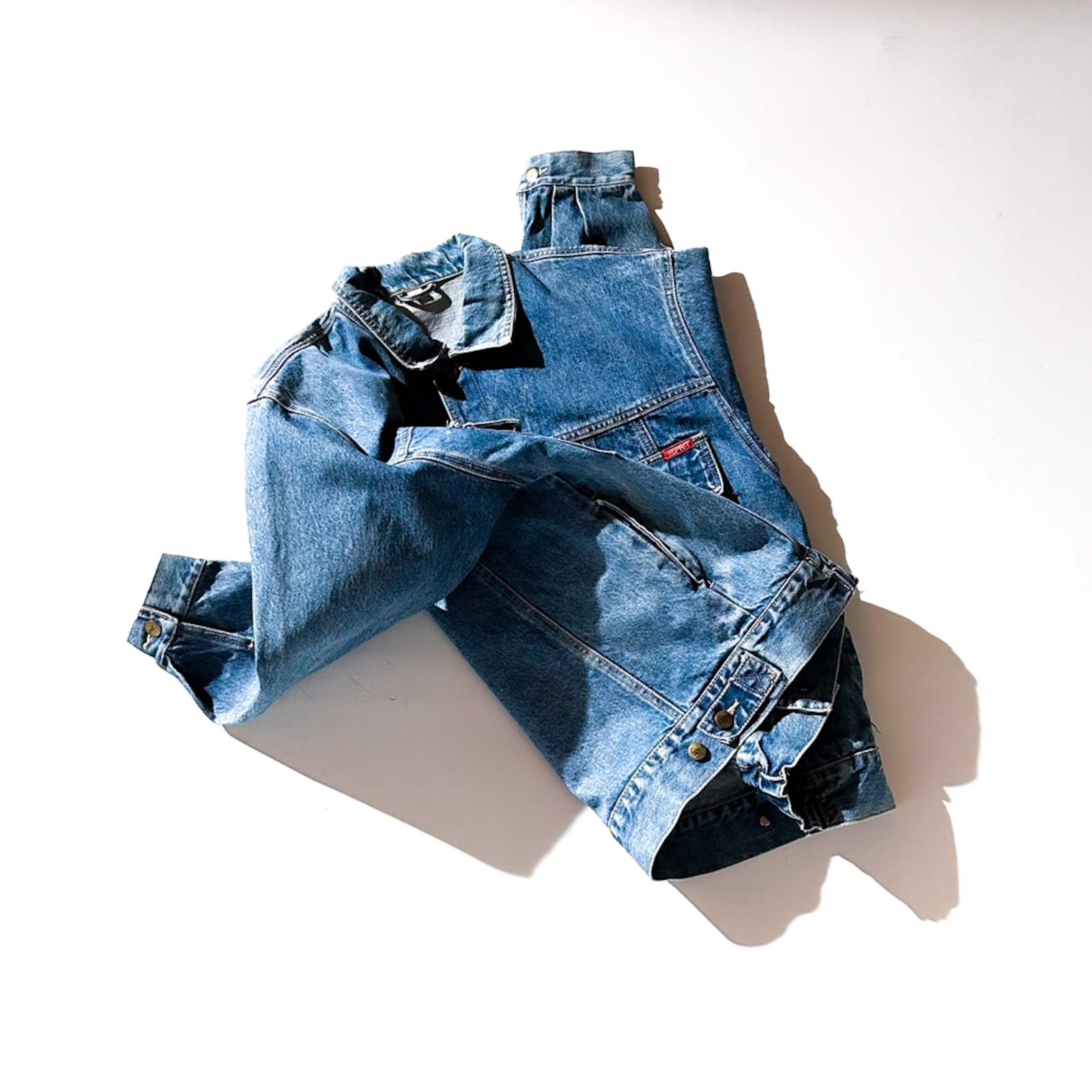 Bランク 一箇所フロントボタンリペア、両ひじに使用感、首元と袖口に汚れ、裾に小さなダメージが見られます