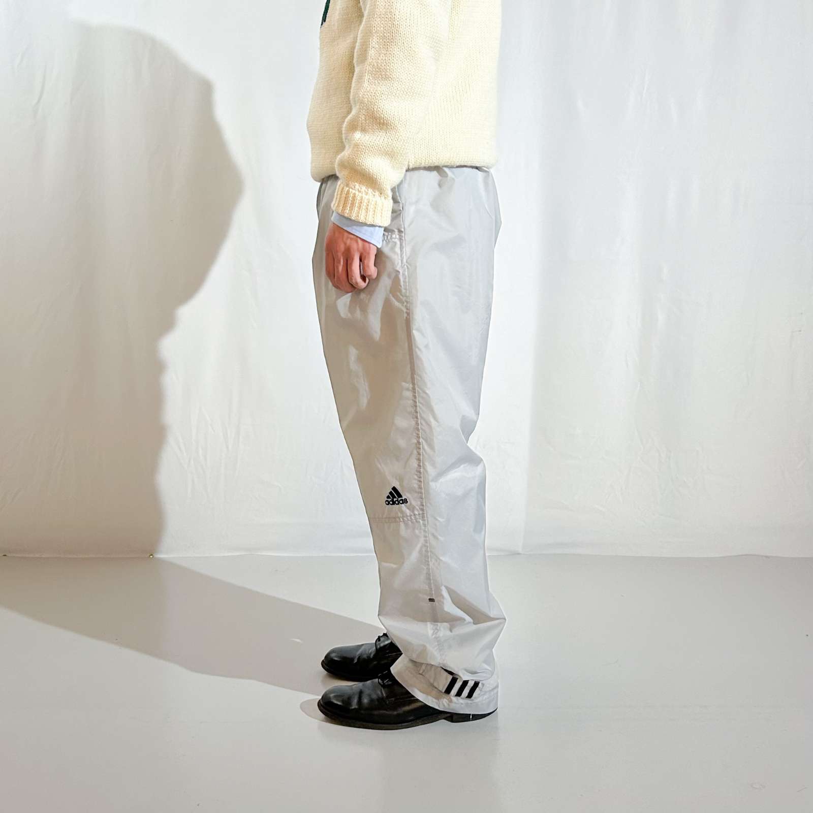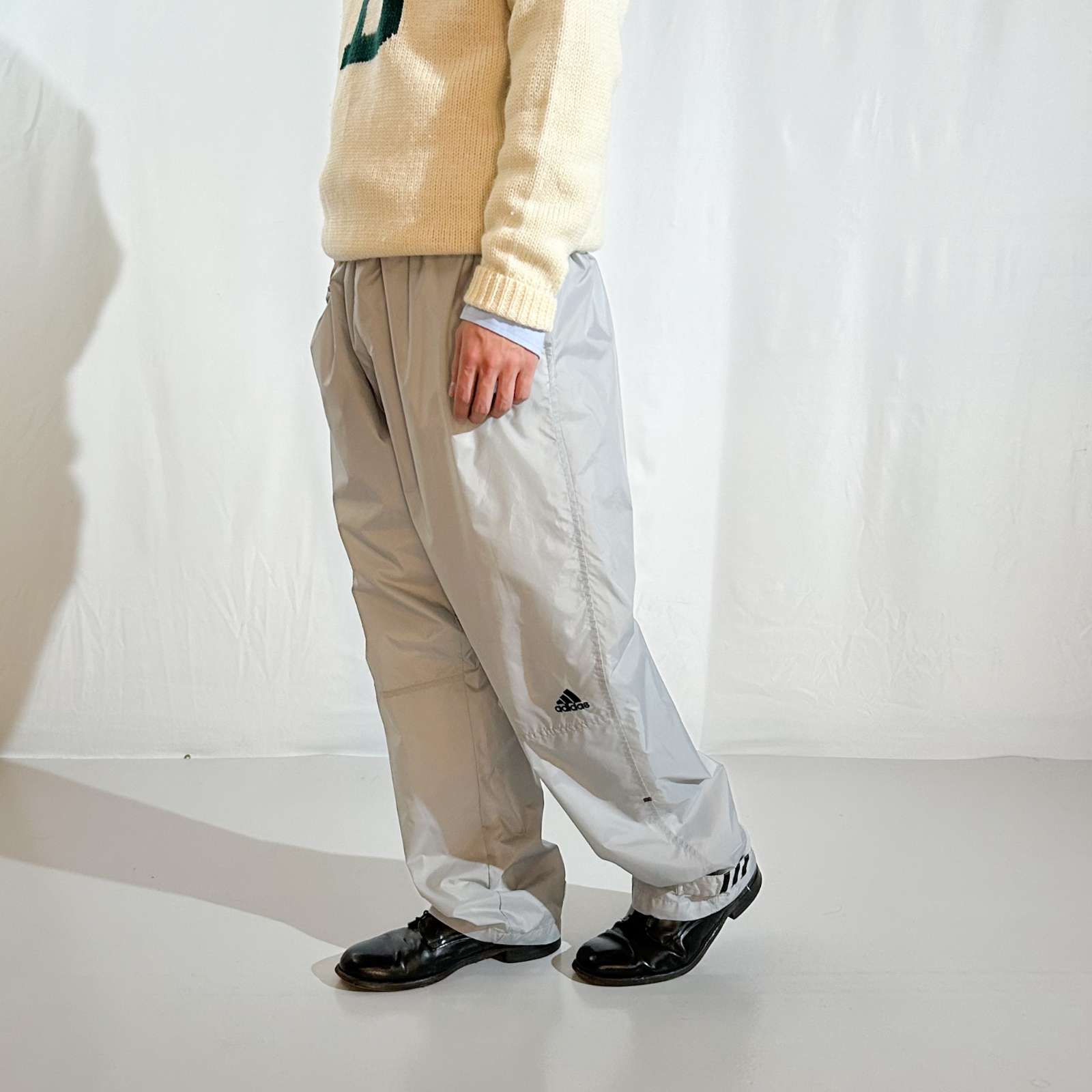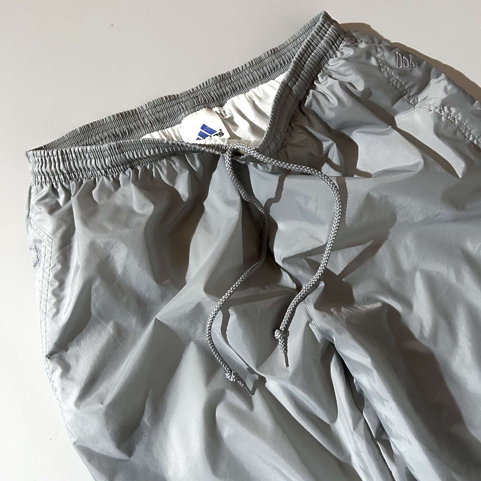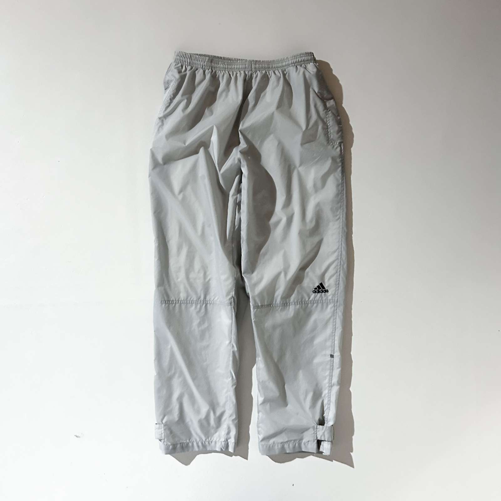 adidasナイロンパンツ。このタグと1個後のタグはパンツ全般太くて今っぽく履きやすい。 グレーカラーは地味に探すと無いやつです。基本ネイビーやレッド、ブラックが多め。当店ではグレーは初めての入荷になります。ぜひ探してた方いかがでしょうか?