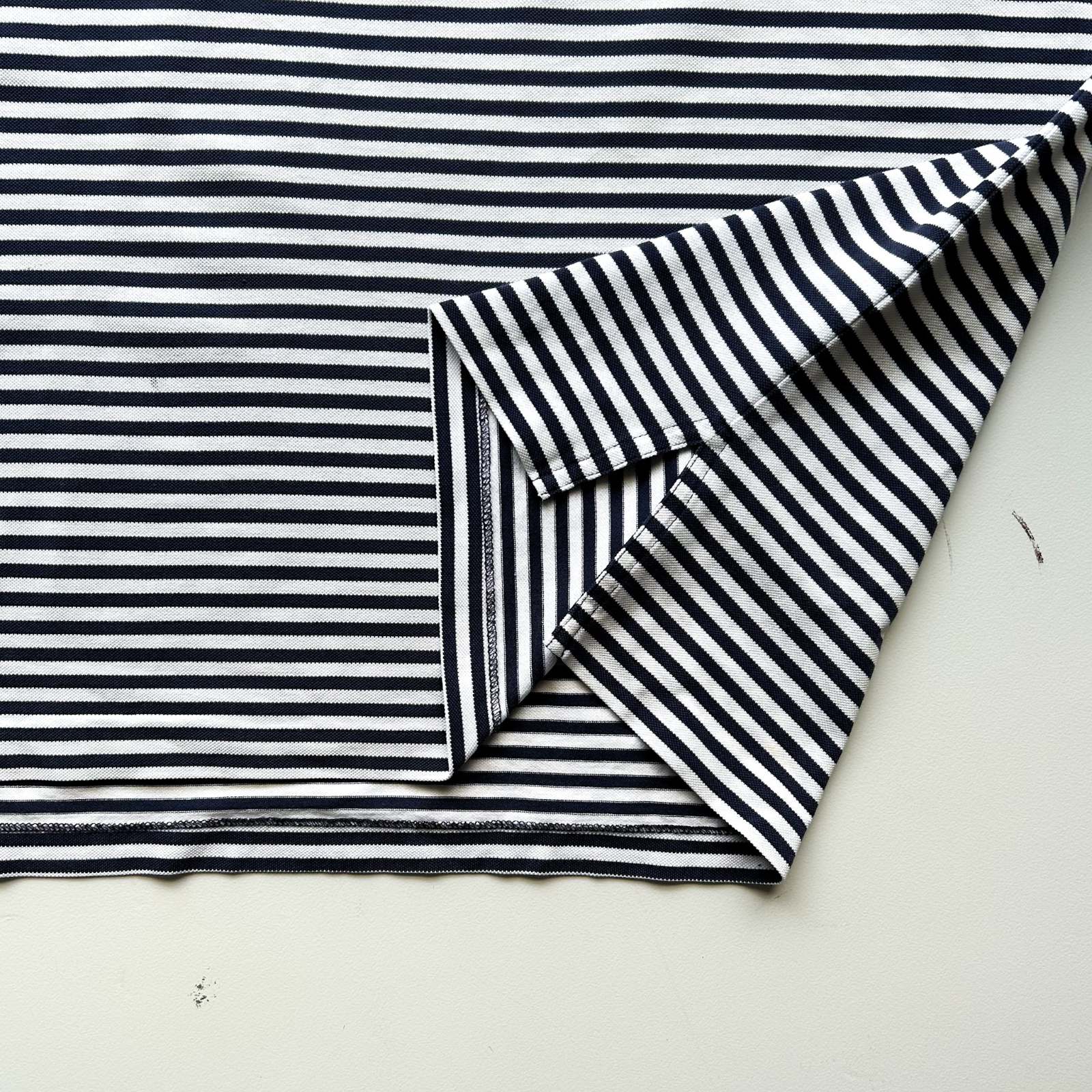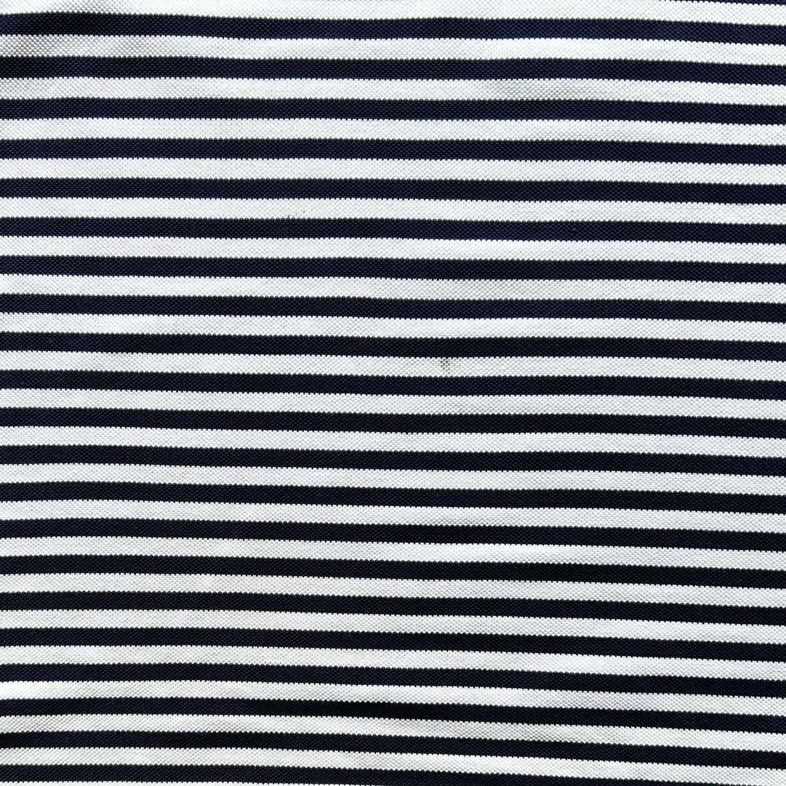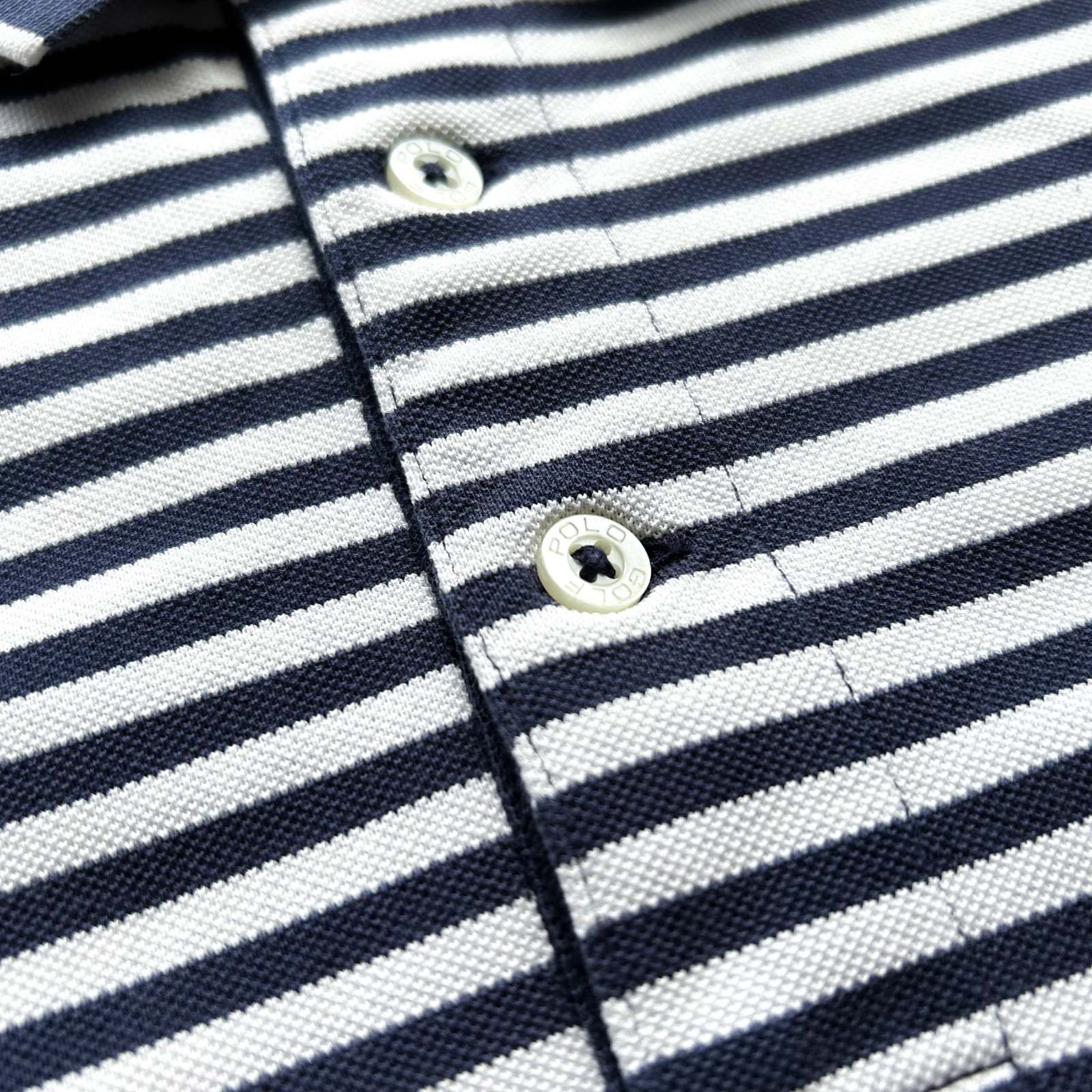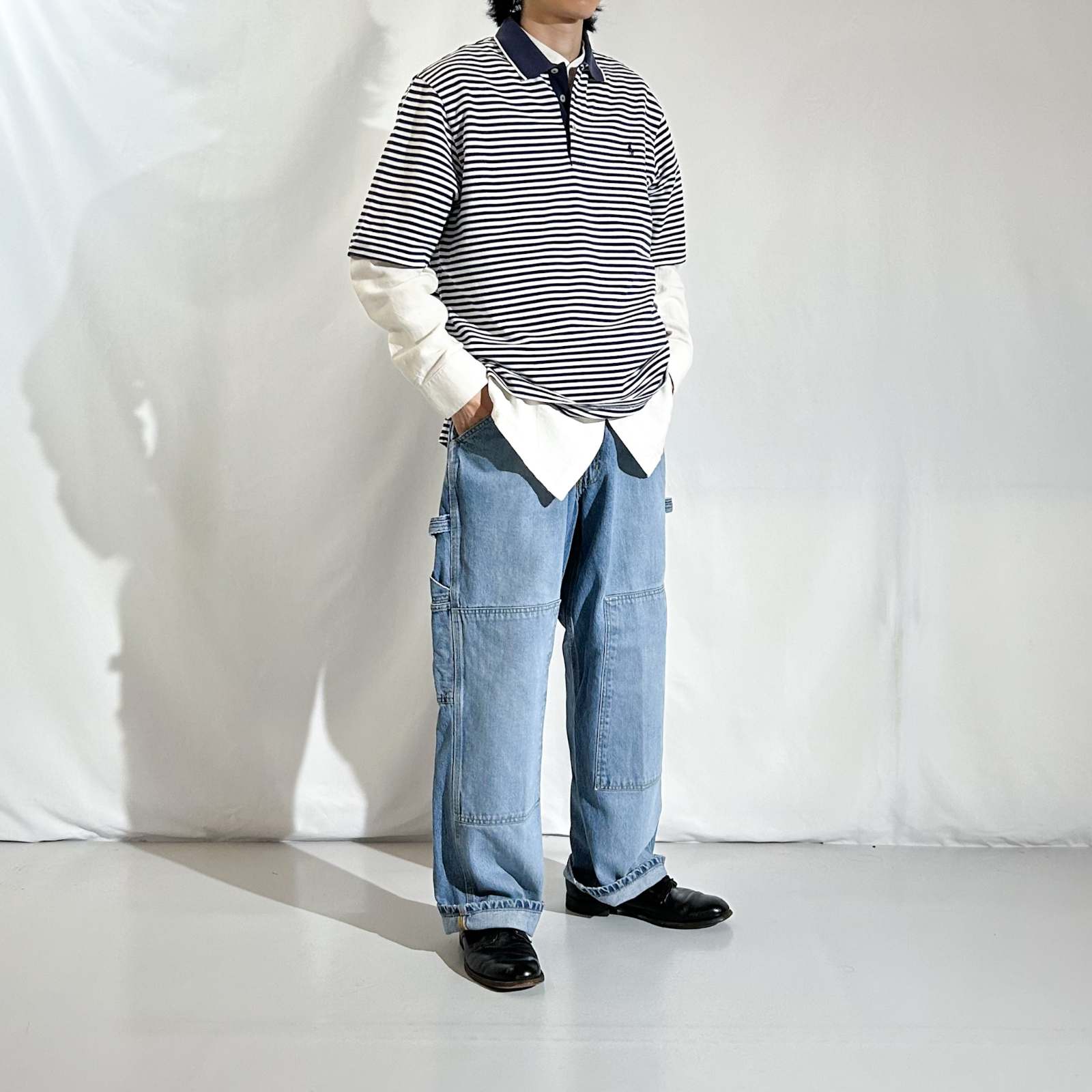 ネイビー×ホワイトの爽やかな配色が魅力の〈POLO GOLF〉のボーダーポロシャツ。 繊維が細く長い高級素材「ピマコットン」を100%使用しており、肌触りの滑らかさと上品な光沢感が特徴です。 シンプルながら印象的な細ボーダー柄で、1枚でもインナーでも映える使い勝手の良さも魅力。スラックスやチノパンと合わせて、大人のアメカジスタイルに落とし込むのはもちろん、550・560・569などワイドデニムと合わせれば、どこか東海岸的なストリートの空気感も演出できます。 90年代当時は太ボーダーが主流だった中で、こちらは細ピッチで洗練された印象。プレッピーの上品さとストリートのラフさ、その両方を行き来できる“狭間”のような一着として、現代的なスタイリングに落とし込めるのが魅力です。