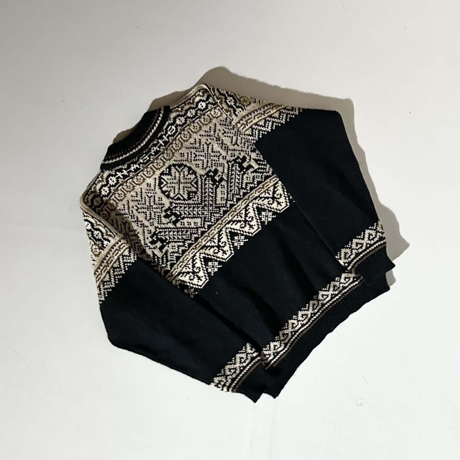 Dale of Norway(ダーレ・オブ・ノルウェー)は、1879年にノルウェーで設立された伝統的なニットウェアブランドです。高品質なウール製品を中心に、ノルウェーの伝統柄や北欧デザインを取り入れたアイテムで知られています。自社製造のノルウェー産ウールを使用している為、普通のウールよりも耐久性、防寒性、吸湿性に優れています〜。 伝統的なノルディック柄を採用したセーターは、ブランドの象徴的なアイテム。 170cm細身のモデルで肩幅は丁度よく、身幅にゆとりのあるシルエット。
