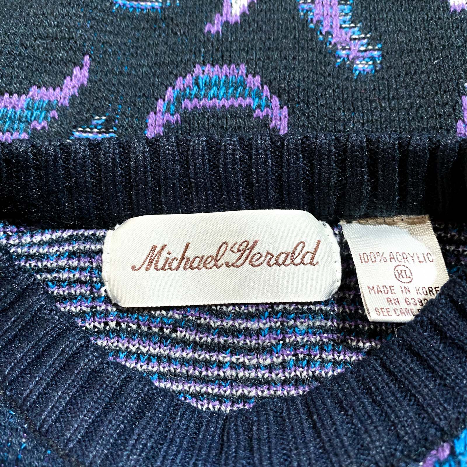 80年代頃の幾何学模様のニットになります。 紫と黒の配色がお洒落なアイテム。ふんわりと柔らかい保温性に優れたアクリル素材は、秋冬の寒いシーズンがおすすめの着用時期になります。 173cm 56kgのモデルでジャストサイズになります。