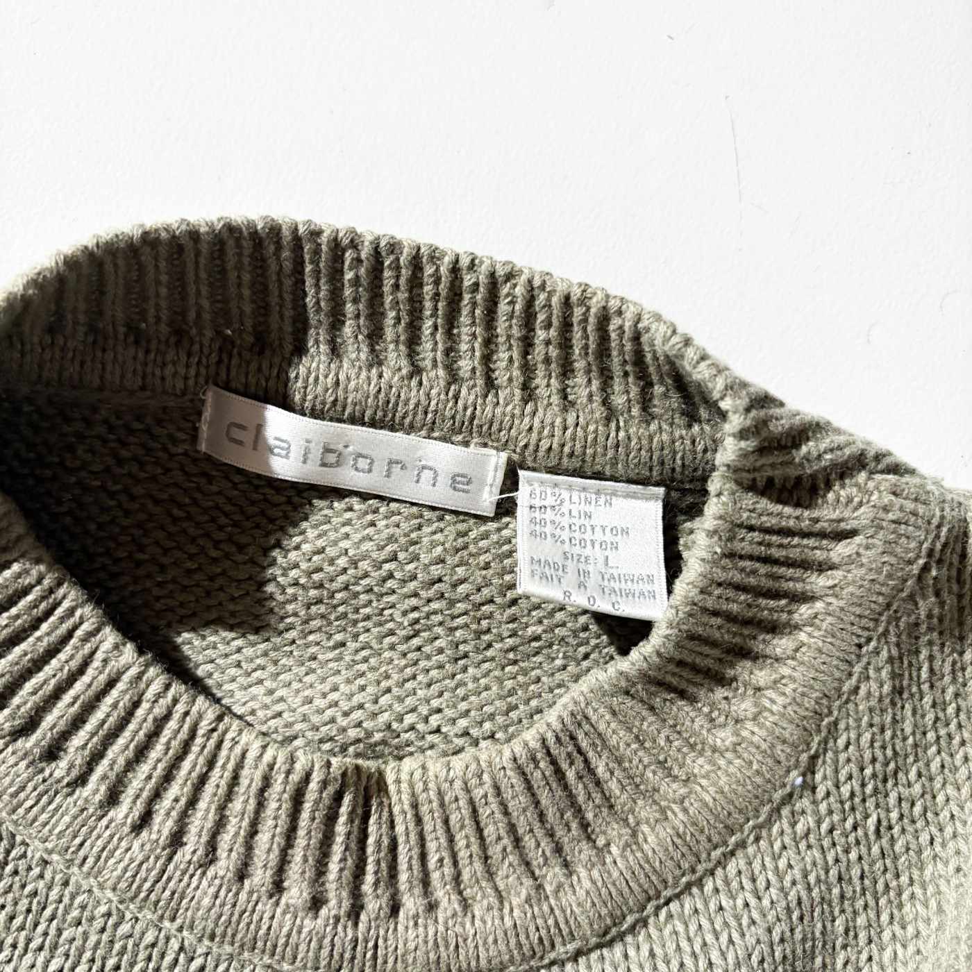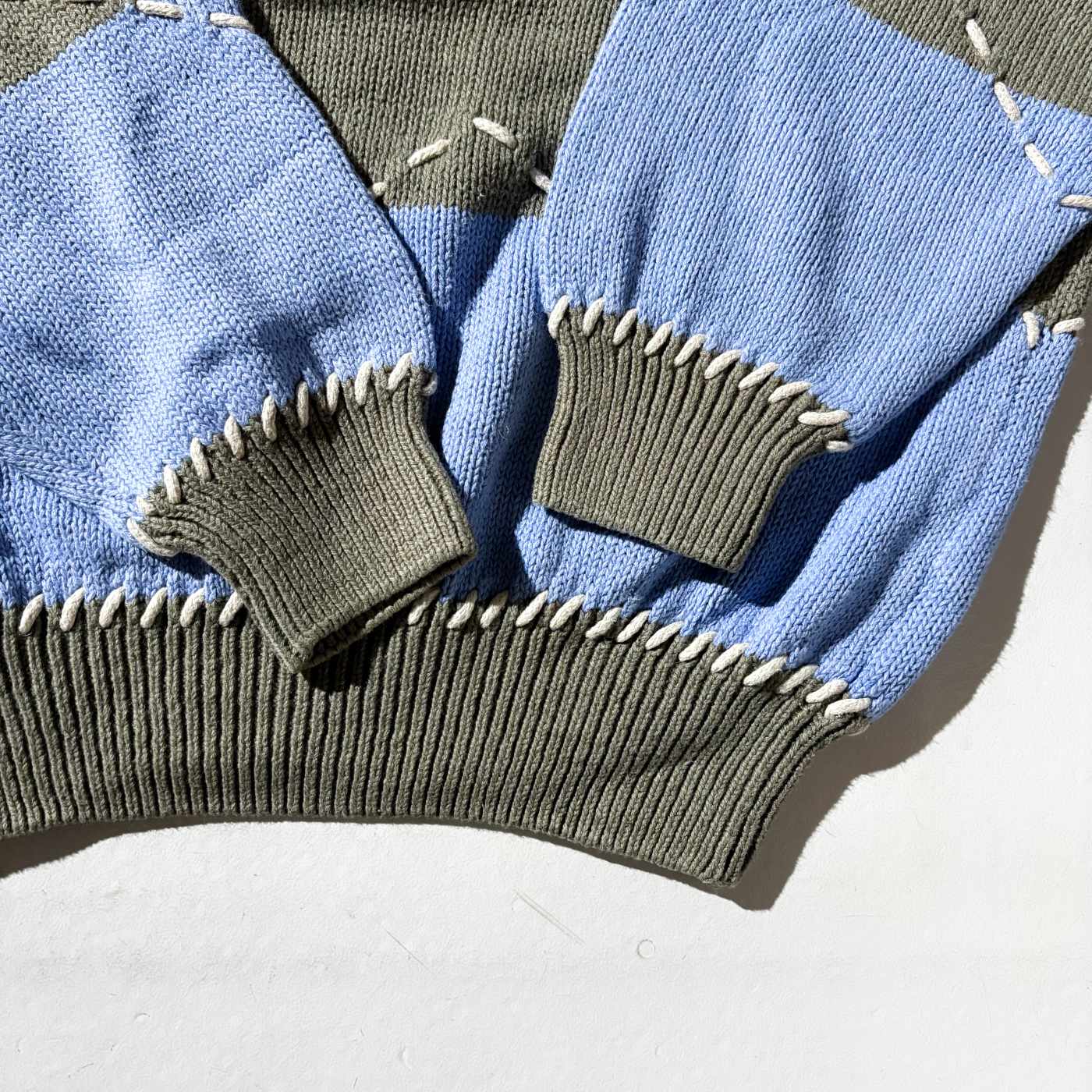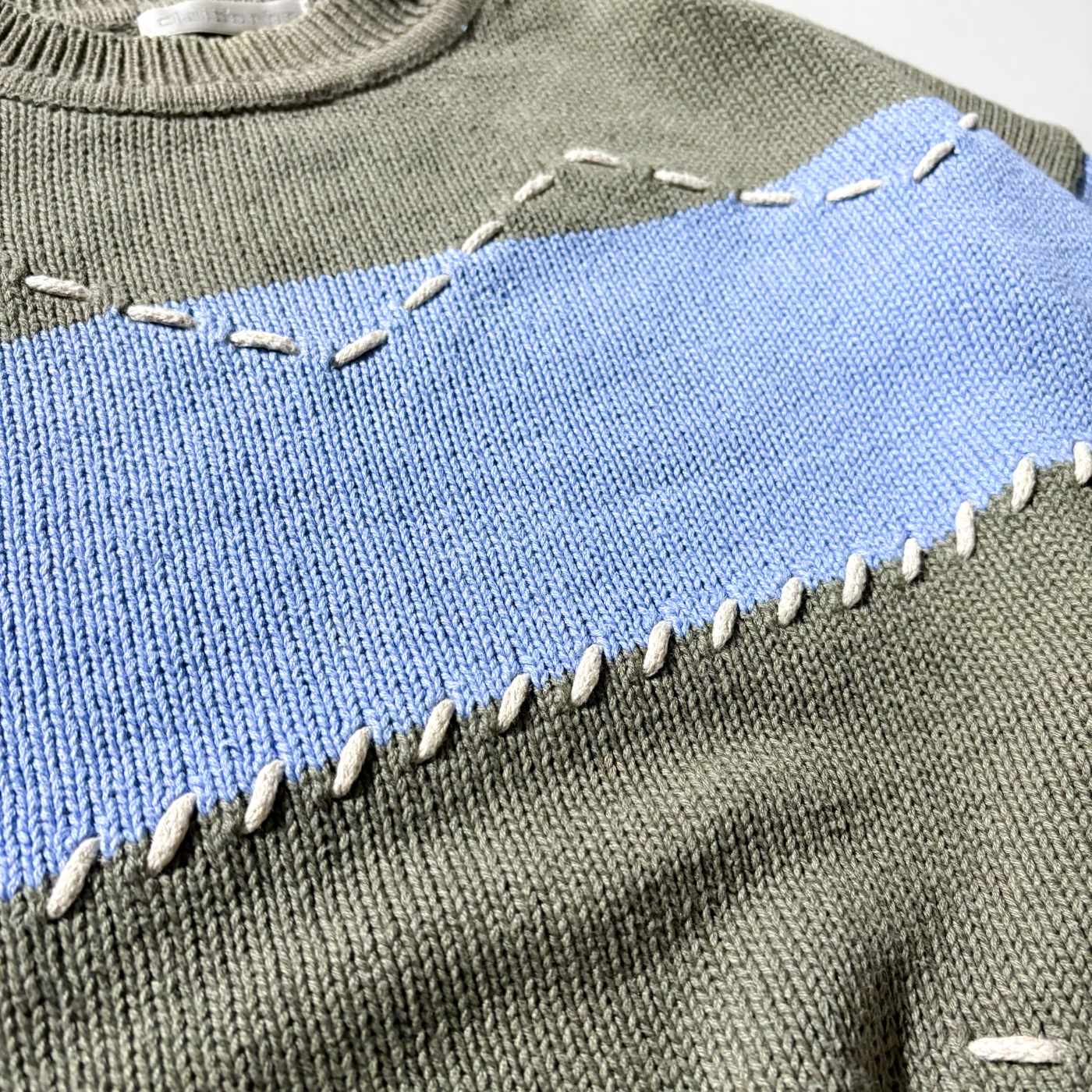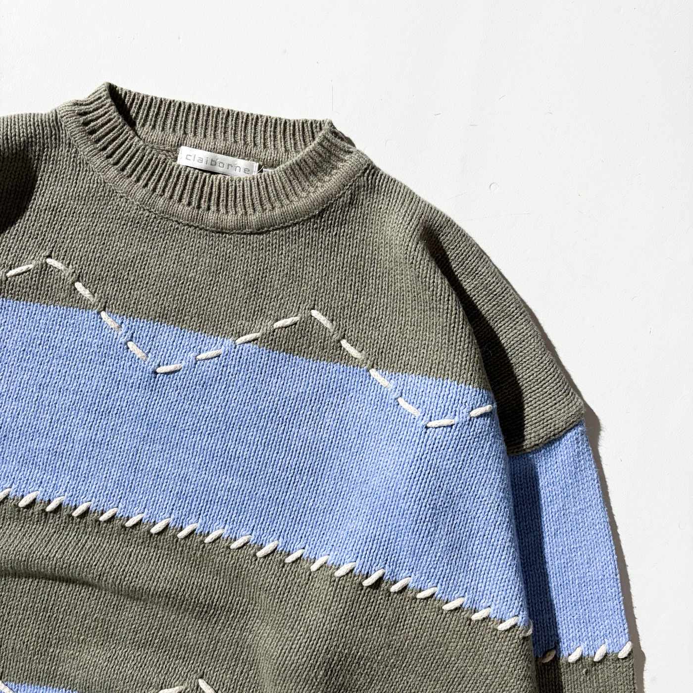 90's~ claiborne コットン 太ボーダー ハンドステッチ ニット セーター(サックス×カーキ)