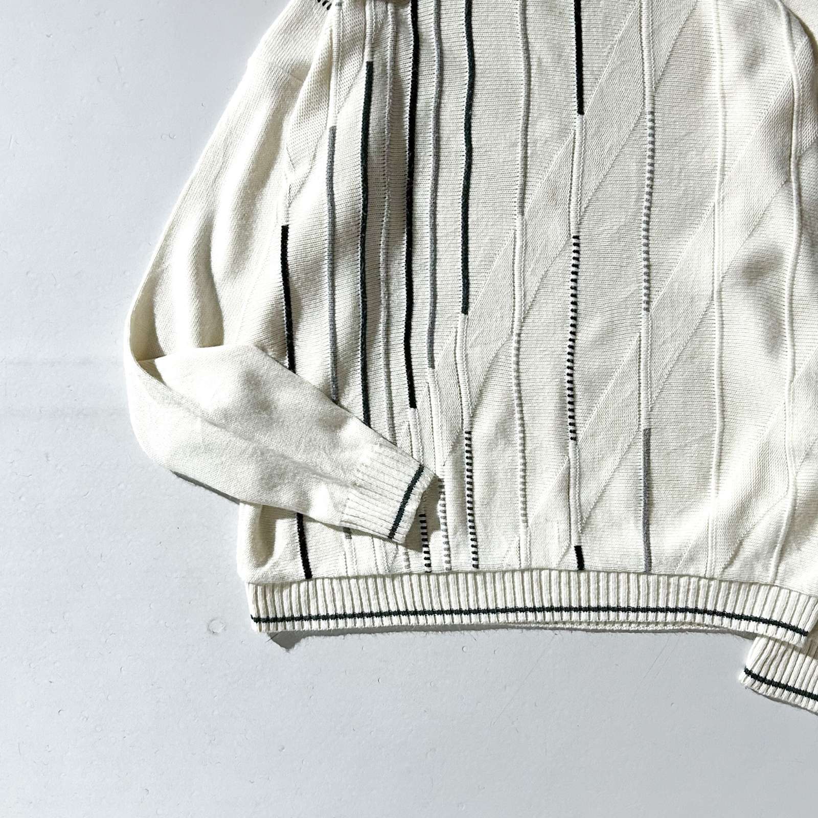 幾何学模様や3Dのニットセーターでよく見るこちらのブランド「protege(プラテージ)」アメリカ製なのも古着好きにはちょっと嬉しい。 全面総柄ではなく部分的にデザインが施されているので、初めて総柄ニット着る人は特に着やすいデザイン。
