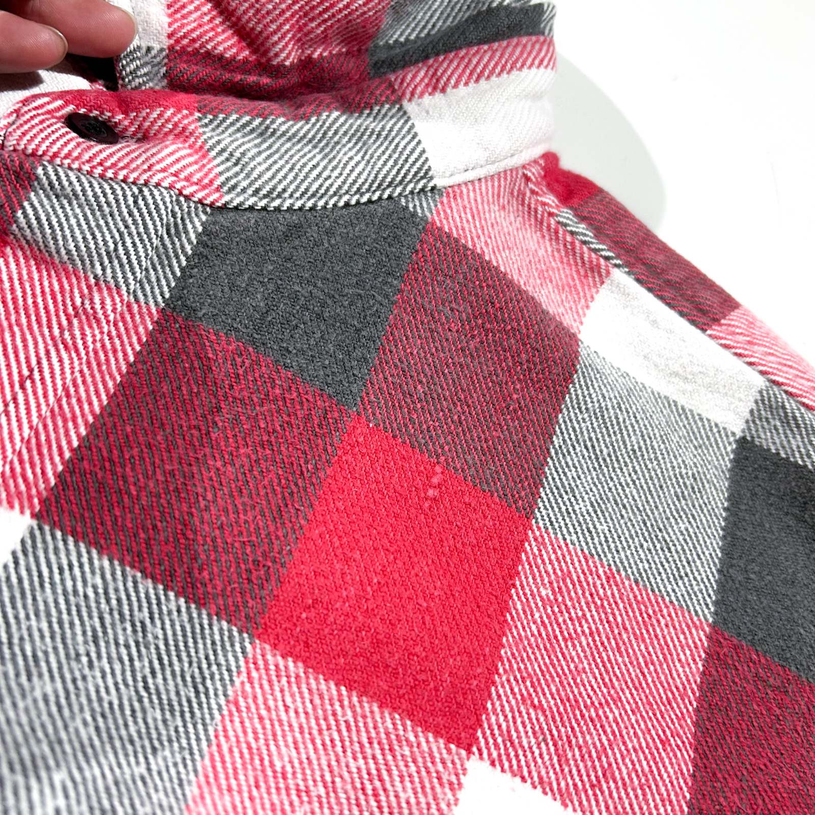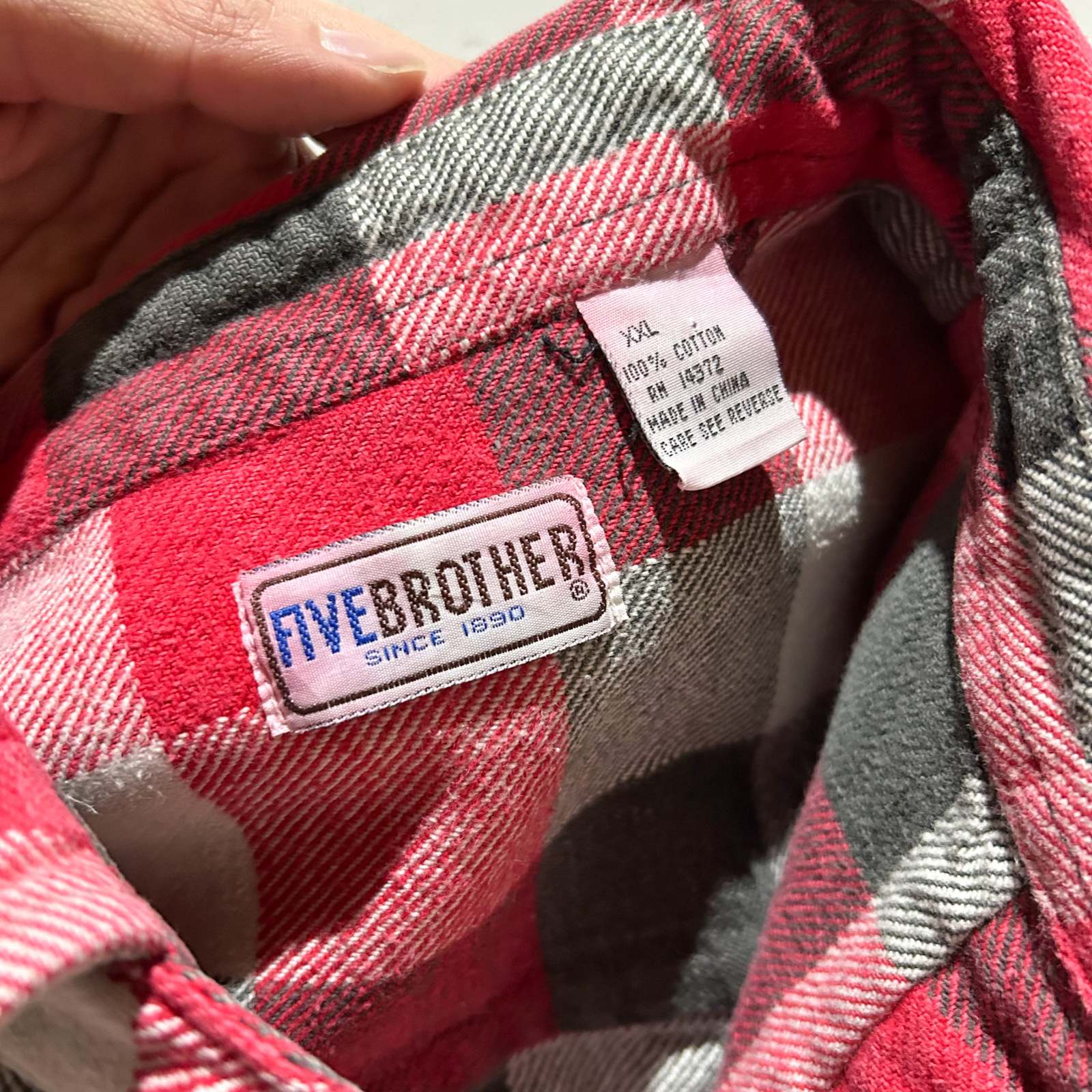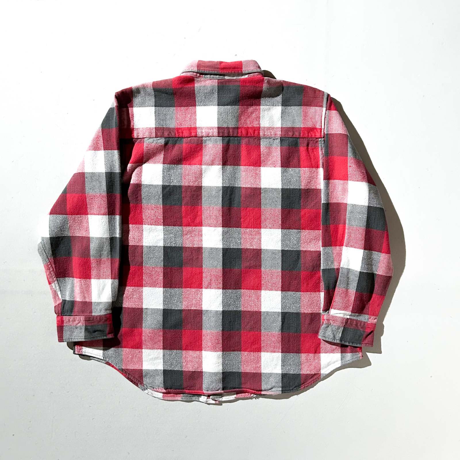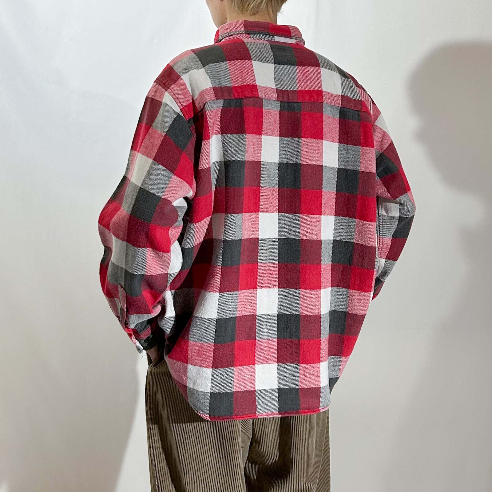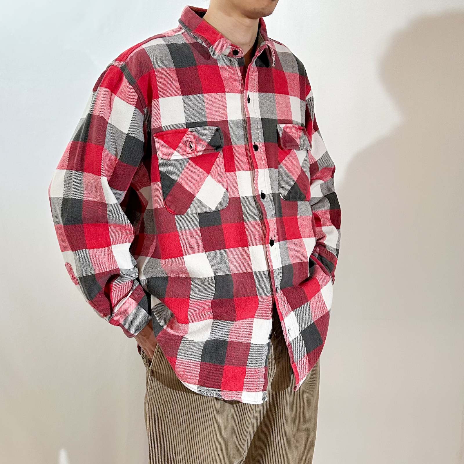 〈80’s FIVE BROTHER チェックネルシャツ〉。 今回のネルシャツ打ち出しの中でも、正直“バッファローチェックの次に売れ残りそう枠”です(笑)。赤×黒×白のブロックチェックという、誰もが一度は見たことあるど定番パターン。だからこそ玄人心をくすぐる1着でもあります。 ここ最近、“いなたいチェック”が少しずつ市民権を得てきてますが、この辺りの王道アメカジな香りが強い柄はまだまだ通好み。そういう古着の空気感が好きな方にはぜひおすすめしたいネルシャツです。 サイズ表記は2XLですが、着丈が短めのため実寸XLほどのバランス感。シャツジャケット感覚で羽織るのはもちろん、パーカーをインしてストリートに振っても良し。定番で終わらせたくない、味のあるグッドレギュラーです。