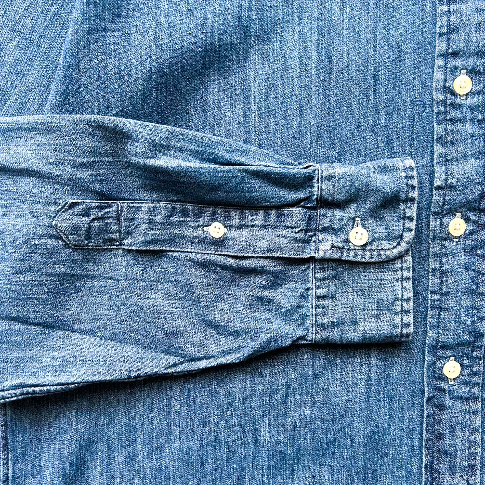 〈RALPH LAUREN〉らしい上品さとカジュアルさを併せ持つ、ボタンダウン仕様のデニムシャツ。 色味は2000年代らしい、やや黒みがかった深いインディゴブルー。王道のブルーデニムとは一味違う、渋さと都会感を備えた表情が魅力です。 身幅にはしっかりとゆとりがあり、リラックスしたシルエット。ボタンダウンのきちんと感を活かして、チノパンと合わせたトラッドなアメカジスタイルはもちろん、ナイロンパンツやバミューダパンツでハズして、現代的な都会派カジュアルとしても楽しめる一着です。 ラルフローレンならではのアメリカントラッドの精神を土台にしつつ、ストリートやモードの要素とも柔軟に組み合わせられる懐の深さ。1枚あると、コーディネートの幅をぐっと広げてくれます。