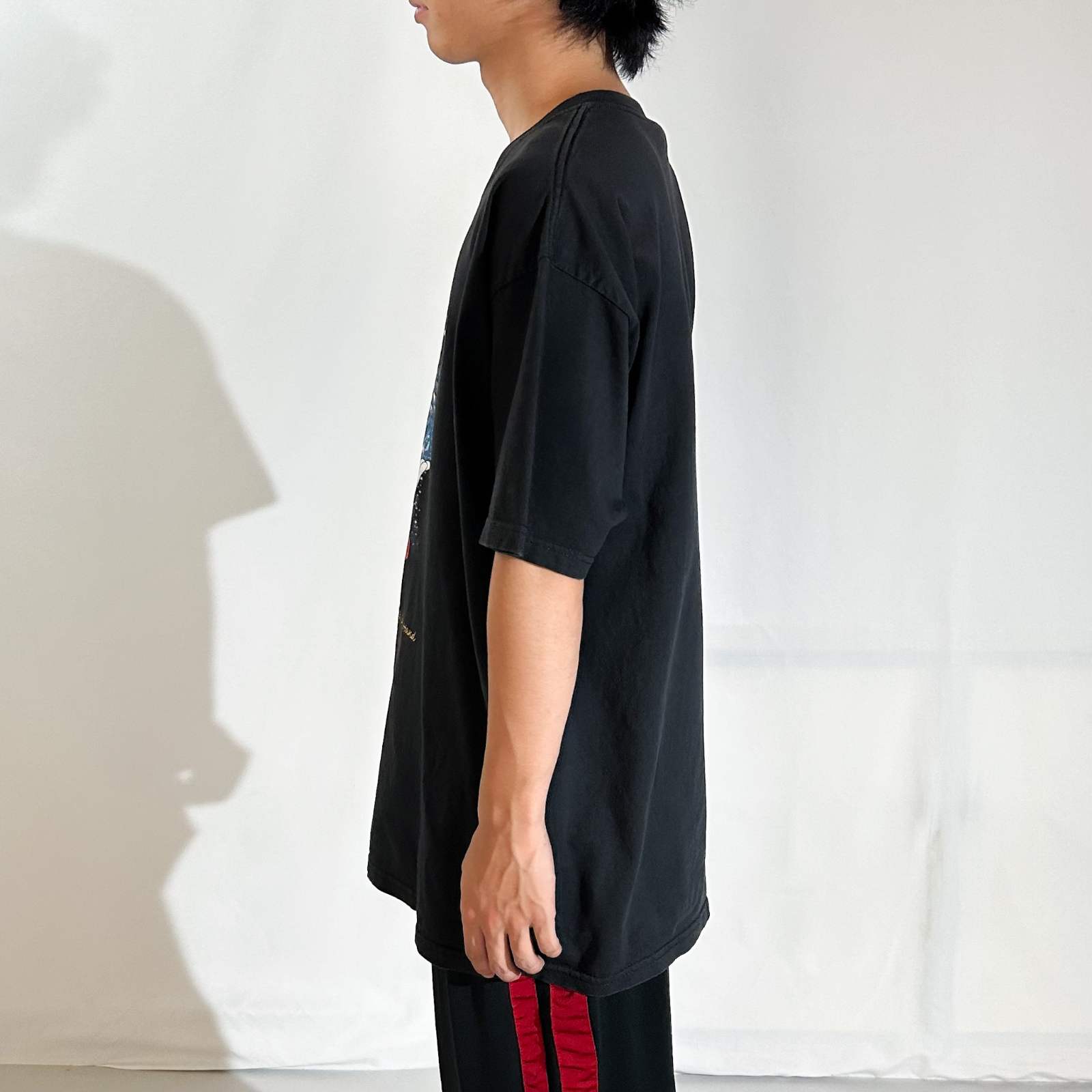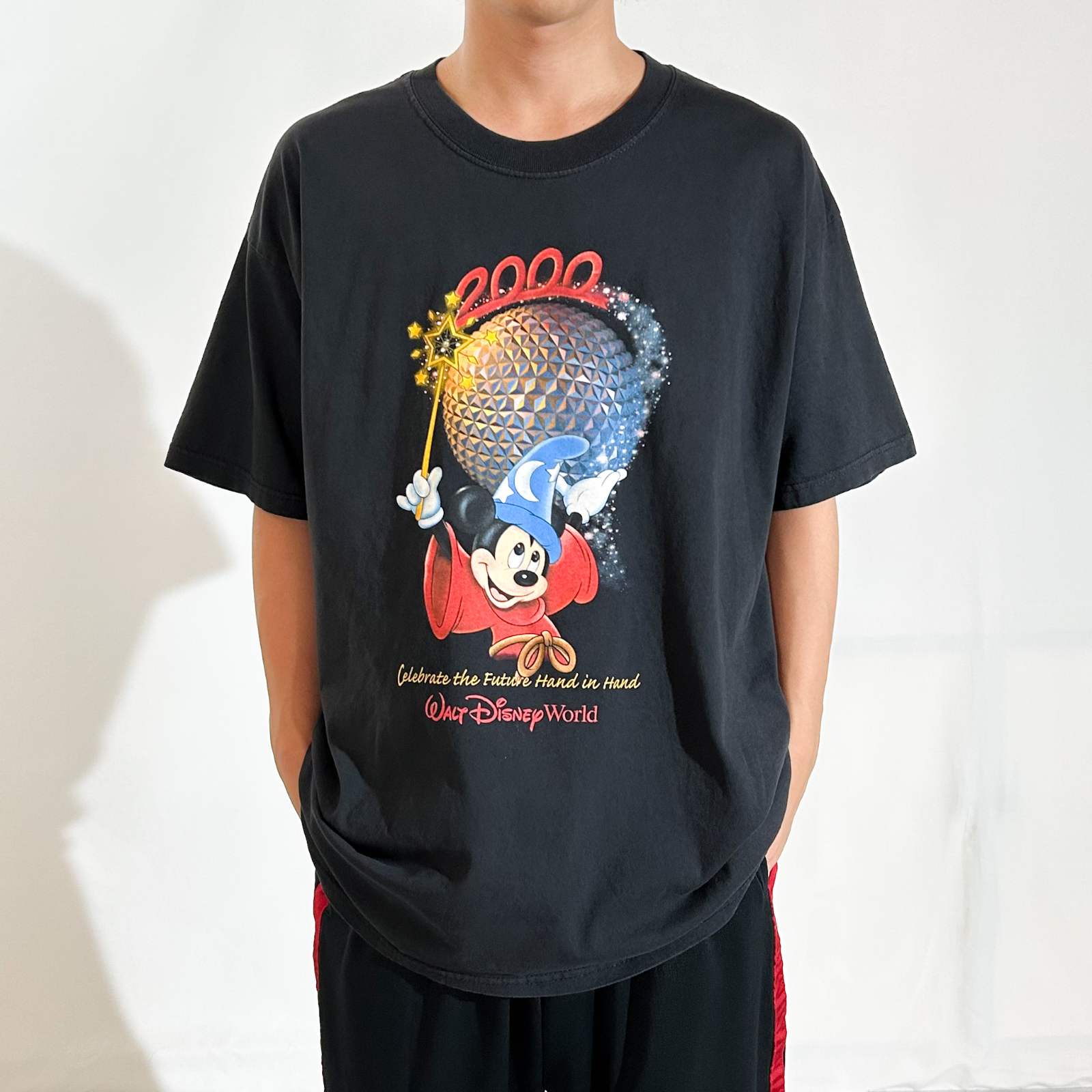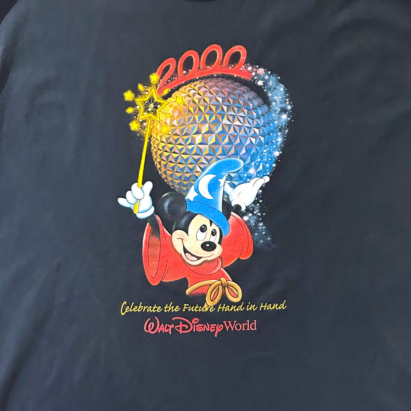 こちらのTシャツは、2000年のミレニアムセレブレーション時期にウォルト・ディズニーワールドで販売されていた記念Tシャツです。ファンタジアのソーサラーミッキーが杖を振って魔法をかけているポーズ、魔法の粉は写真では伝わりませんがラメ仕様になっていてキラキラ光ってます。