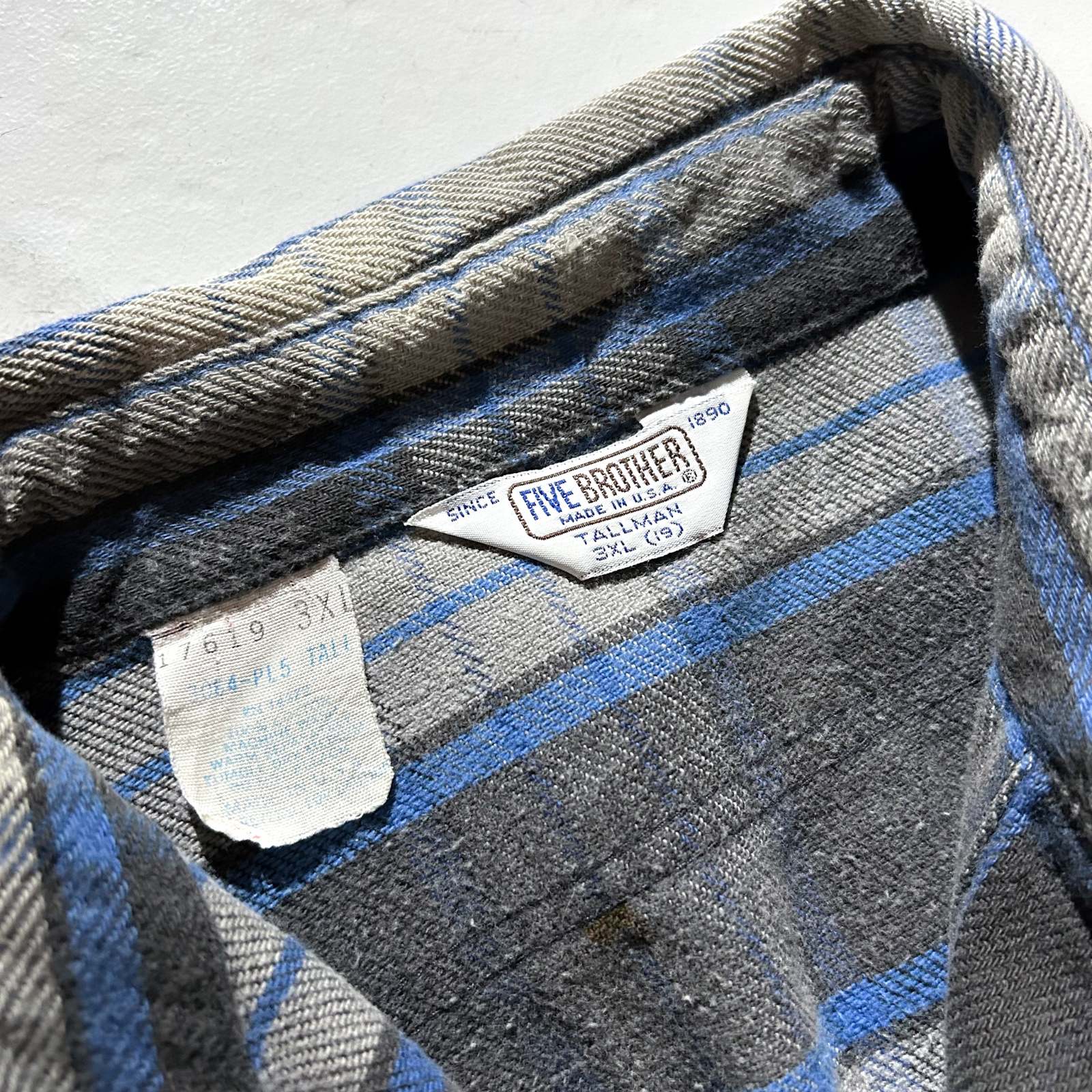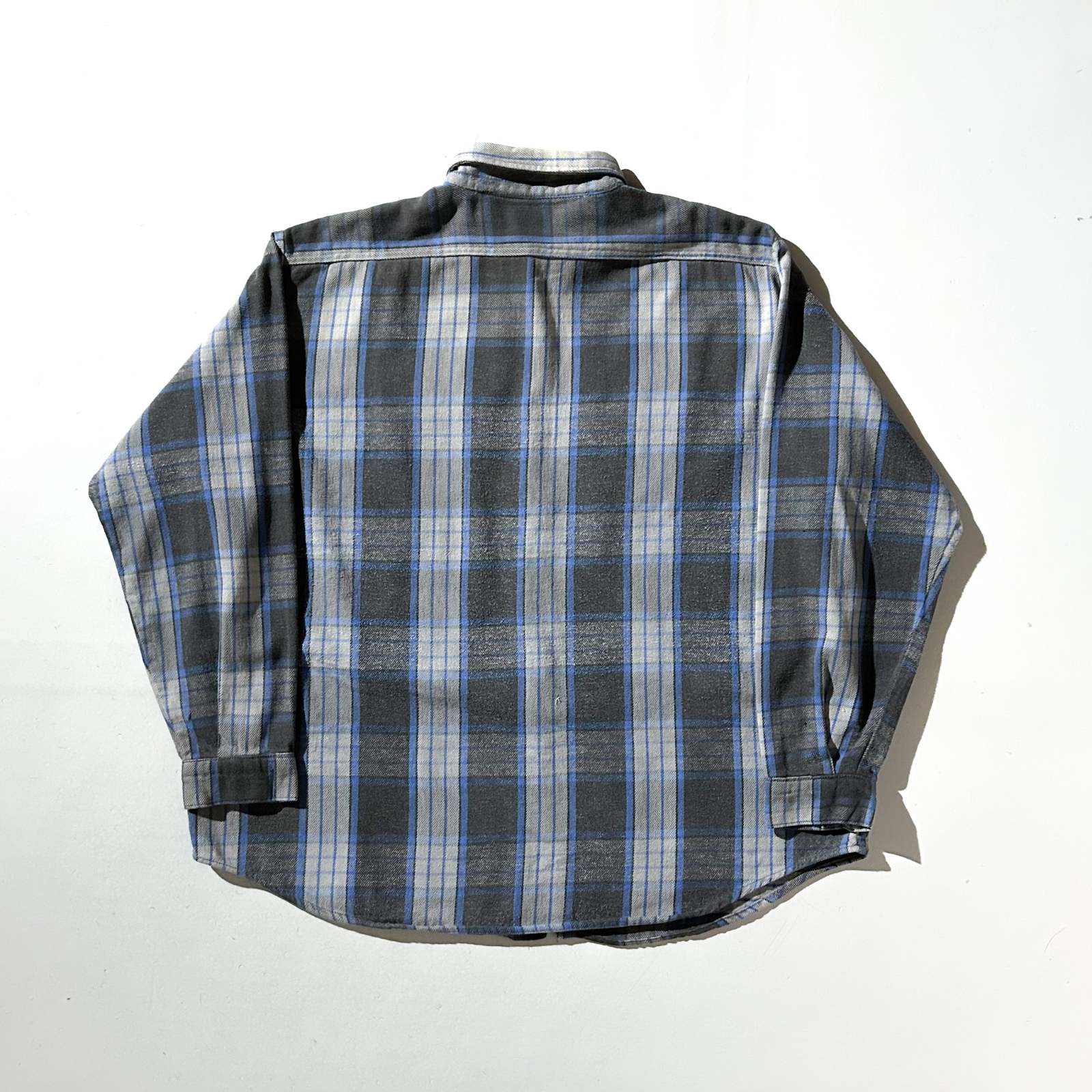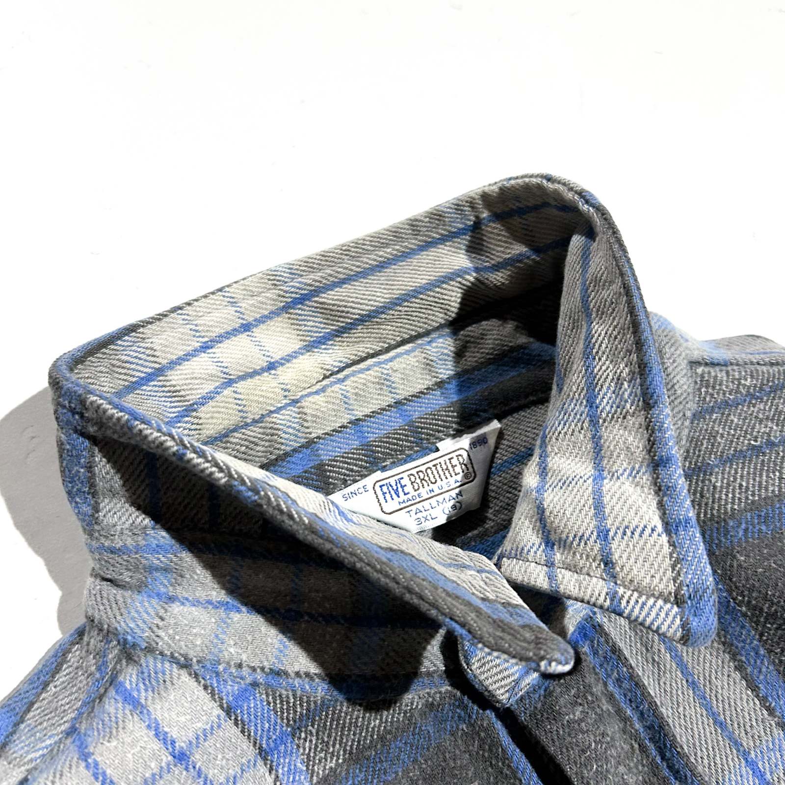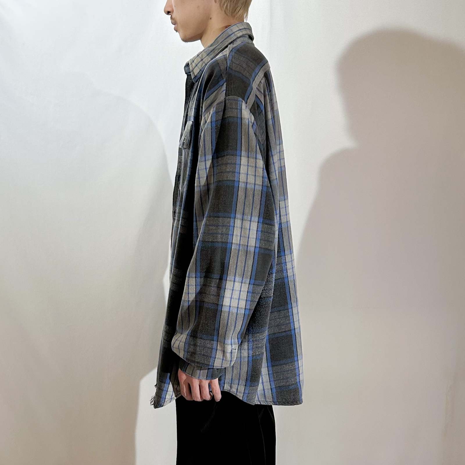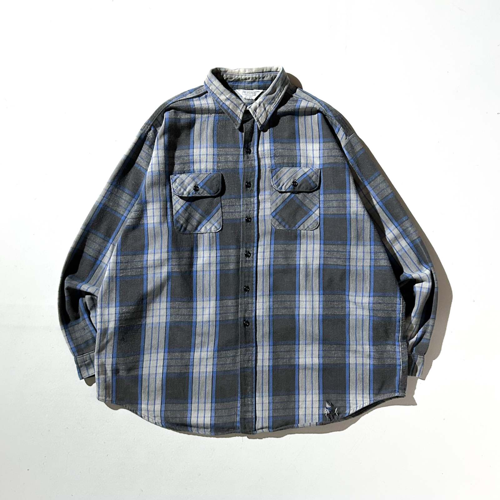 〈80’s FIVE BROTHER チェックネルシャツ〉。 ネルシャツ界の二大巨頭といえば〈FIVE BROTHER〉と〈BIG MAC〉。その中でも80年代の“青タグ”が付くファイブラは、古着好きにとって安心と信頼の証です。 嬉しいアメリカ製で、青×黒×グレーという完璧な配色。いなたさを残しながらも、どこか洗練された印象を持つカラーリングで、ネルシャツ初心者にもおすすめしやすい1枚。 サイズ表記は3XLですが、実際はバランスの取れたゆったりシルエット。身幅が広く着丈はその割に短めなので、ラルフローレンの“ビッグオックスフォード”のようなシルエット感です。 シャツジャケット感覚でスウェットパーカーを中に仕込めば、西海岸ライクなストリートスタイルに。定番の中にもしっかり“今っぽさ”を感じられるグッドレギュラーです。