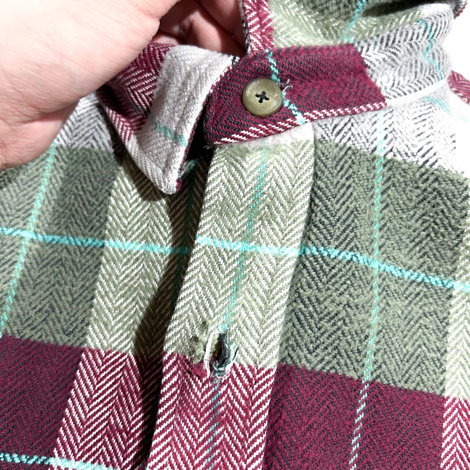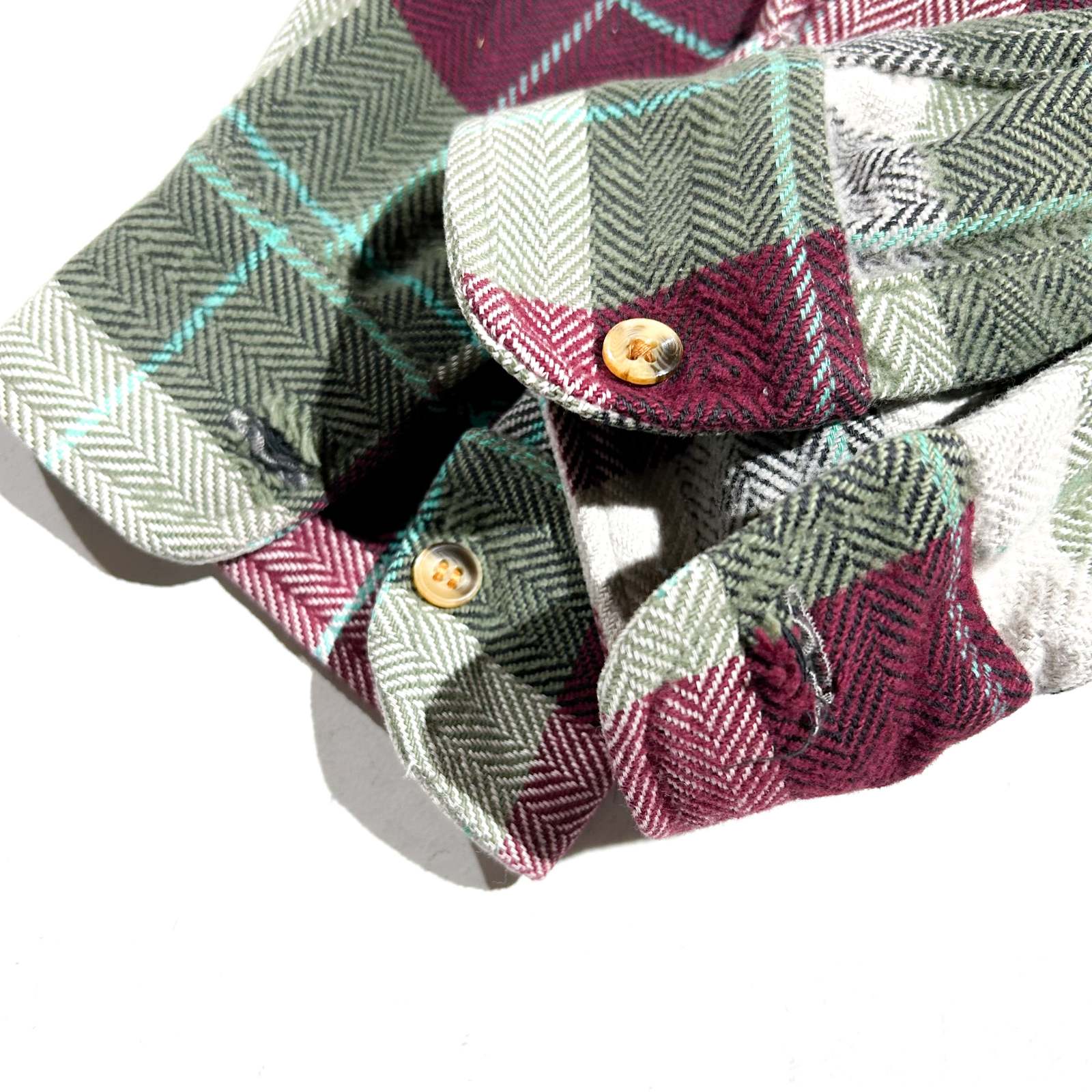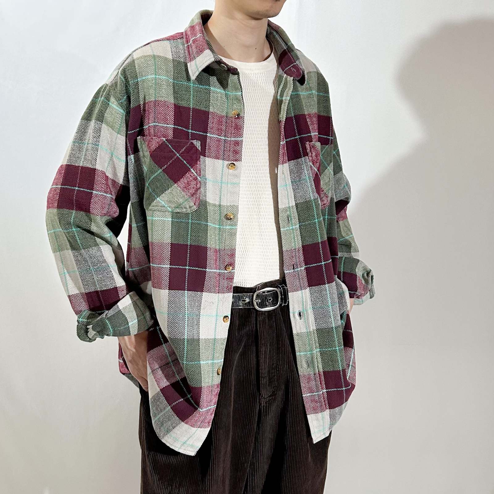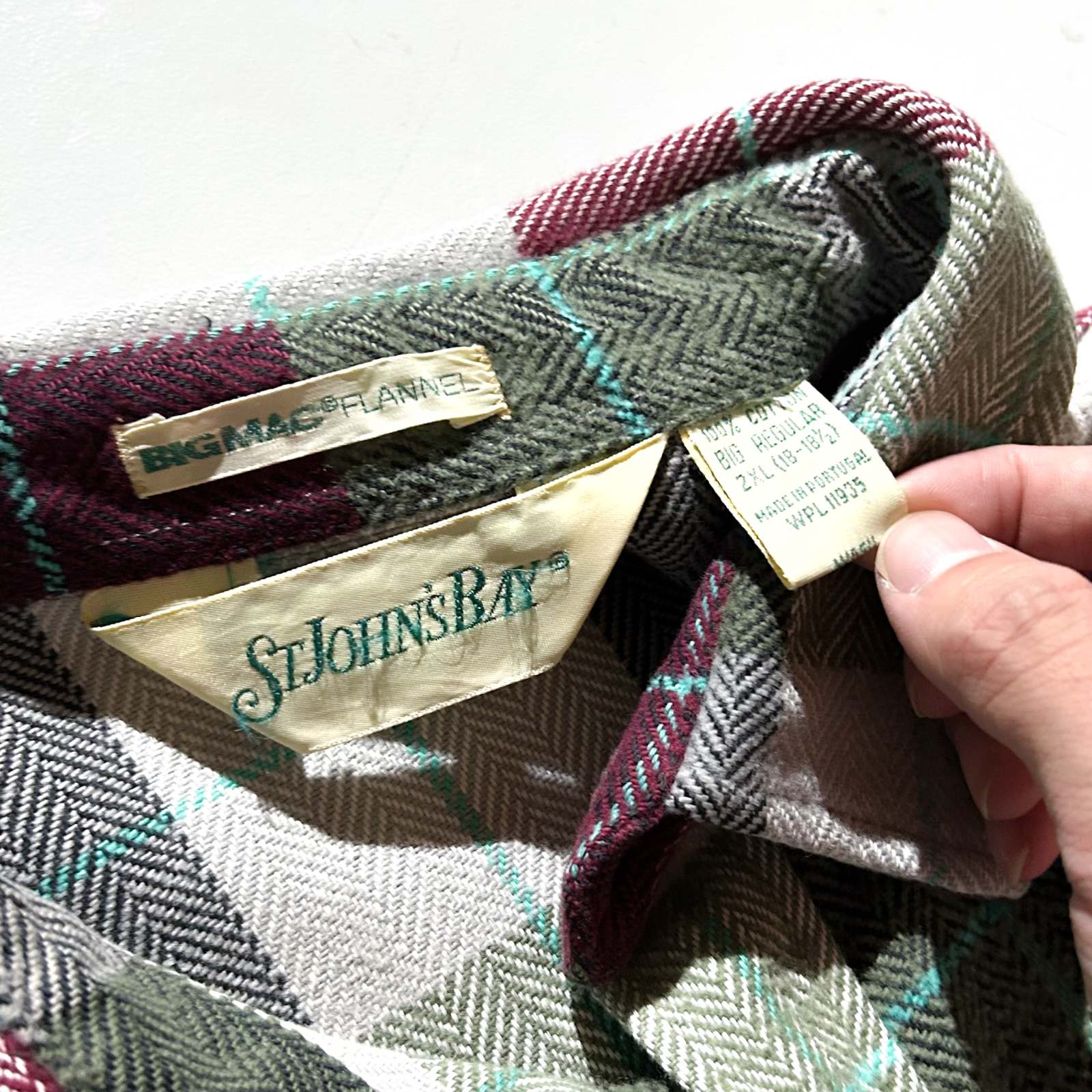 〈St. John’s Bay × BIG MAC ダブルネーム フランネルシャツ〉。 90年代、JC Penneyの2大プライベートブランドによるダブルネーム。タグを見るだけで古着好きならちょっと嬉しくなる一枚です。 生産国はテキスタイル国として評価の高いポルトガル製。90年代のポルトガル製アイテムは生地感・縫製ともに安定しており、今見てもクオリティの高さを感じます。 配色はグリーン×バーガンディの秋カラーコンビで汎用性抜群。サイズ感はやや大きめですが、シャツジャケット感覚でスウェットパーカーを中に仕込んで着れば、西海岸っぽいストリートムードにも◎。