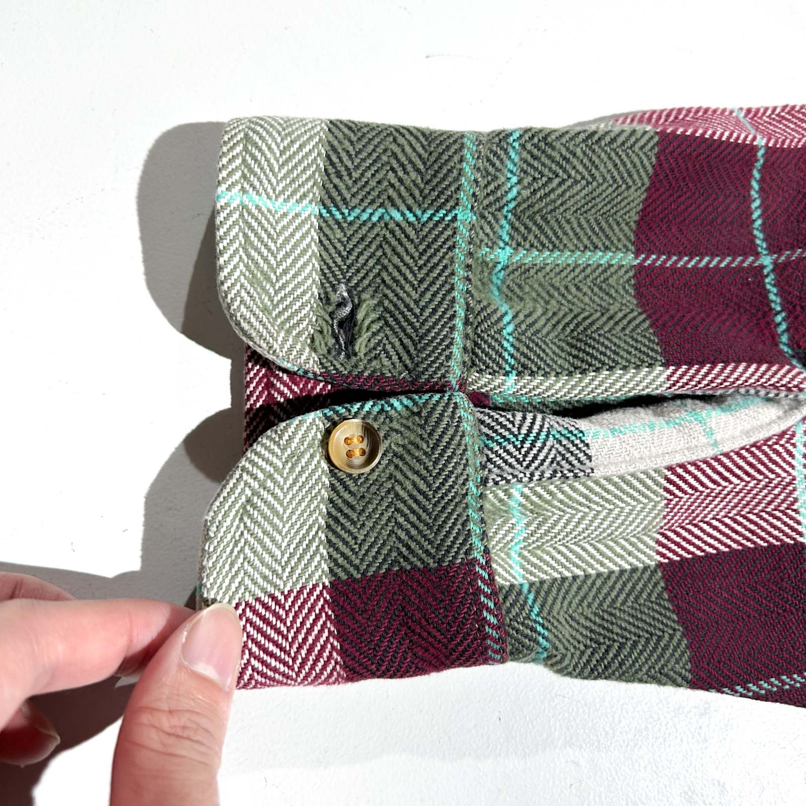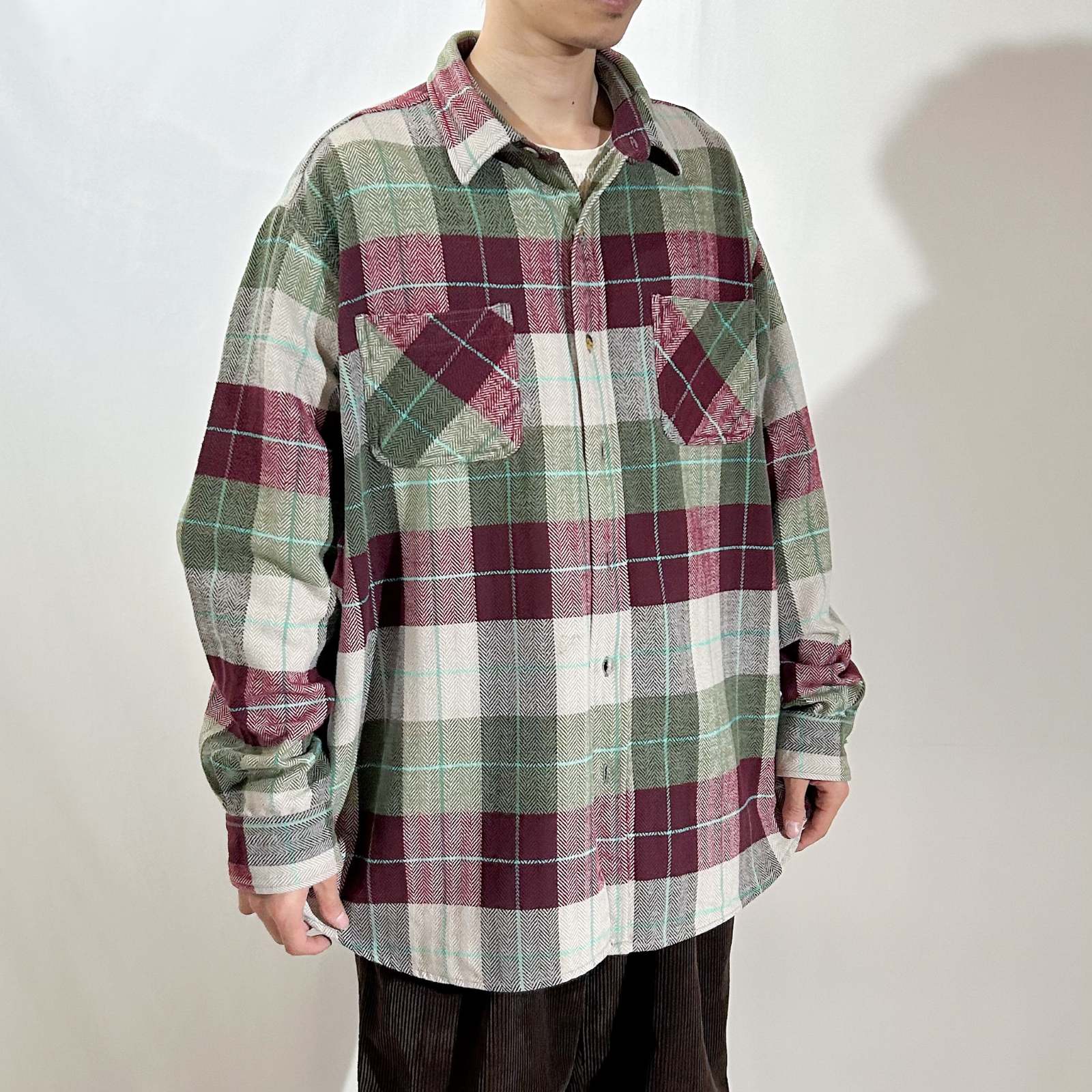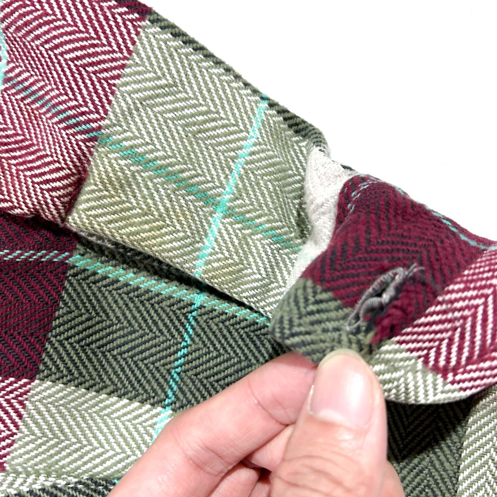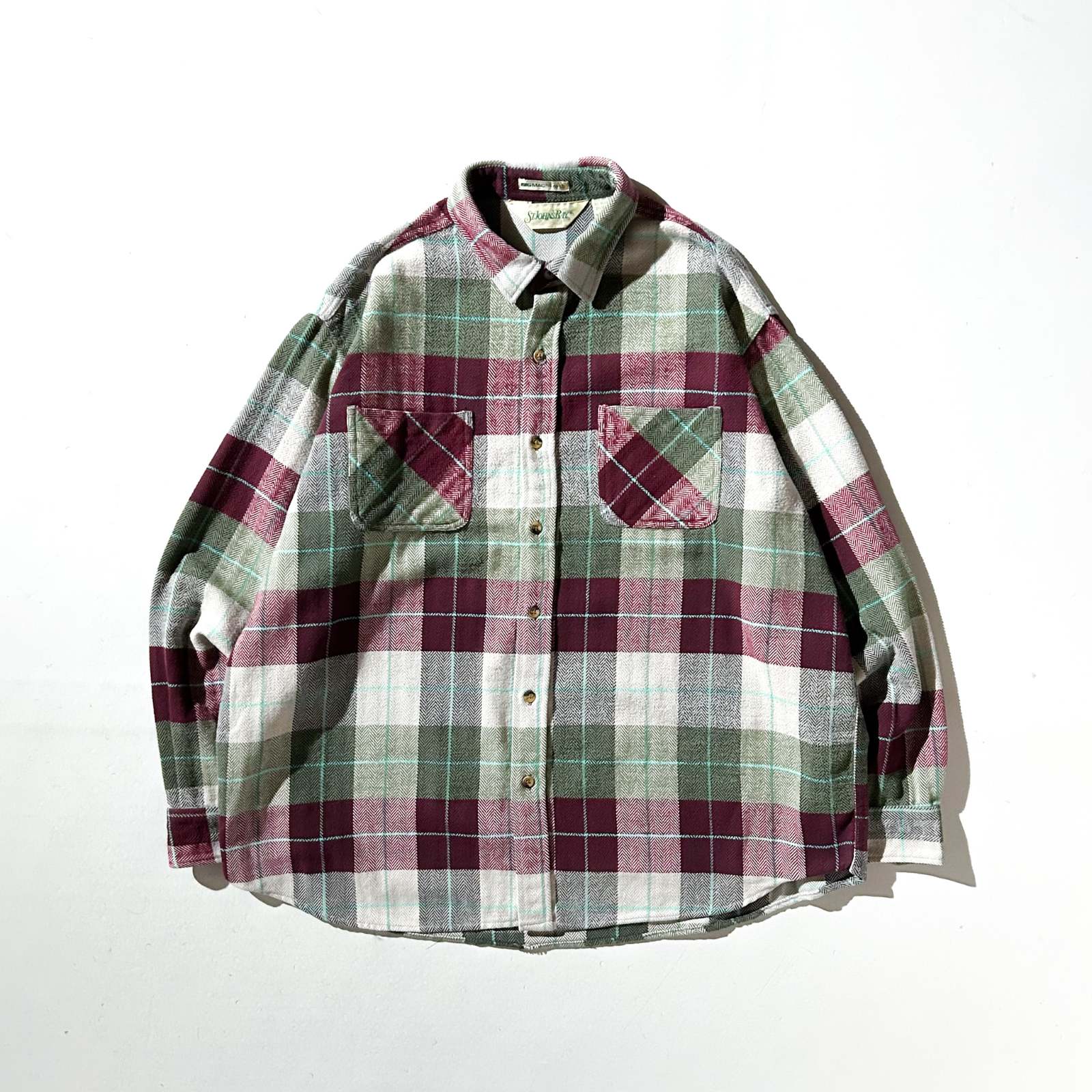 〈St. John’s Bay × BIG MAC ダブルネーム フランネルシャツ〉。 90年代、JC Penneyの2大プライベートブランドによるダブルネーム。タグを見るだけで古着好きならちょっと嬉しくなる一枚です。 生産国はテキスタイル国として評価の高いポルトガル製。90年代のポルトガル製アイテムは生地感・縫製ともに安定しており、今見てもクオリティの高さを感じます。 配色はグリーン×バーガンディの秋カラーコンビで汎用性抜群。サイズ感はやや大きめですが、シャツジャケット感覚でスウェットパーカーを中に仕込んで着れば、西海岸っぽいストリートムードにも◎。