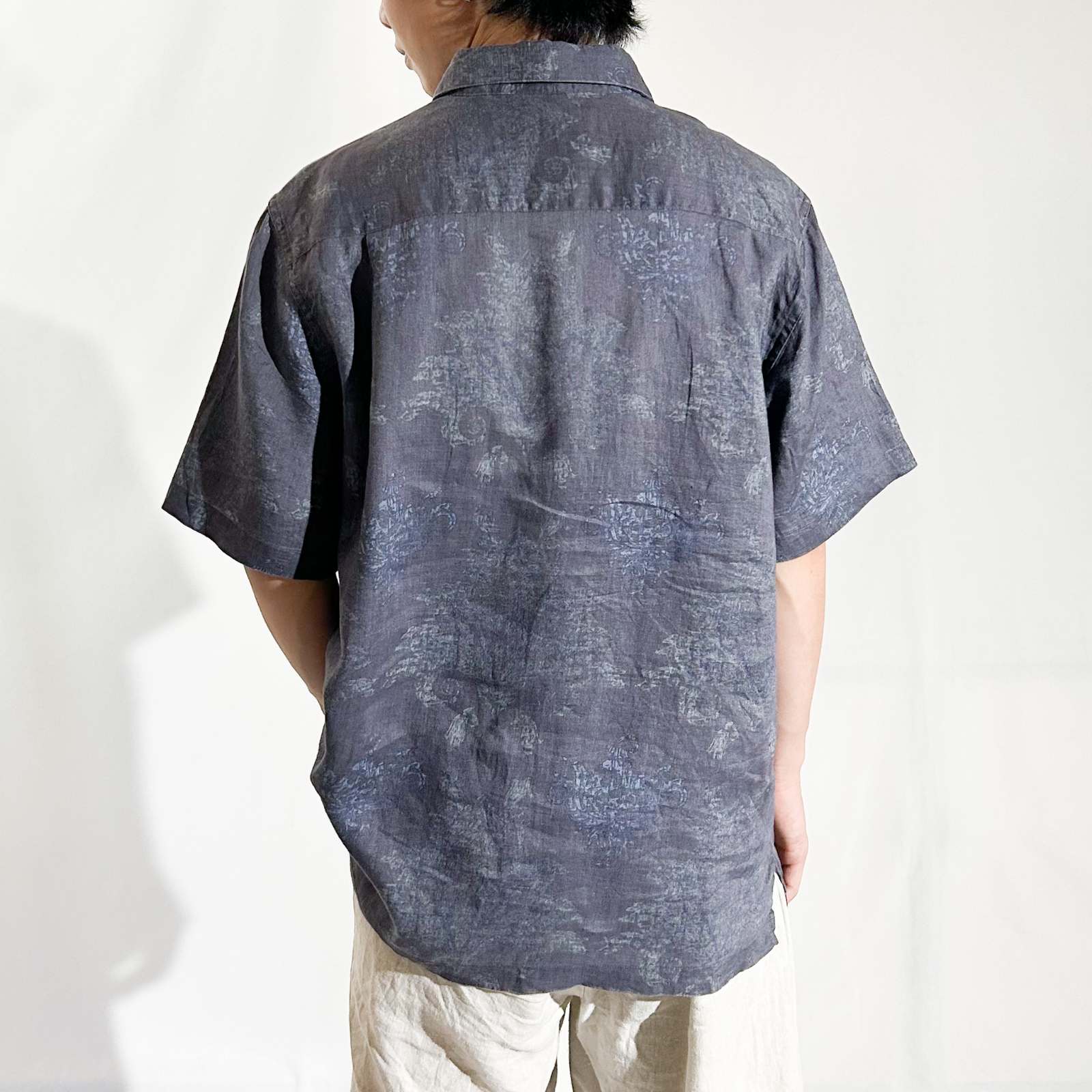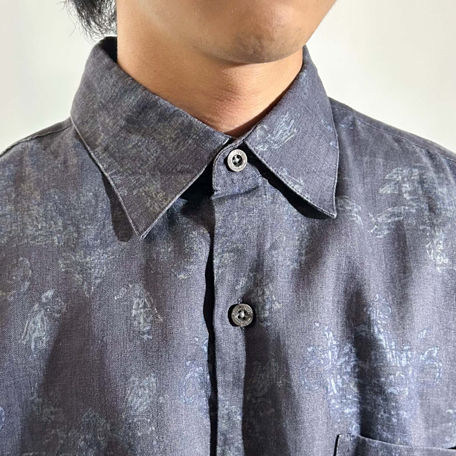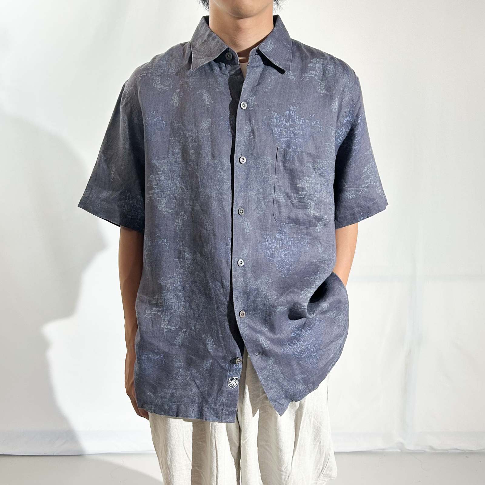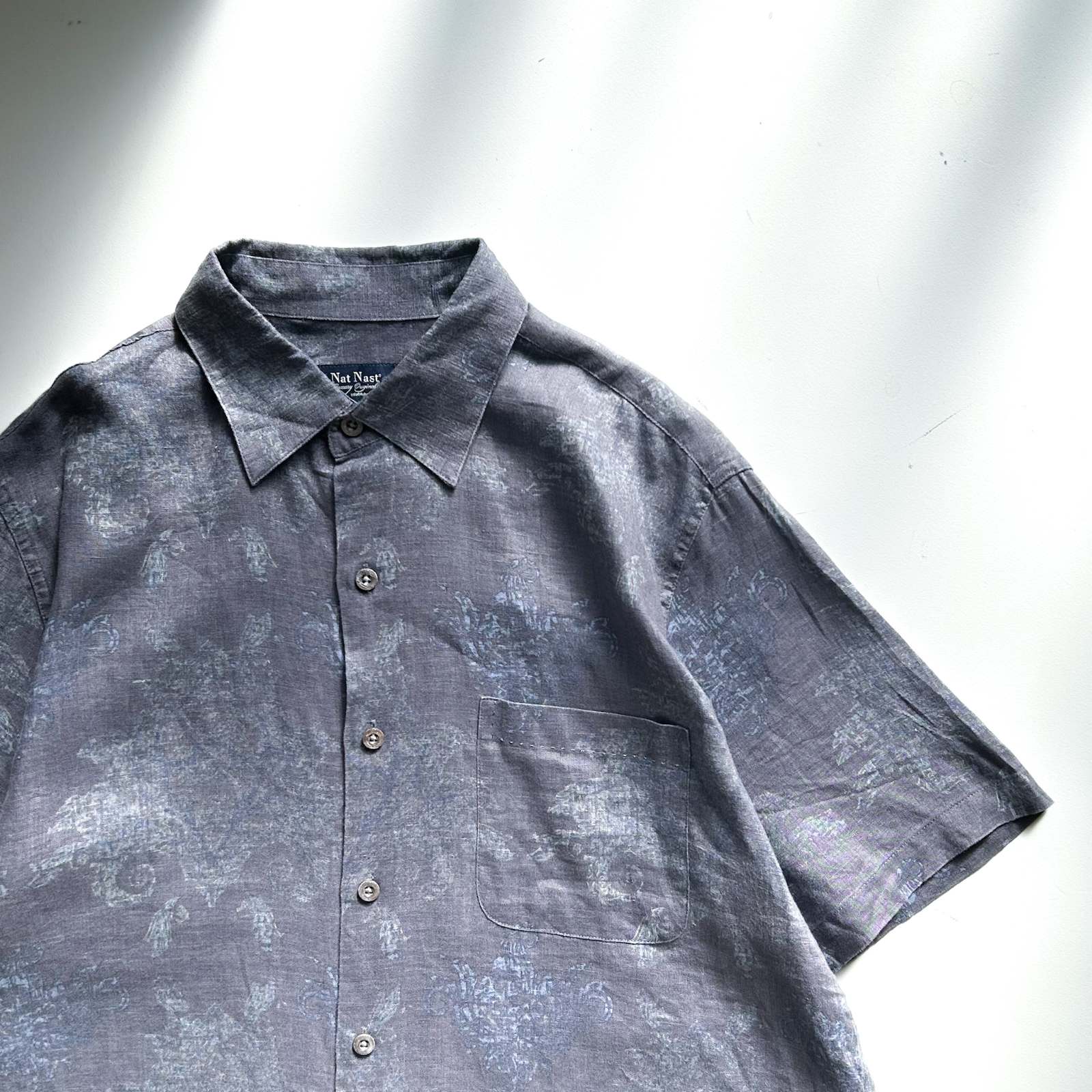 Nat Nast(ナットナスト)のリネンシャツ。 古着屋界隈でも**「実はめちゃくちゃ作りが良い」と話題に上がる隠れ名ブランド**です。 素材は贅沢にリネン100%。しっかりとしたハリ感のある生地感。柄はネイビーを基調としたタイダイ調の総柄。トーンが暗めなので派手になりすぎず、落ち着いた大人の雰囲気を演出できます。 ディテール面でもこだわりが詰まっていて、ボタンにはブランドロゴの刻印入りや、リネン素材を使っていながら更に通気性を良くする脇下ベンチレーション付き。この手の込みようが、古着屋や服好きの間で注目される理由のひとつです。 シルエットはレギュラーカラー✖️ボックスカットで、カジュアルながらどこかクリーンな印象。