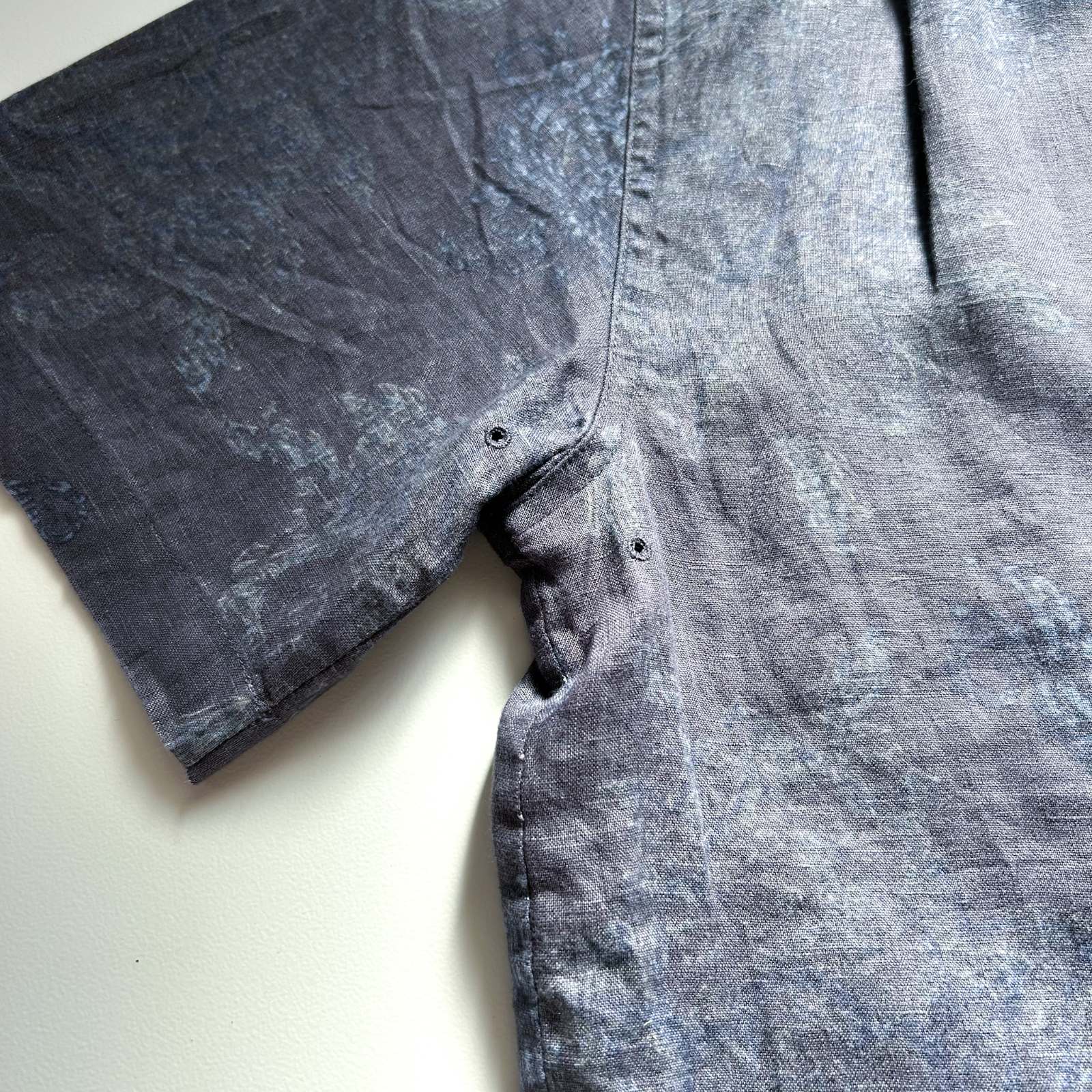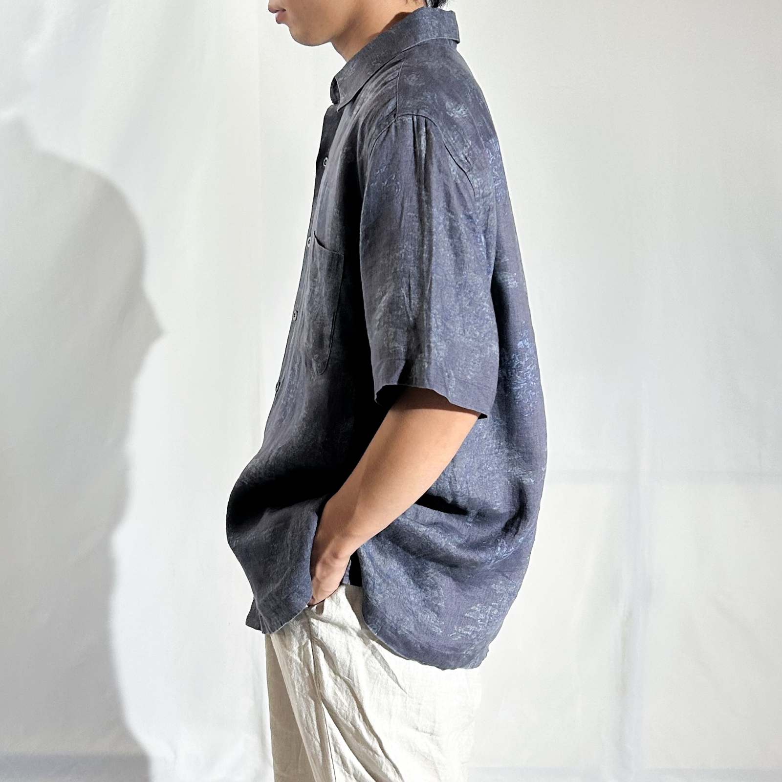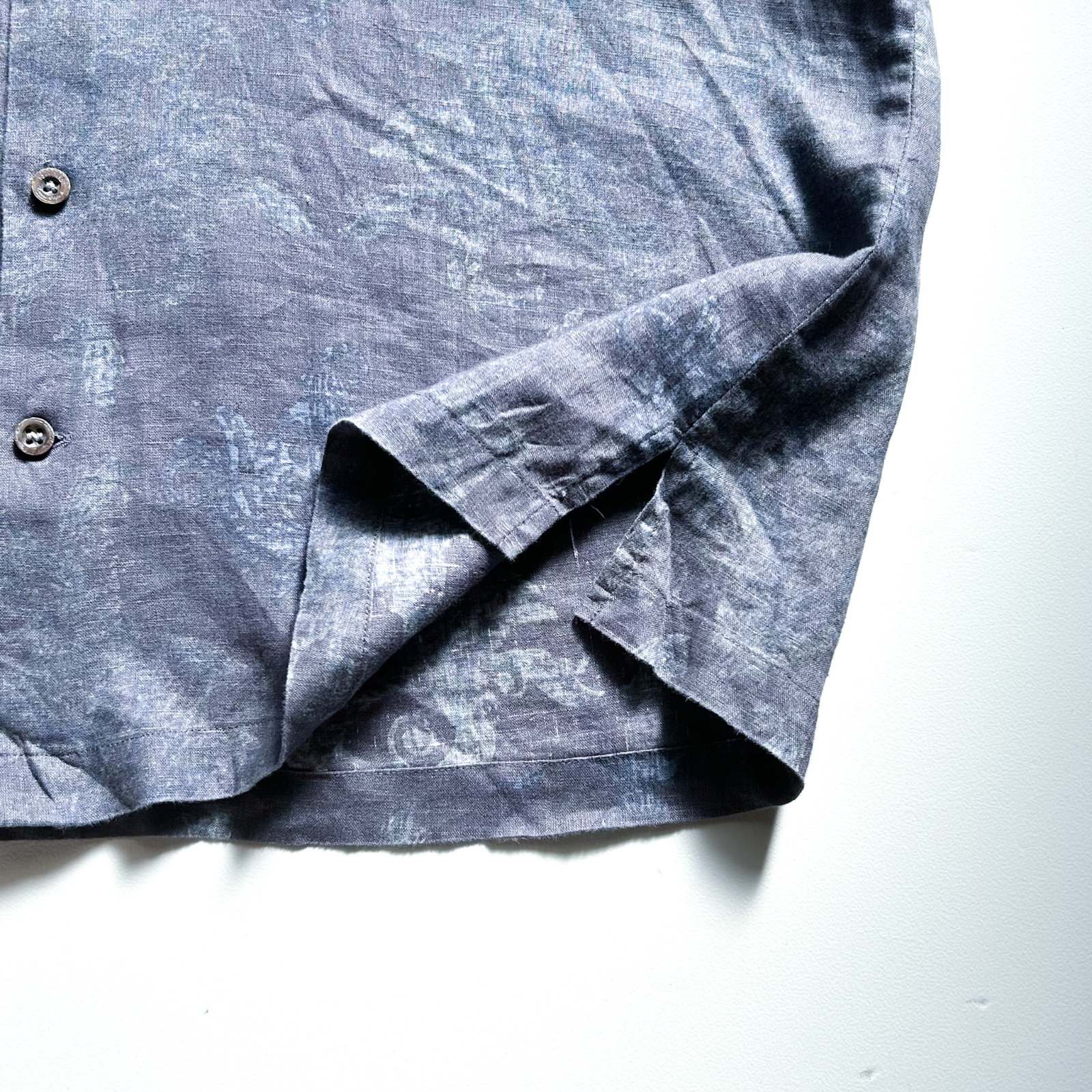 Nat Nast(ナットナスト)のリネンシャツ。 古着屋界隈でも**「実はめちゃくちゃ作りが良い」と話題に上がる隠れ名ブランド**です。 素材は贅沢にリネン100%。しっかりとしたハリ感のある生地感。柄はネイビーを基調としたタイダイ調の総柄。トーンが暗めなので派手になりすぎず、落ち着いた大人の雰囲気を演出できます。 ディテール面でもこだわりが詰まっていて、ボタンにはブランドロゴの刻印入りや、リネン素材を使っていながら更に通気性を良くする脇下ベンチレーション付き。この手の込みようが、古着屋や服好きの間で注目される理由のひとつです。 シルエットはレギュラーカラー✖️ボックスカットで、カジュアルながらどこかクリーンな印象。