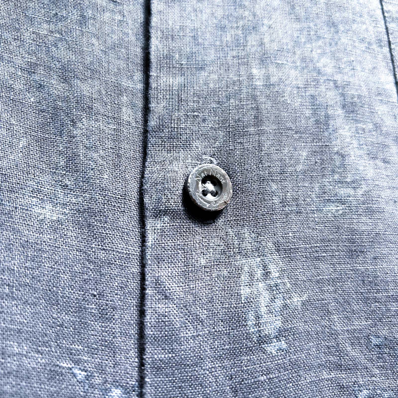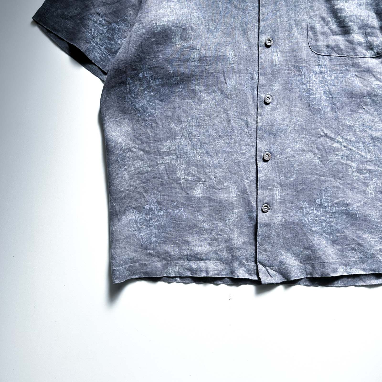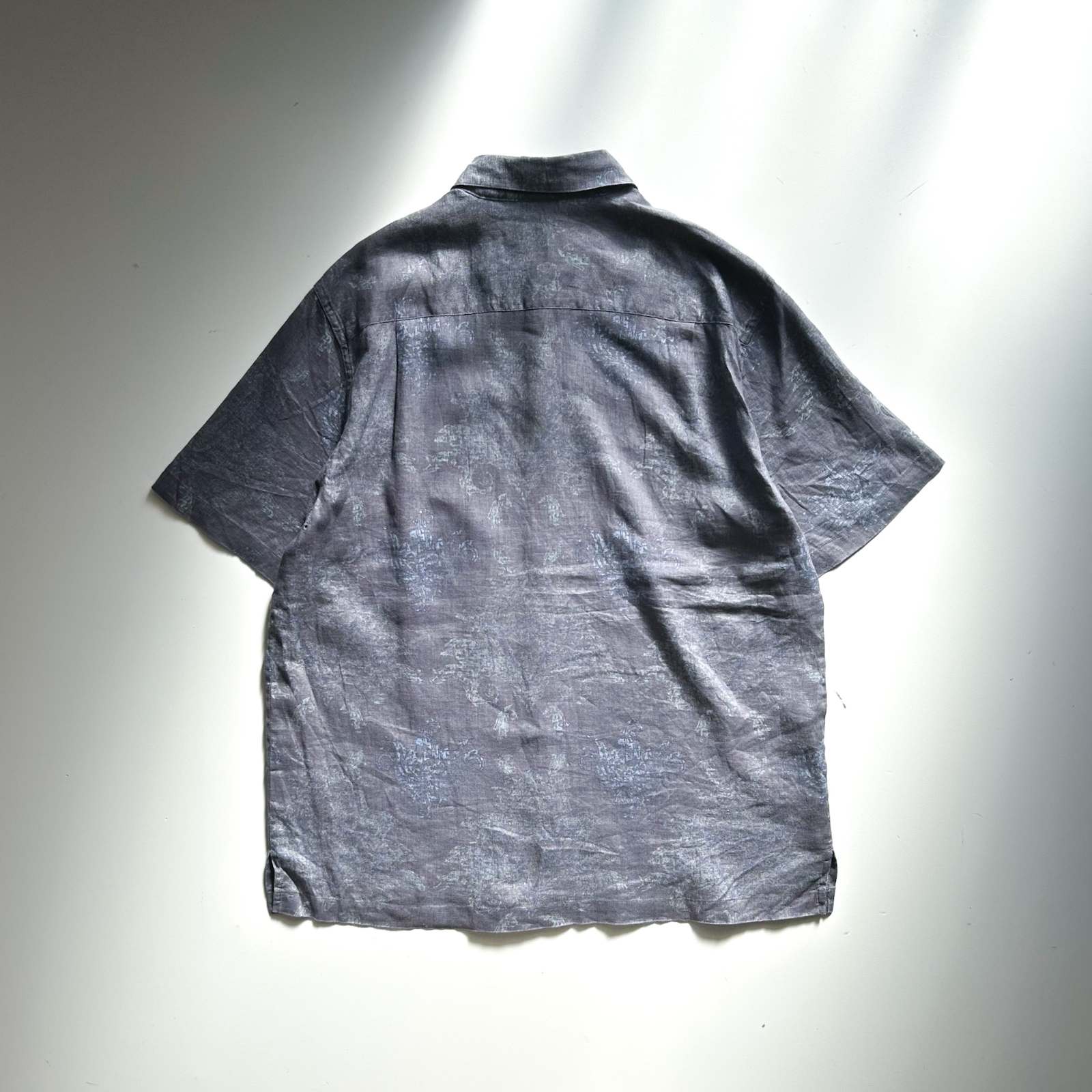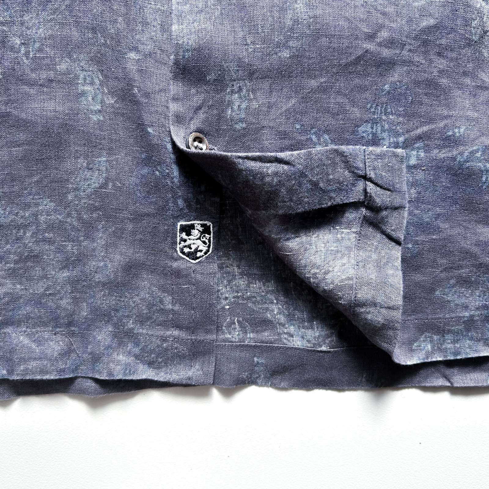 Nat Nast(ナットナスト)のリネンシャツ。 古着屋界隈でも**「実はめちゃくちゃ作りが良い」と話題に上がる隠れ名ブランド**です。 素材は贅沢にリネン100%。しっかりとしたハリ感のある生地感。柄はネイビーを基調としたタイダイ調の総柄。トーンが暗めなので派手になりすぎず、落ち着いた大人の雰囲気を演出できます。 ディテール面でもこだわりが詰まっていて、ボタンにはブランドロゴの刻印入りや、リネン素材を使っていながら更に通気性を良くする脇下ベンチレーション付き。この手の込みようが、古着屋や服好きの間で注目される理由のひとつです。 シルエットはレギュラーカラー✖️ボックスカットで、カジュアルながらどこかクリーンな印象。