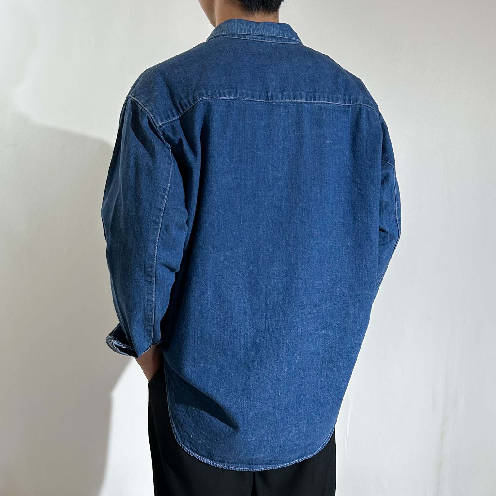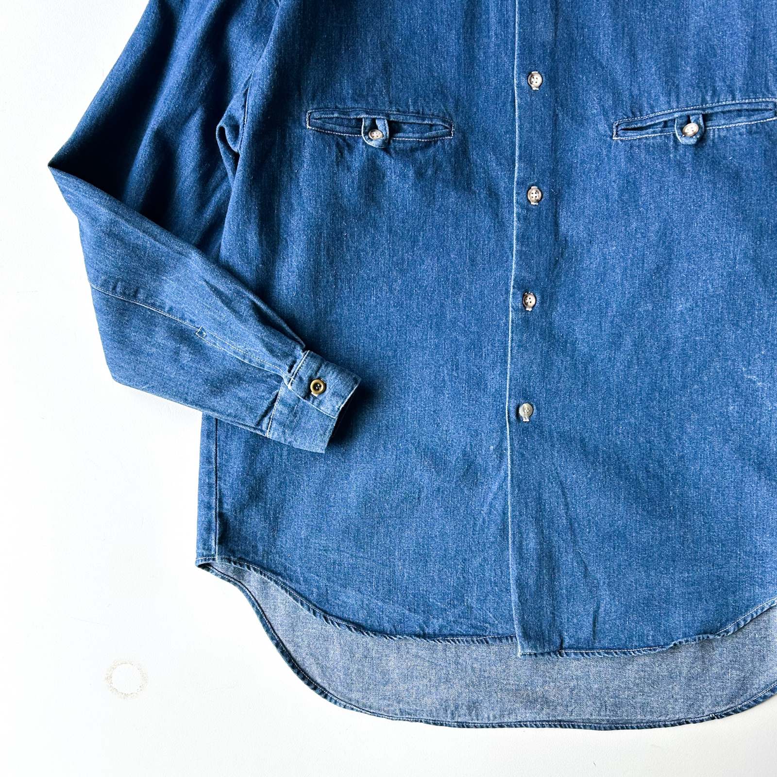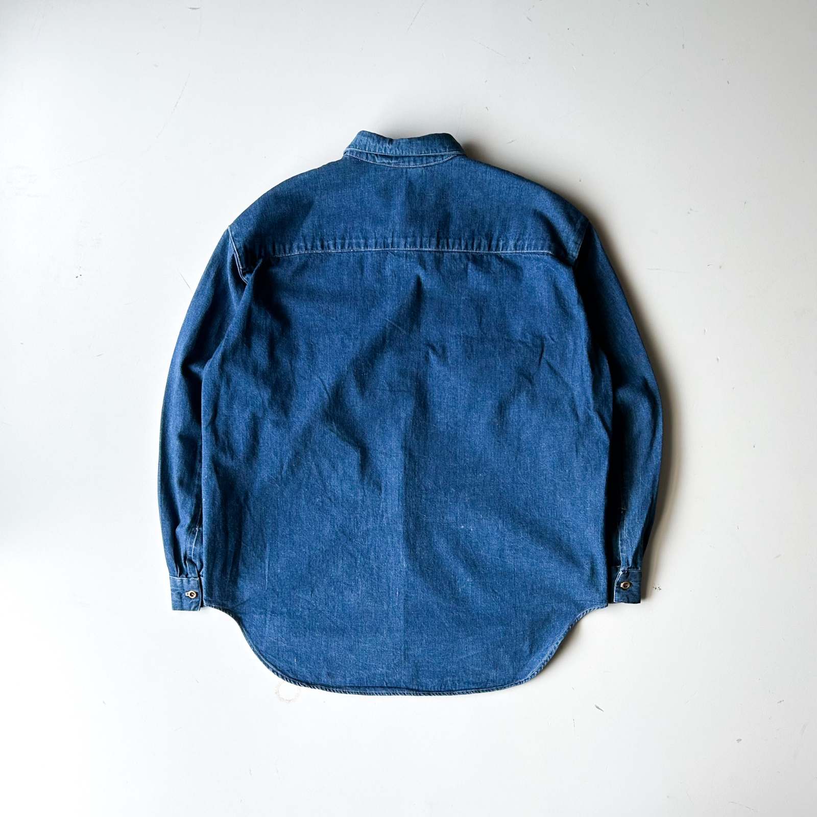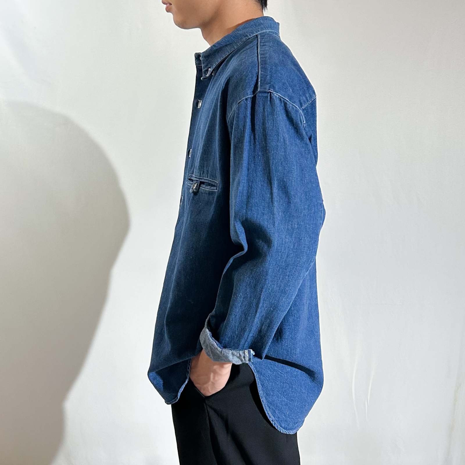 ちょっとひねりの効いたデザインシャツ。 一見シンプルながら、細部に個性が光るちょっと変わったデザインのシャツ。ポケットは一般的なパチポケではなく、スリッドポケット仕様に加えて、ストラップ留めのディテールが施されています。 色残りも9割以上&状態良好で、クリーンな印象がありながらも、細かなディテールがしっかりとアクセントに。 さらに、前身頃よりも後ろ身頃が長めにデザインされており、さりげない抜け感と立体感を演出。裾をアウトで着てもバランスが良く、きれいめなスタイリングにすっと馴染む一着です。個性派ながらも使いやすく、スタイルに深みを加えてくれるアイテム。