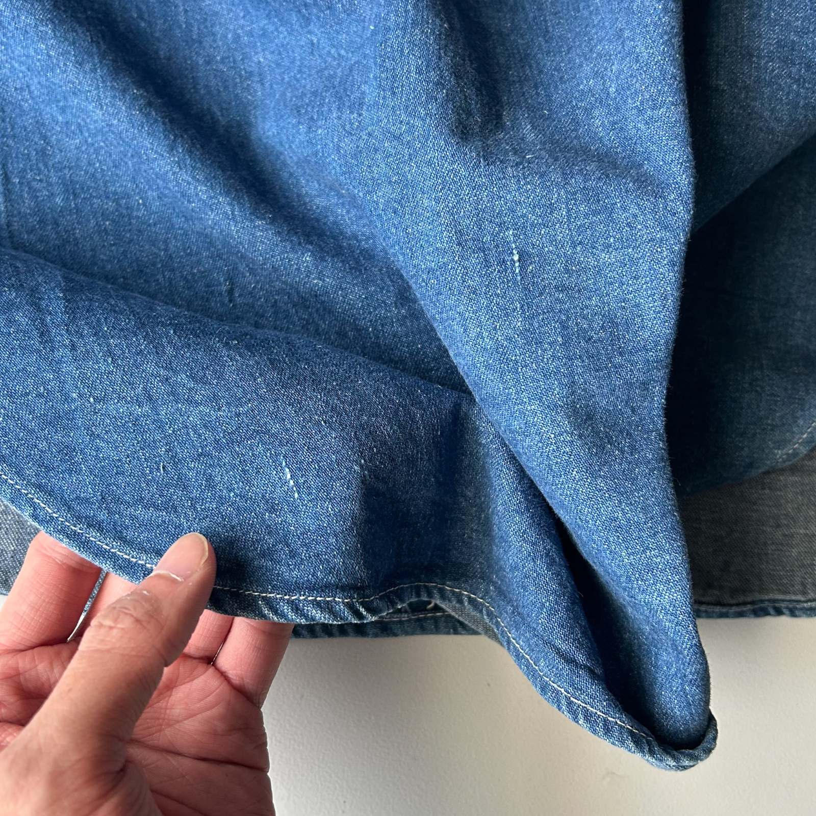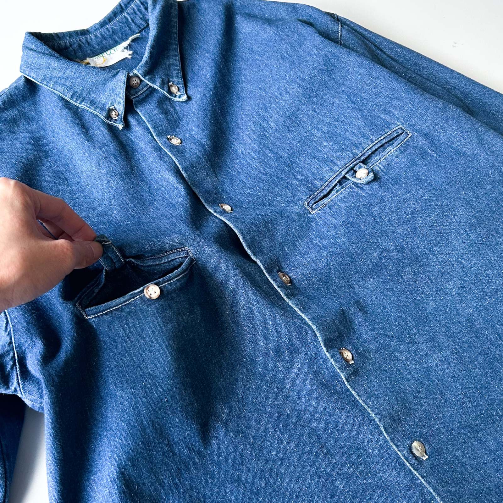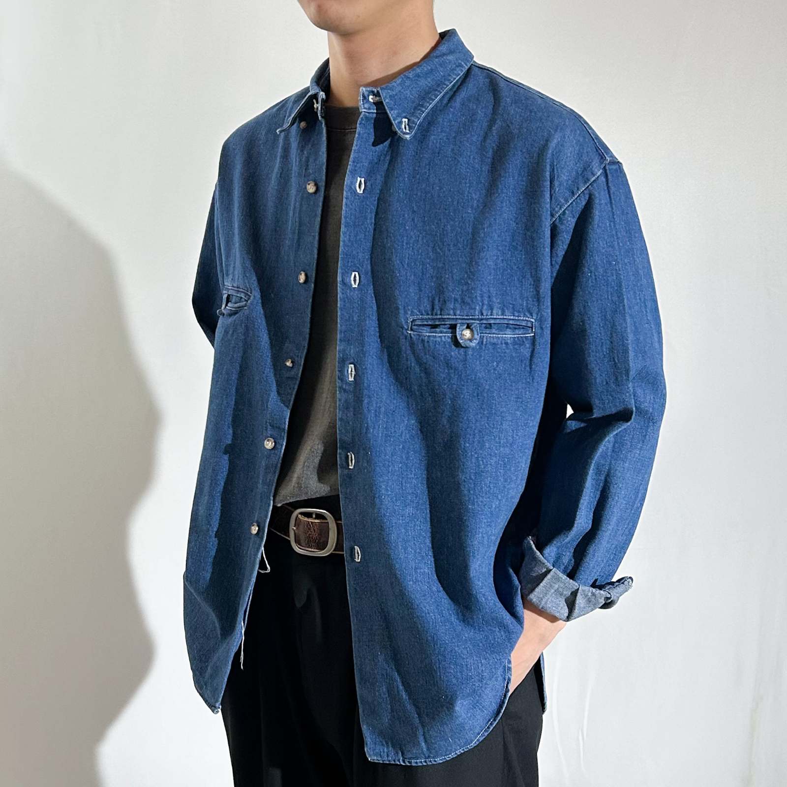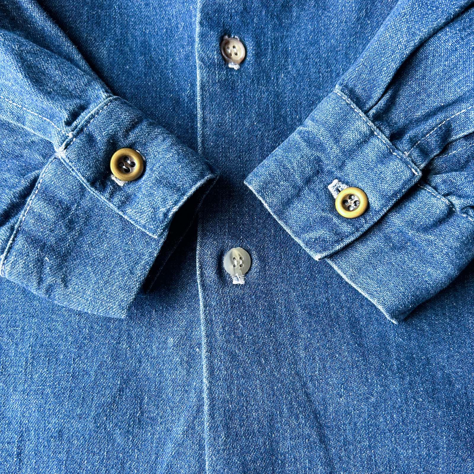 ちょっとひねりの効いたデザインシャツ。 一見シンプルながら、細部に個性が光るちょっと変わったデザインのシャツ。ポケットは一般的なパチポケではなく、スリッドポケット仕様に加えて、ストラップ留めのディテールが施されています。 色残りも9割以上&状態良好で、クリーンな印象がありながらも、細かなディテールがしっかりとアクセントに。 さらに、前身頃よりも後ろ身頃が長めにデザインされており、さりげない抜け感と立体感を演出。裾をアウトで着てもバランスが良く、きれいめなスタイリングにすっと馴染む一着です。個性派ながらも使いやすく、スタイルに深みを加えてくれるアイテム。