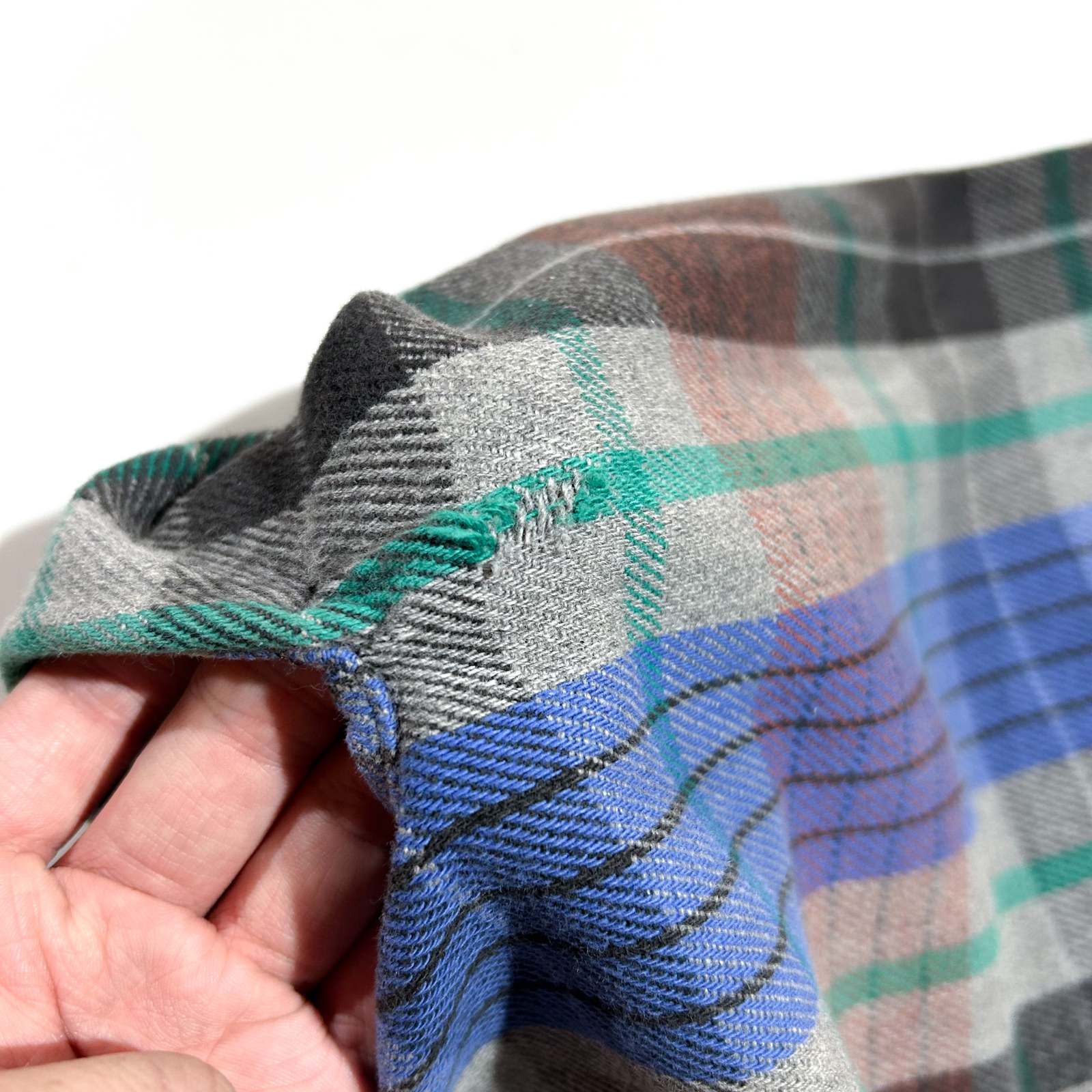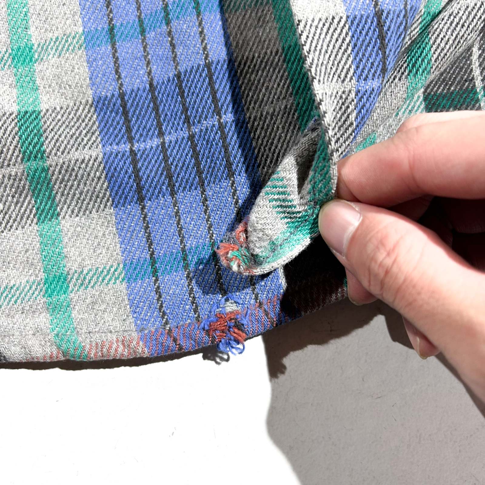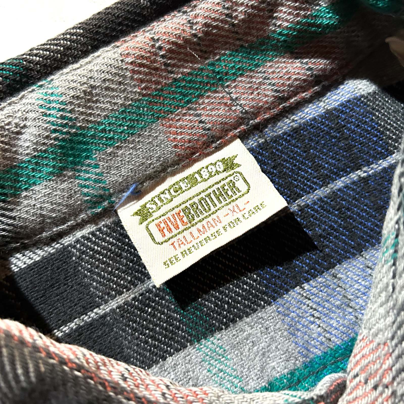 〈90’s FIVE BROTHER チェックネルシャツ〉。 ネルシャツ界の二大巨頭といえば〈FIVE BROTHER〉と〈BIG MAC〉。その中でも90年代の緑タグがつくファイブラは、古着好きにはたまらない“信頼と安心の証”です。 コットンフランネル特有のしっかりとした厚みと柔らかな風合いが両立した一枚。青×グレーの暗めチェックの好配色。 サイズ感はやや大きめで、スウェットパーカーを中に仕込んでシャツジャケットのように羽織るのがおすすめ。無骨なネルシャツも西海岸ライクなストリートスタイルで着ると新鮮です。ネルシャツの定番を改めて味わいたい方にぜひ。