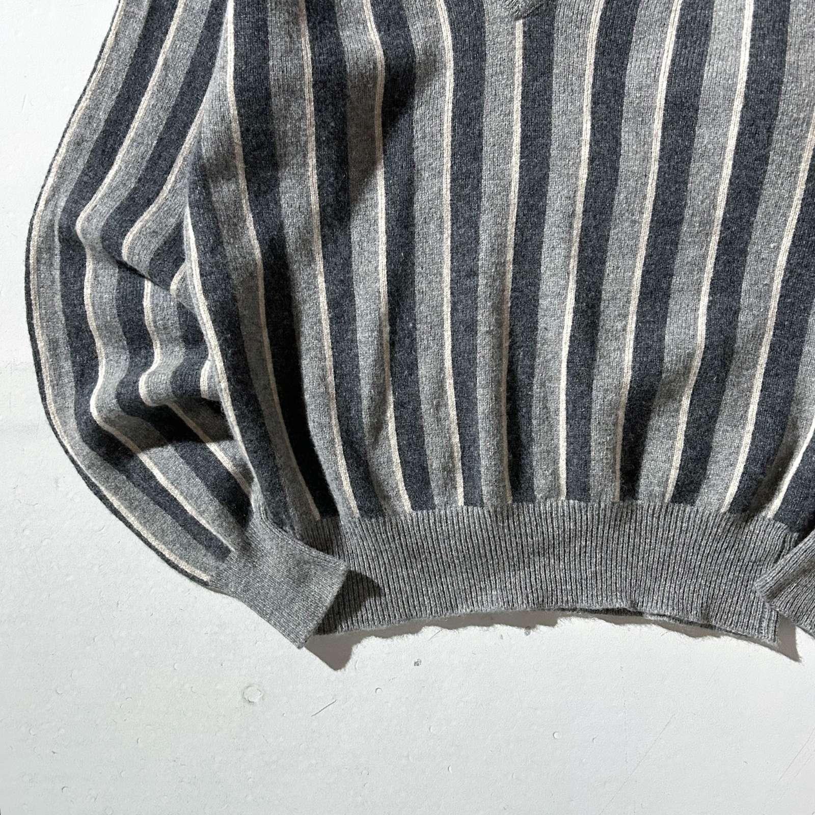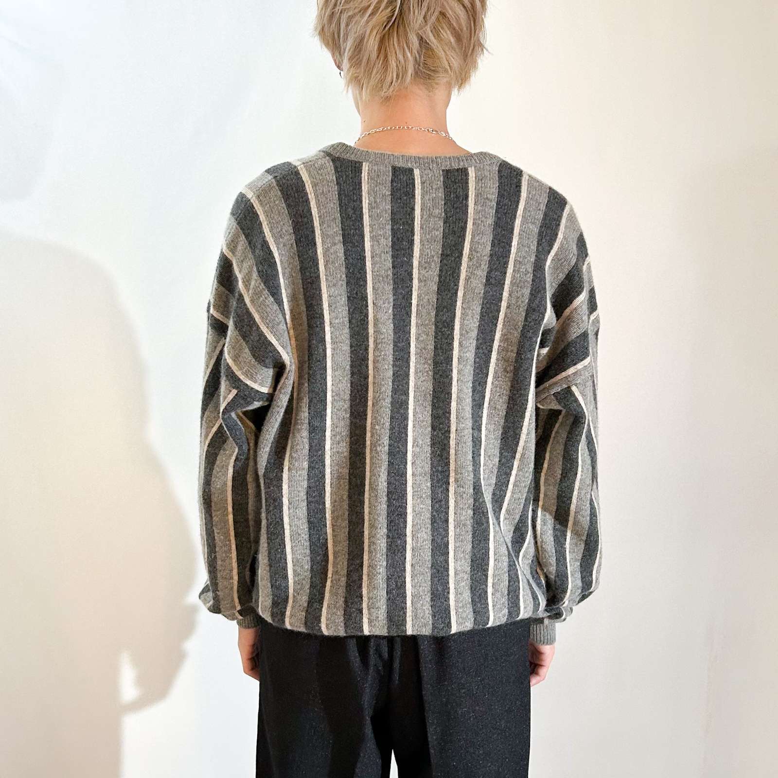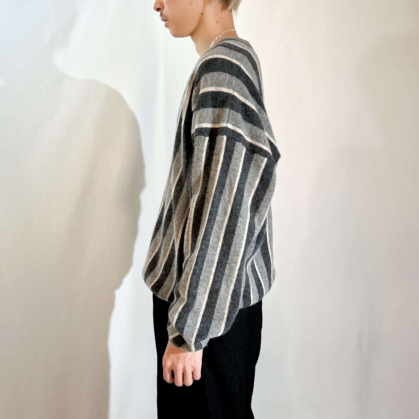 グレーと黒と白の3トーンストライプニットセーター。モノクロの中でもかなりいいストライプかと思います。まだ柔らかさの残るラムウールでフワッとした着心地がとてもいいです。