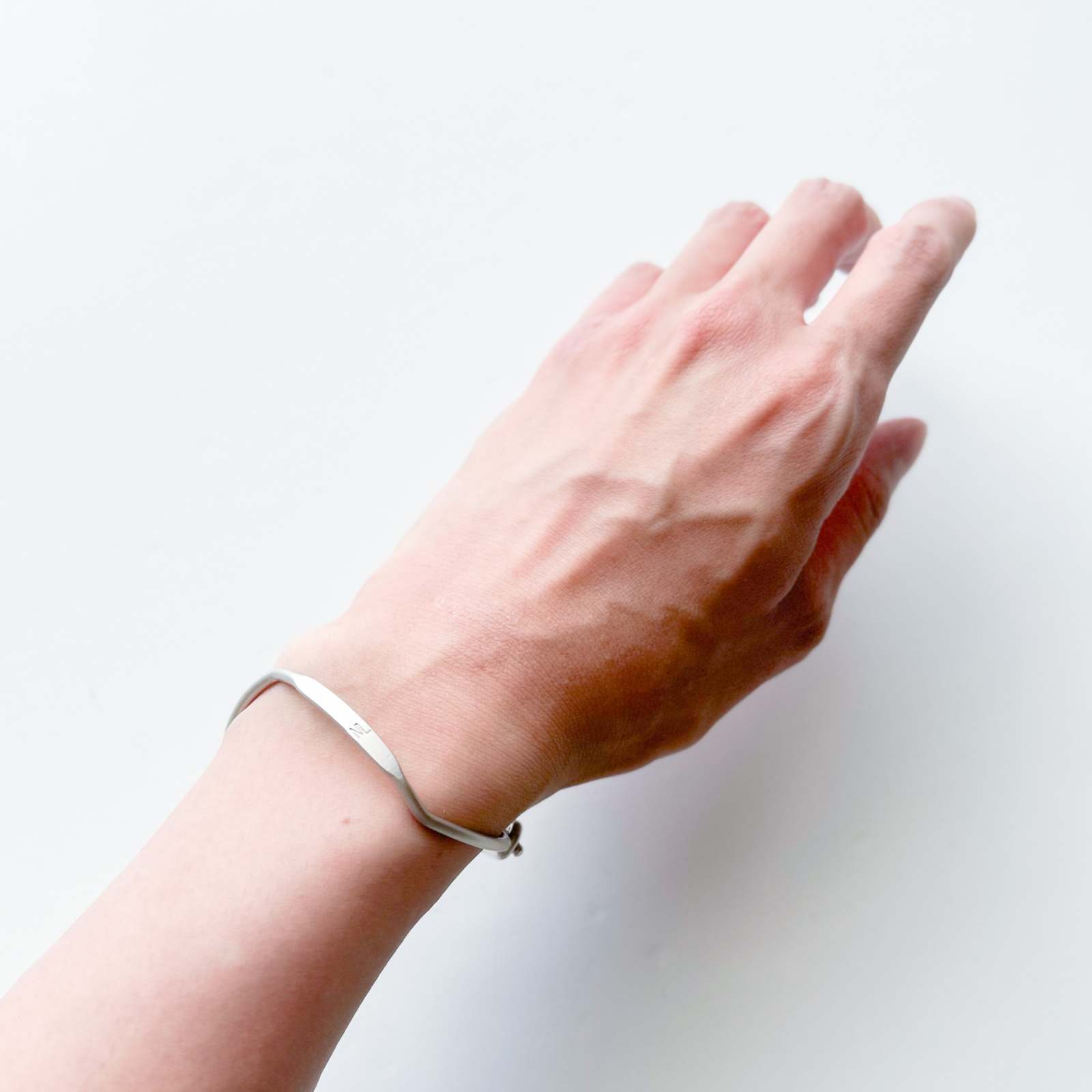 NL定番の”Huez”ブレスレット。角度によって見え方が変わる波打つ形状が特徴で、片手で簡単に着脱可能。NL刻印入り。 腕に馴染みやすい細身のデザインで、重ね付けも楽しめます。