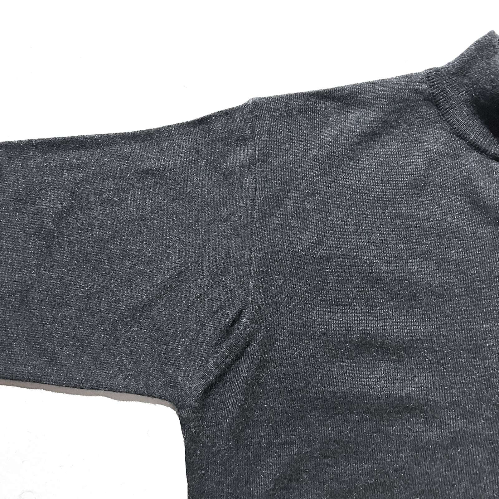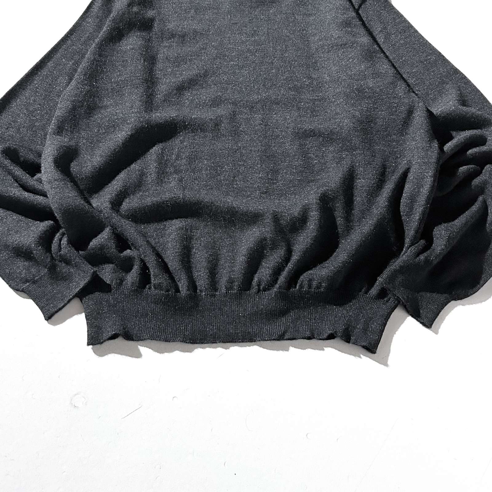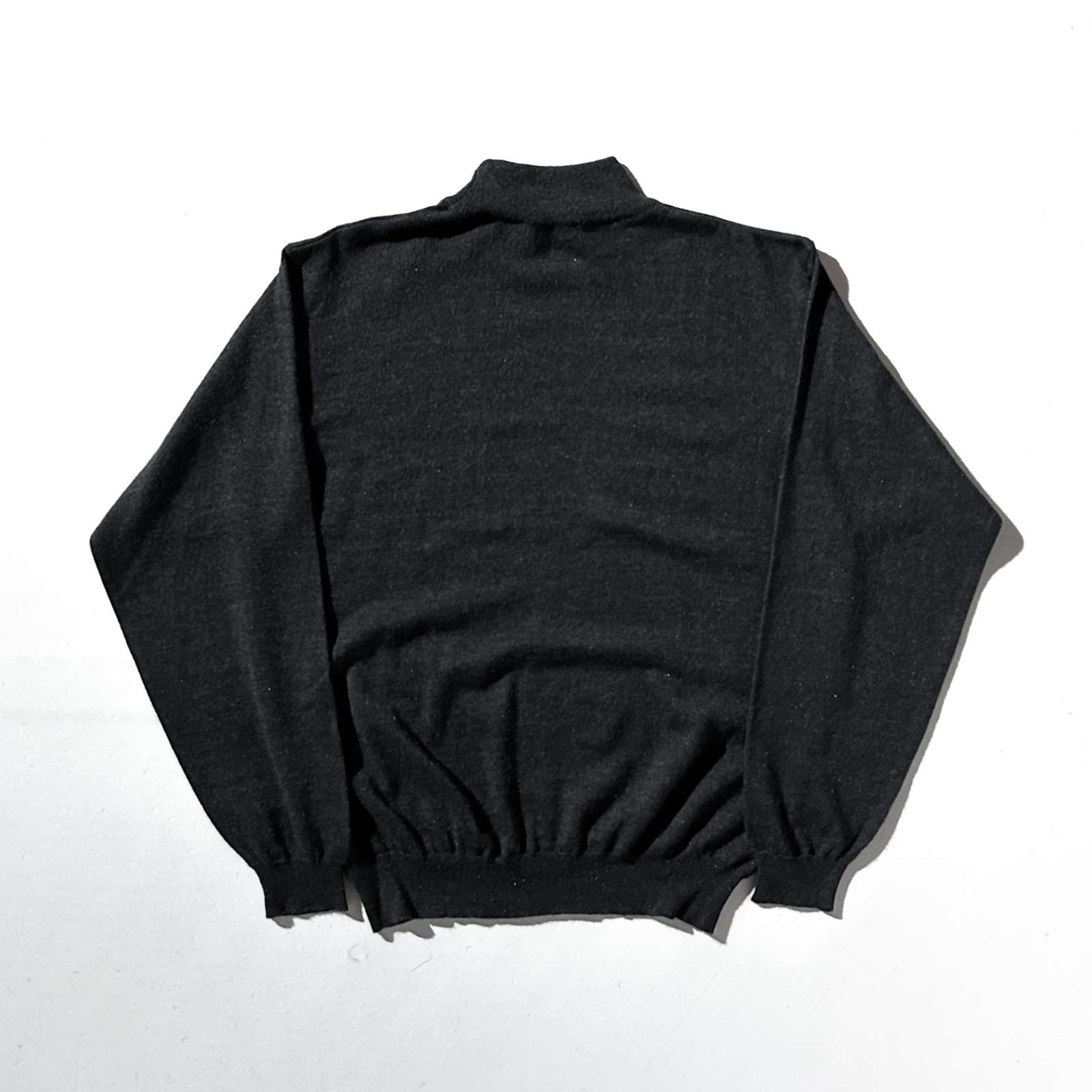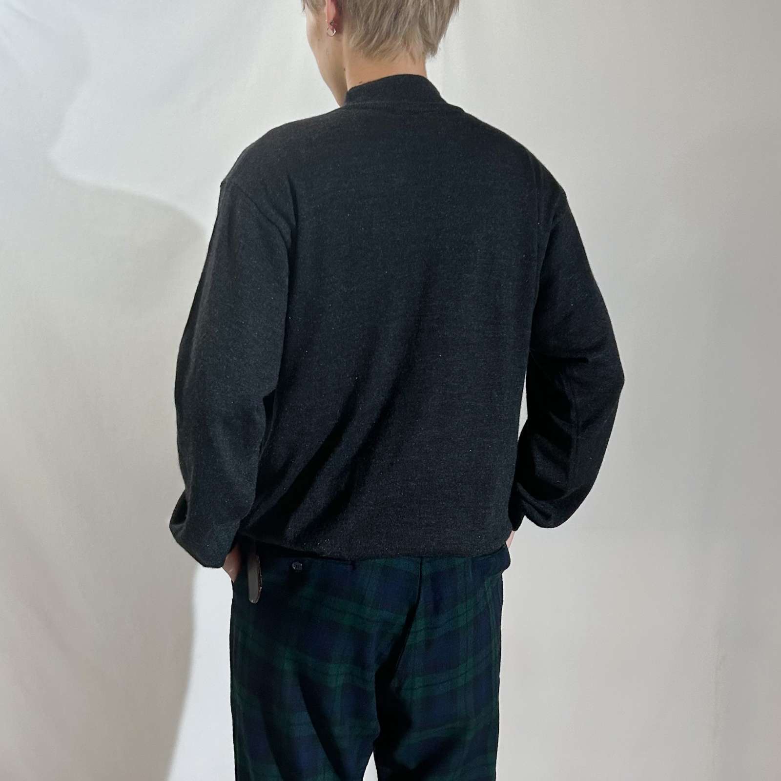〈イタリア製 メリノウール混 ハイゲージニットセーター〉。 上質なメリノウール×アクリル混紡素材を使用したハイゲージニット。 メリノの柔らかさとアクリルの扱いやすさを兼ね備えており、 自宅でのケアもしやすく、縮みにくいのが嬉しいポイント。 触れた瞬間に分かる、まるでカシミヤのような滑らかさ。 素肌に着てもチクチクせず、軽くてしなやかな着心地はまさに“高級素材のなせる業”です。 “カシミヤに次ぐ高級ウール”と呼ばれるメリノの質感を、 日常使いできる形で楽しめるのがこのニットの魅力。 カラーは合わせやすいグレー。 どんなアイテムとも相性が良く、インナーにも一枚着にも対応。 裾や袖のリブはしっかりとテンションがあり、ギュッと締まって溜まるシルエットを形成してくれます。 上品さと実用性を両立した、完成度の高い一着です。
