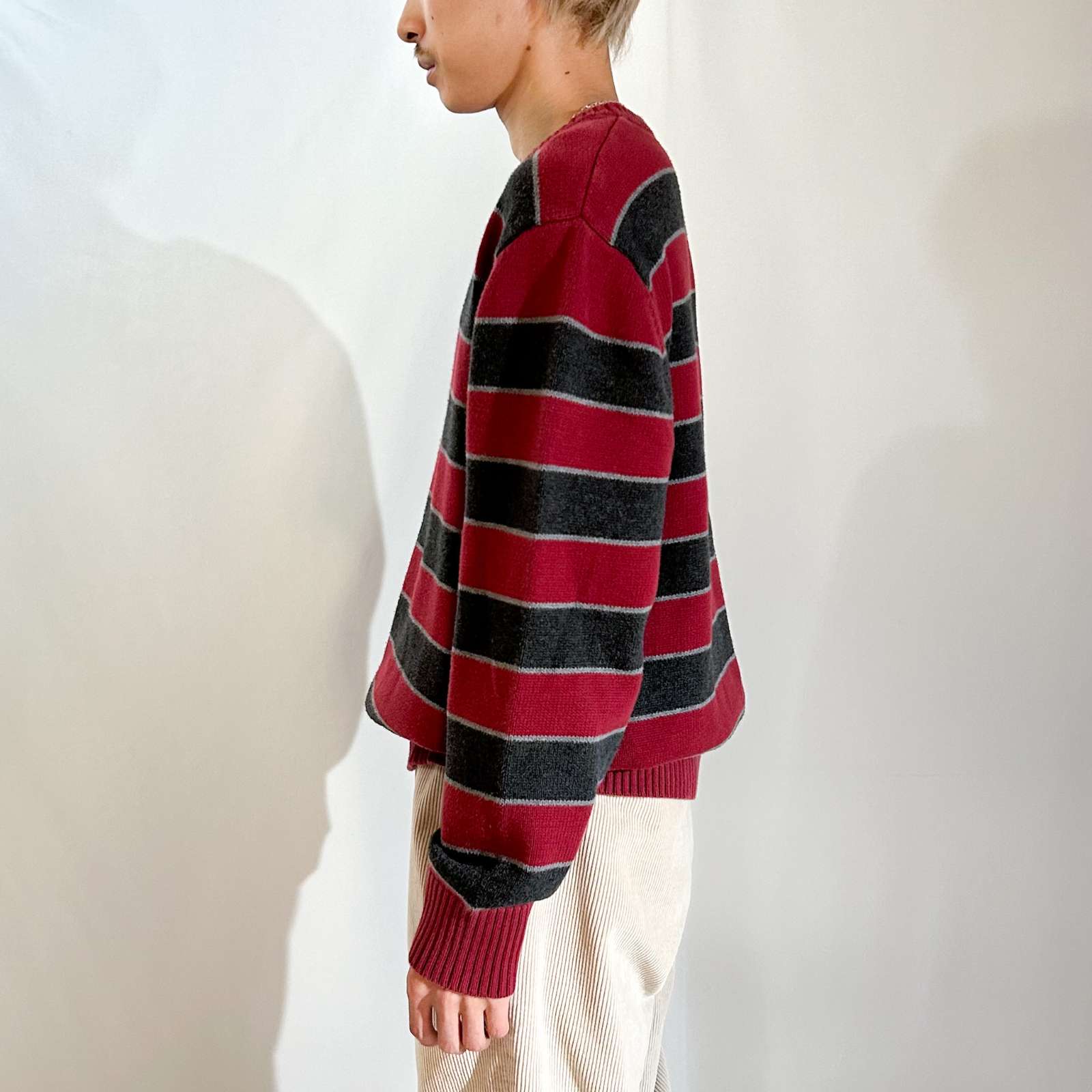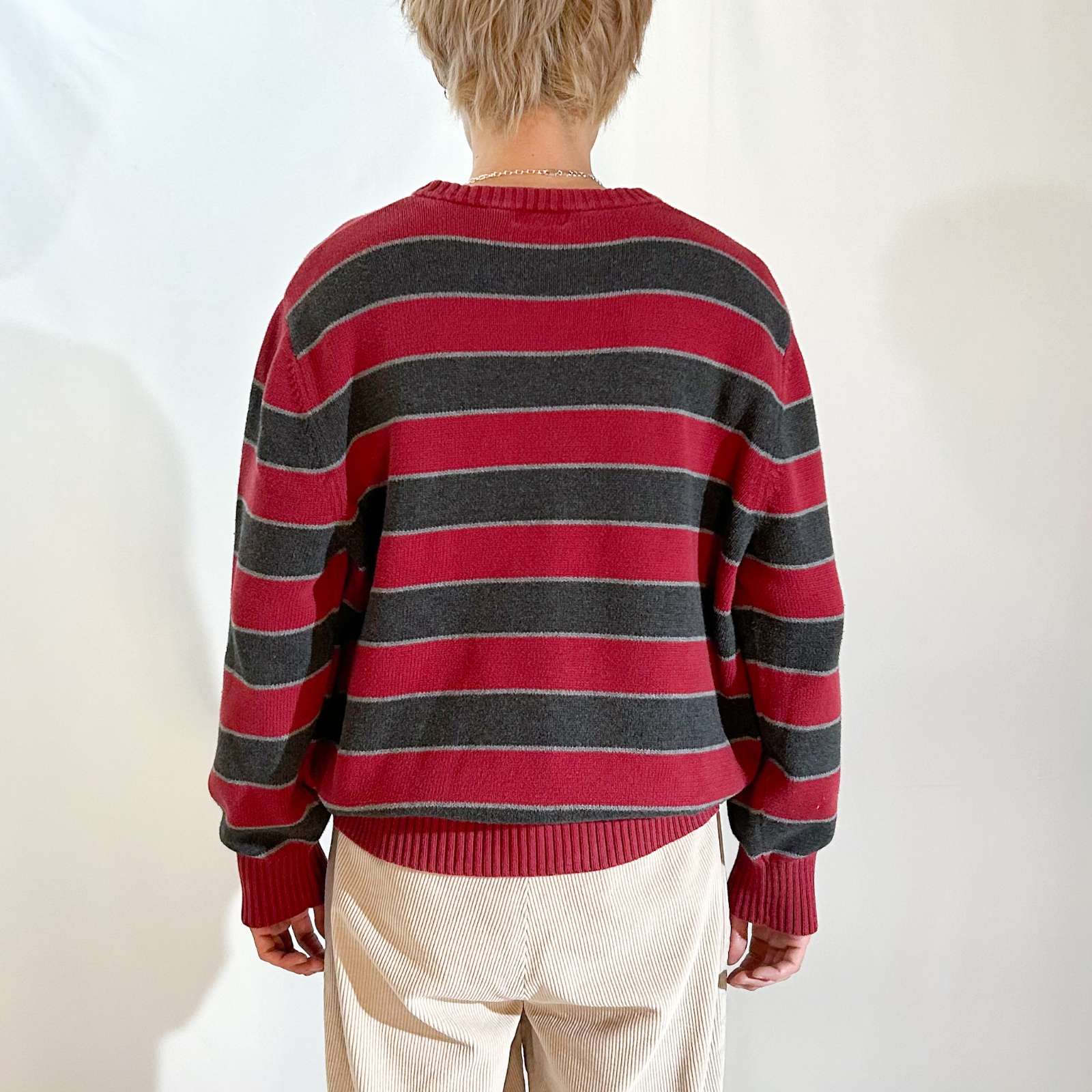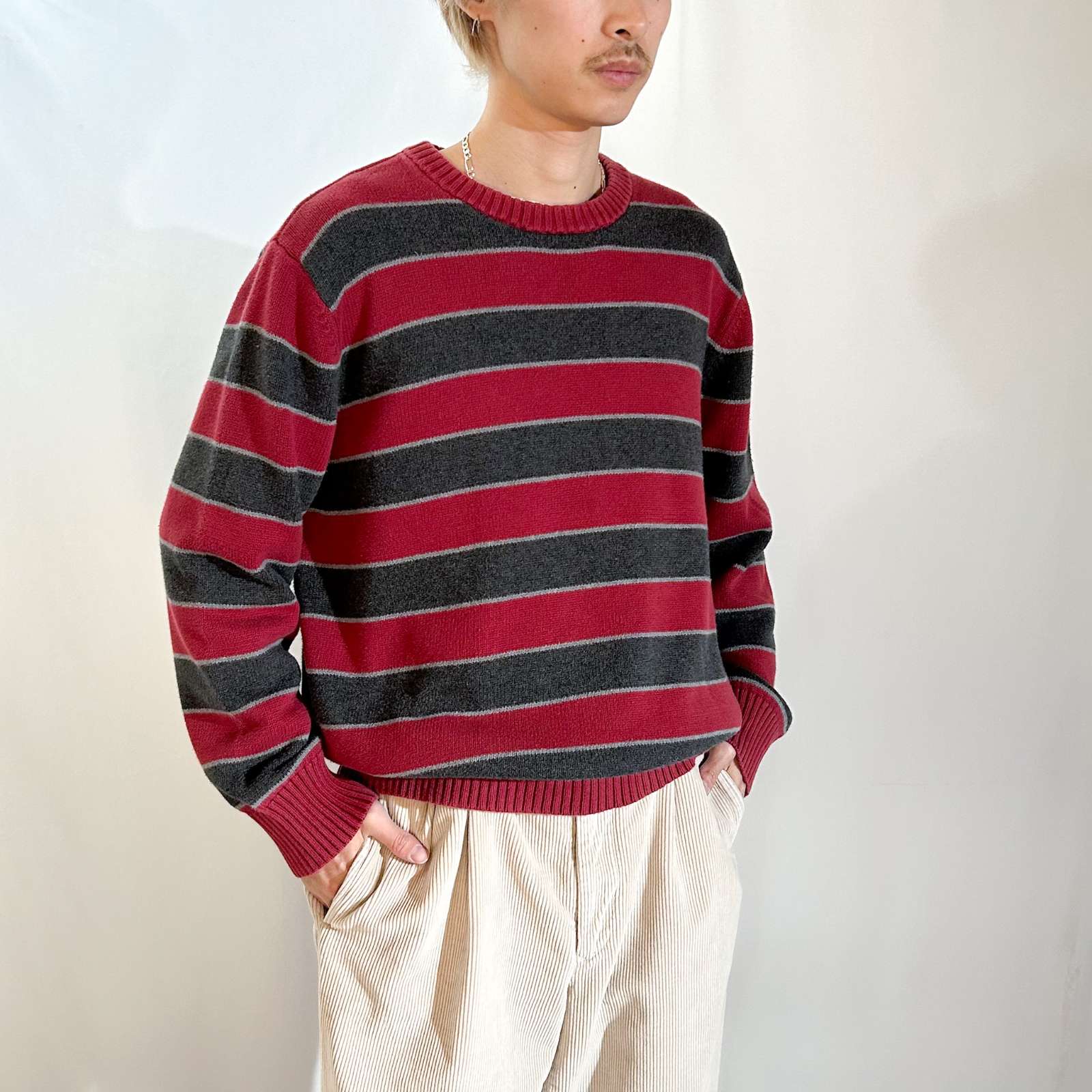 バーガンディとグレーの2トーンボーダーニット。使いやすいカラーと古着らしいパターンがとてもいいです。