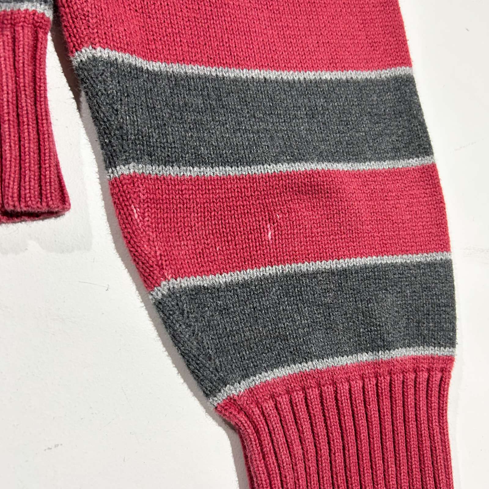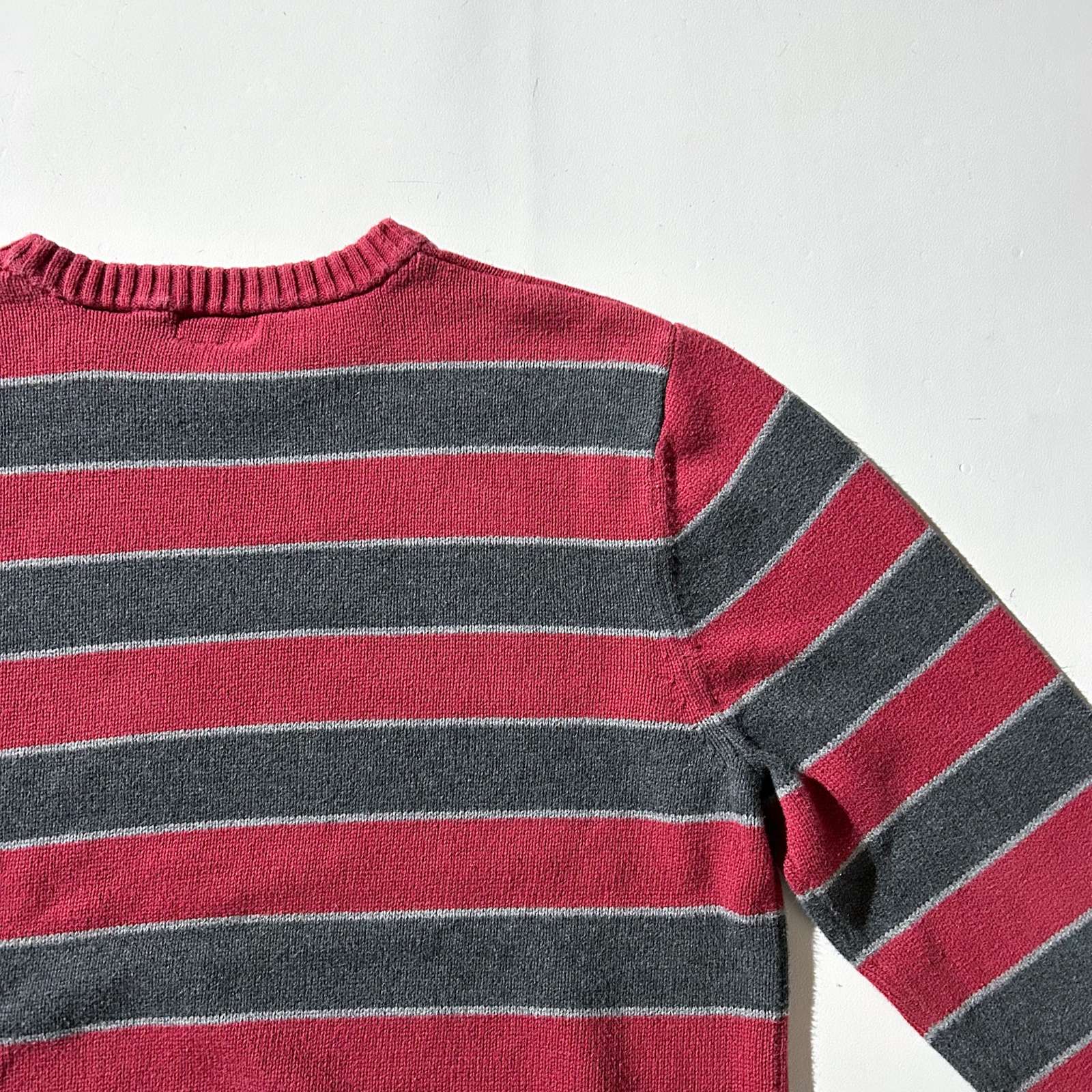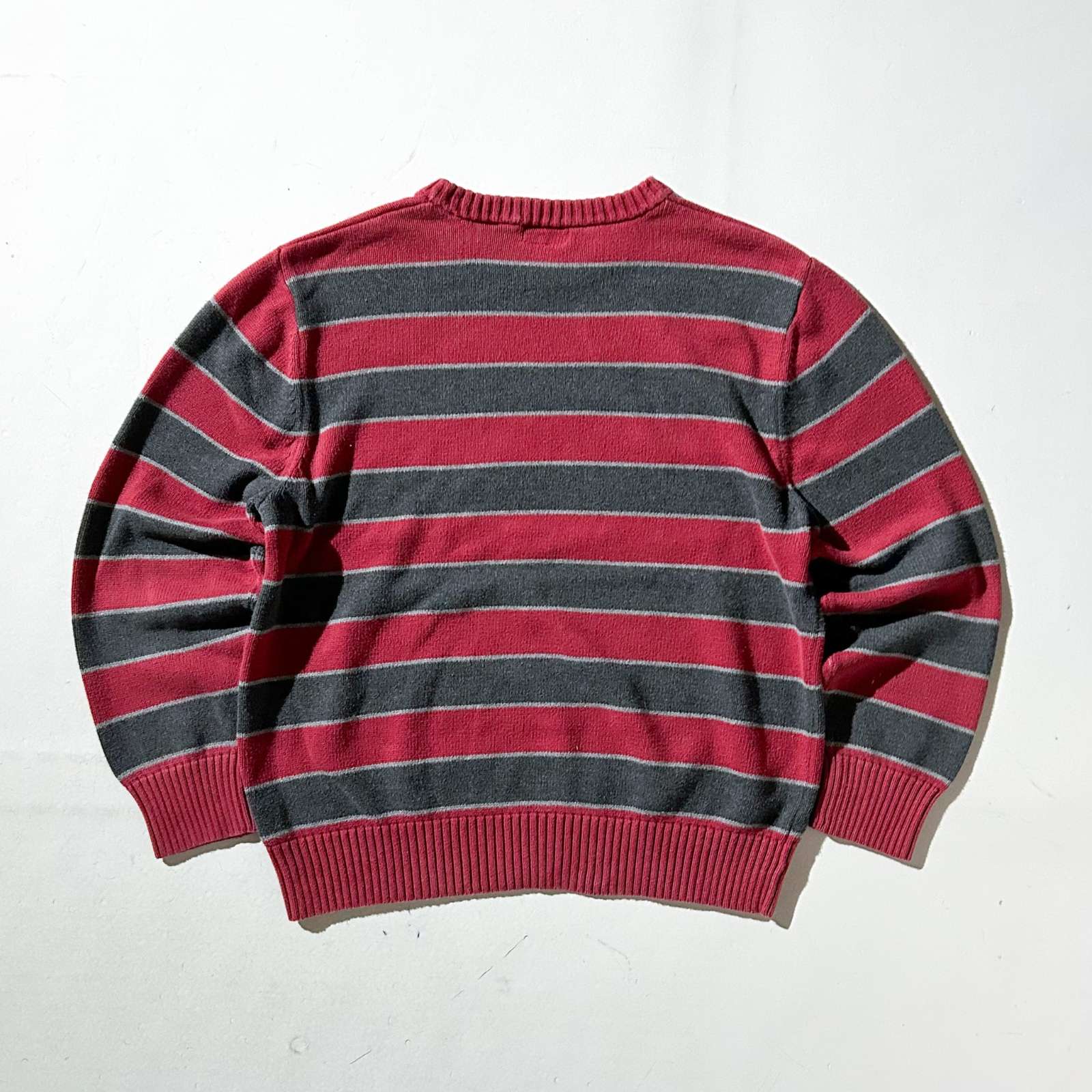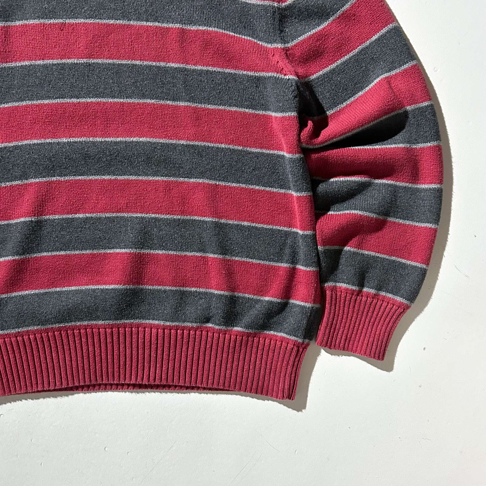 バーガンディとグレーの2トーンボーダーニット。使いやすいカラーと古着らしいパターンがとてもいいです。