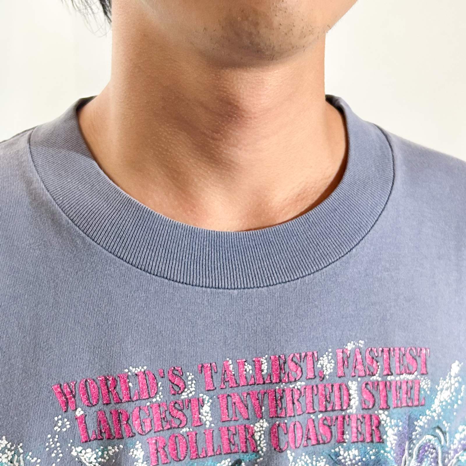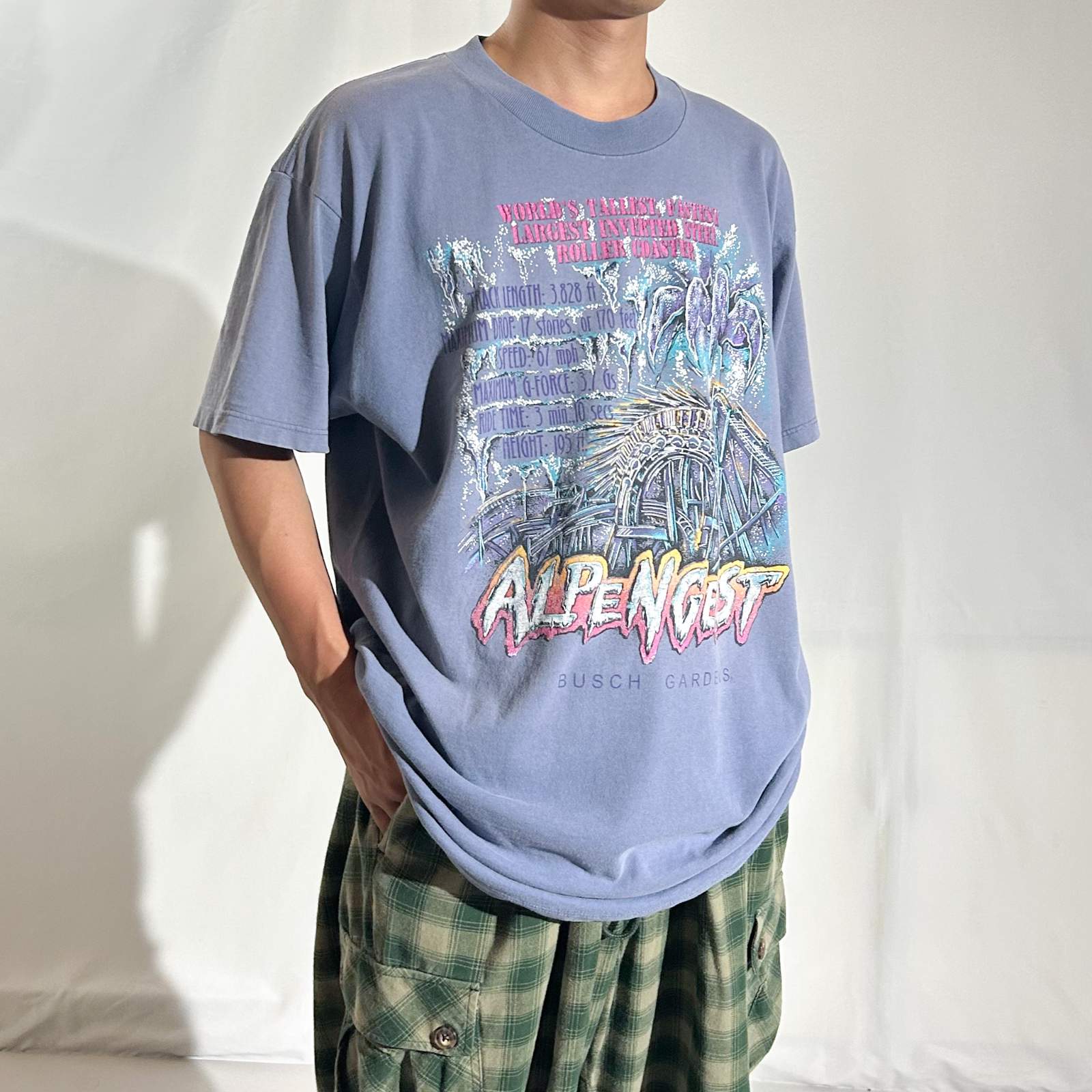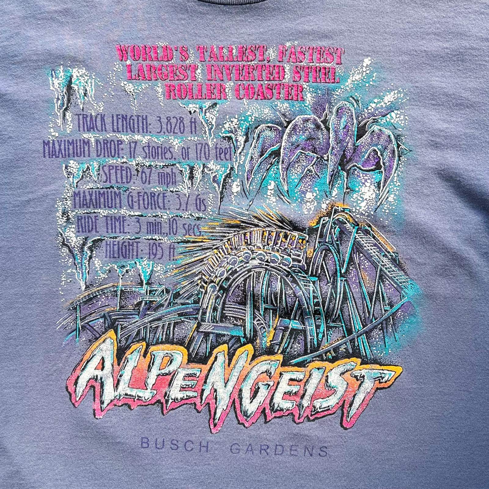 このTシャツは、アメリカ・バージニア州のテーマパーク「Busch Gardens Williamsburg(ブッシュガーデンズ・ウィリアムズバーグ)」にあるローラーコースター「ALPENGEIST(アルペンガイスト)」をテーマにした1枚です。1997年に登場したインバーテッド・コースター(ぶら下がり型のジェットコースター)で、登場当時は世界最長・最速の記録を誇っていました。