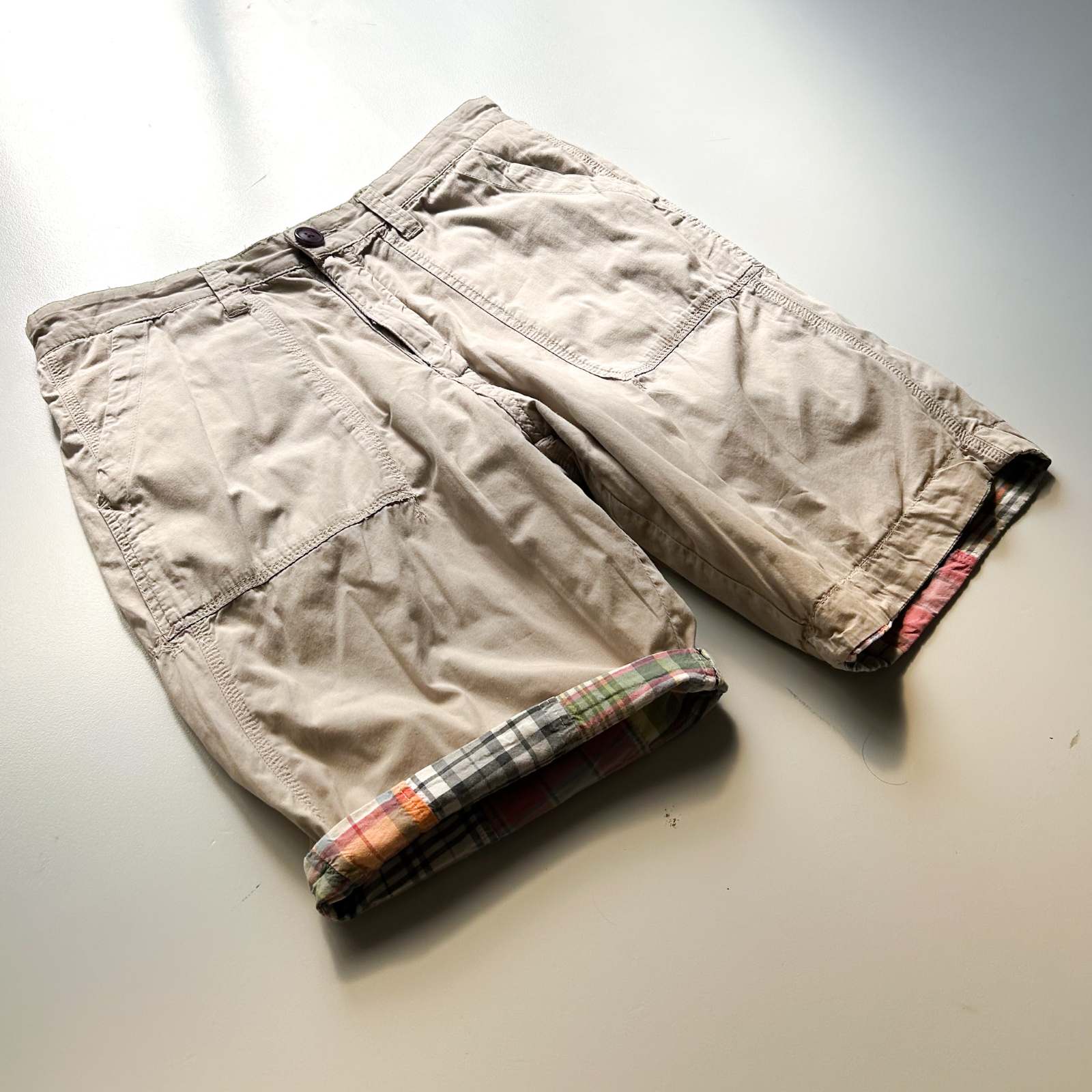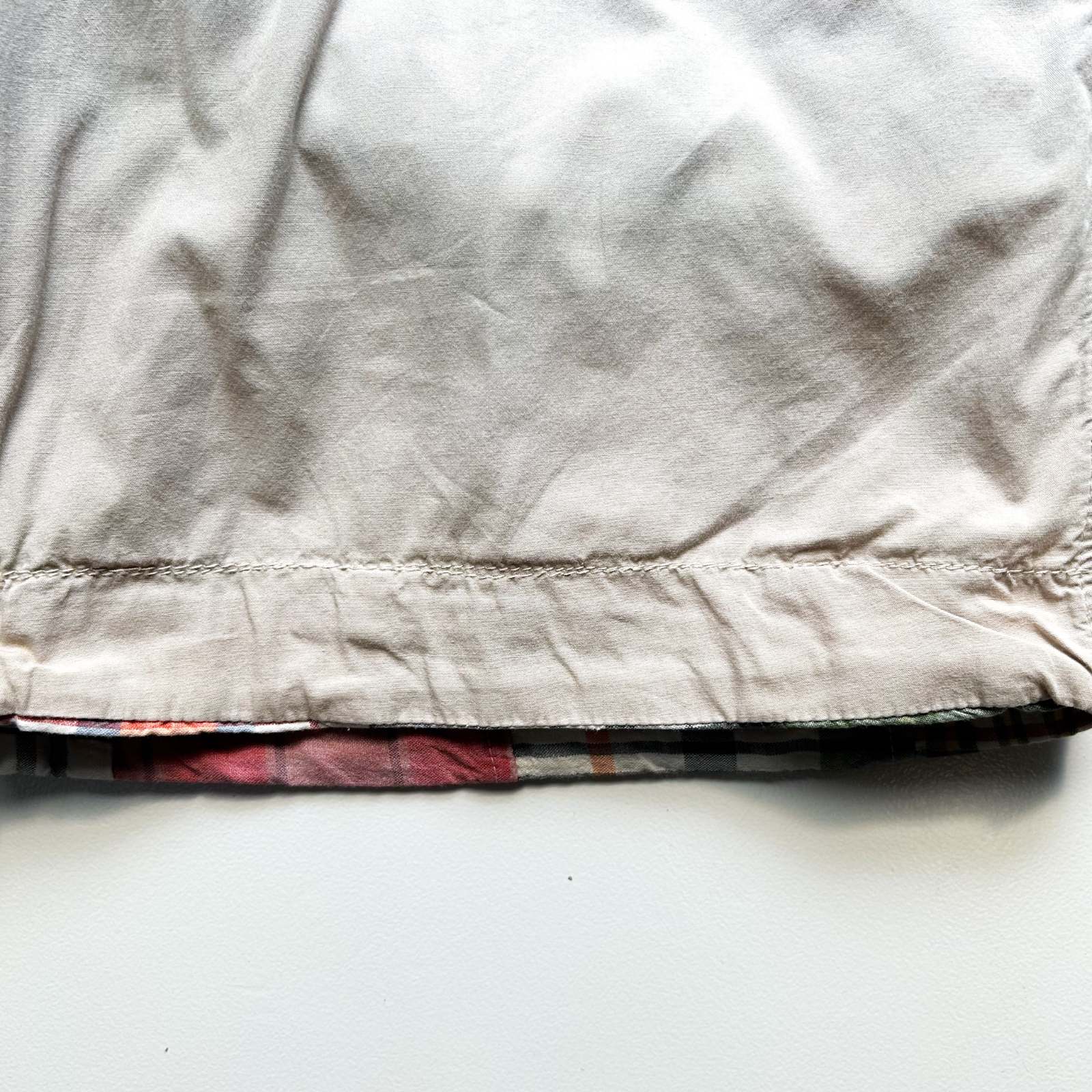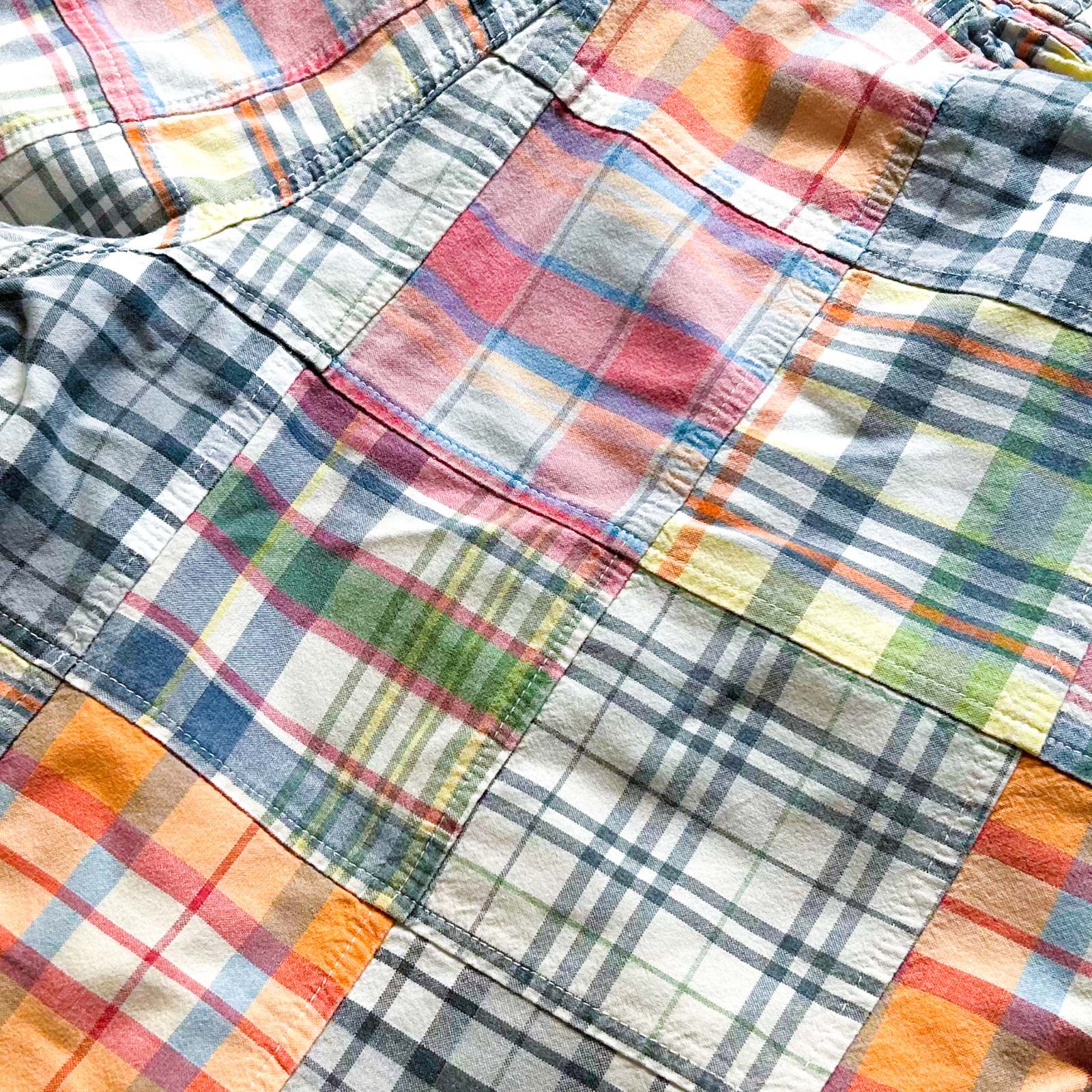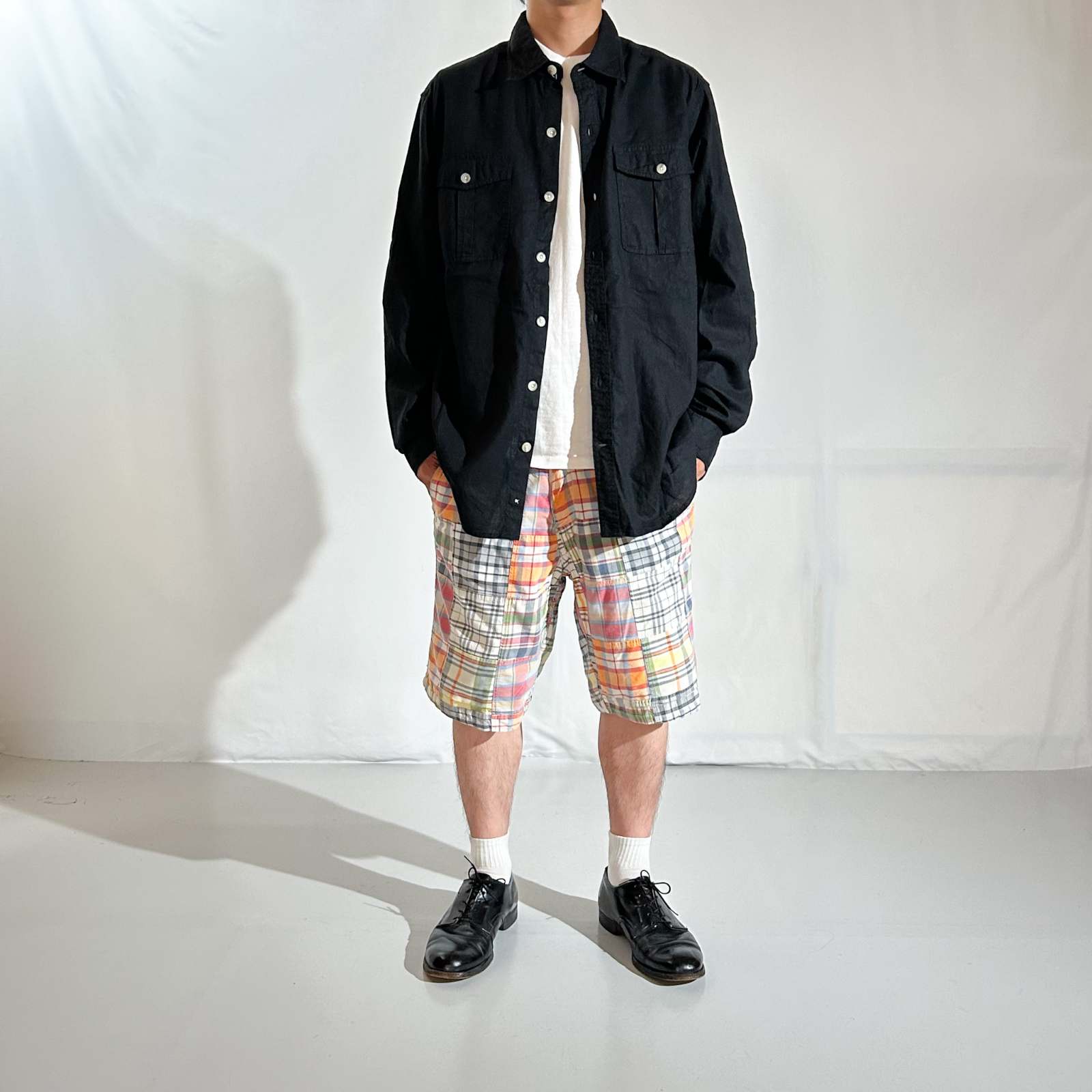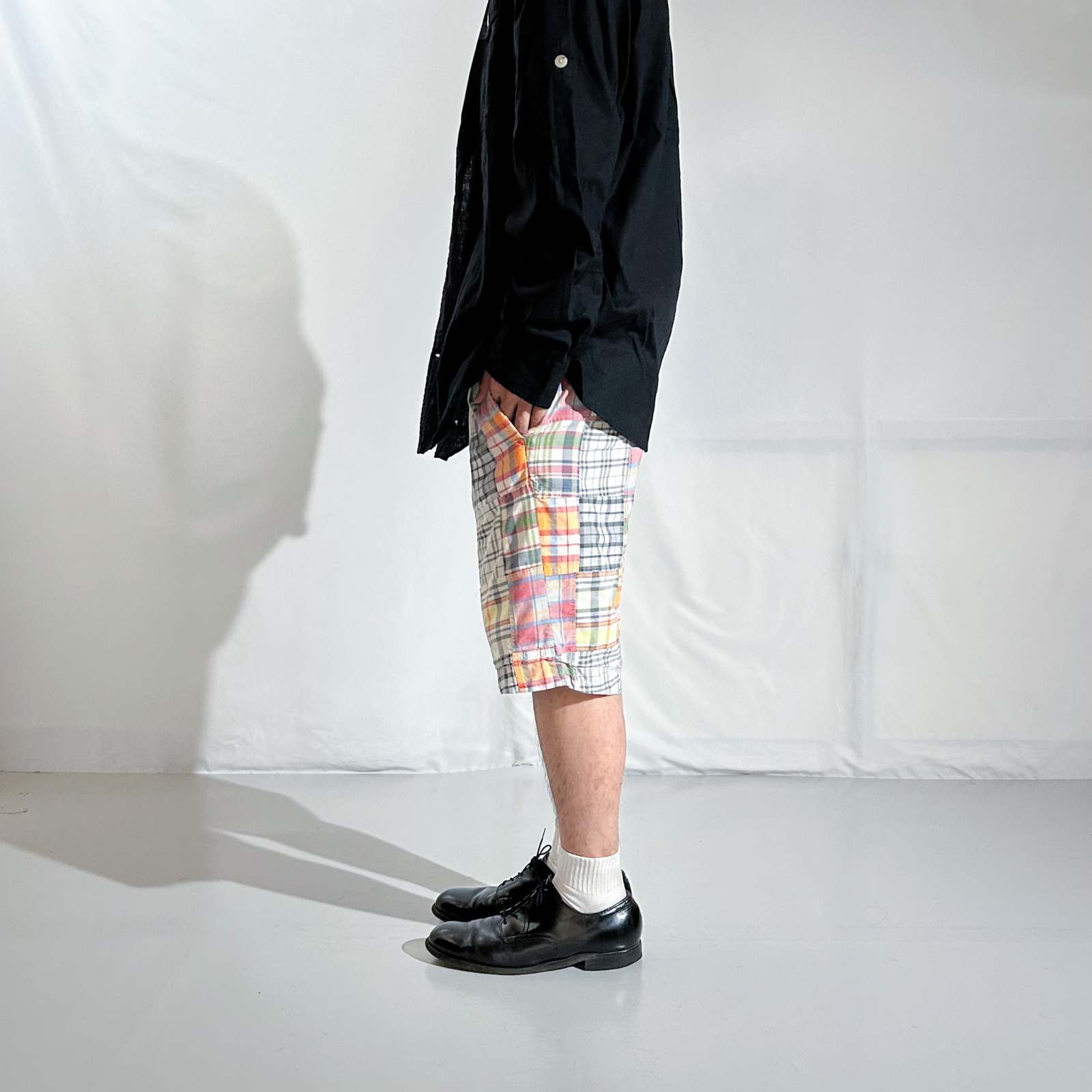 マドラスチェック×コットンブロード無地のリバーシブルショーツ。 なんといってもショーツでリバーシブル仕様というのが珍しい。気分やスタイリングに合わせて表裏どちらも主役として使える優れモノ。 マドラスチェック面はインド製ならではの風合いで、伝統的な本場感のあるテキスタイル。もう一方は無地のブロード生地で、すっきりとした印象に切り替え可能。 縫製は正直ラフですが、そこも古着らしい“抜け”の魅力。完璧じゃないからこそ、力の抜けたスタイリングにハマります。 「作りが雑なのに、そこが良い」──そんな“違和感”すら愛せる玄人向けの1本です。