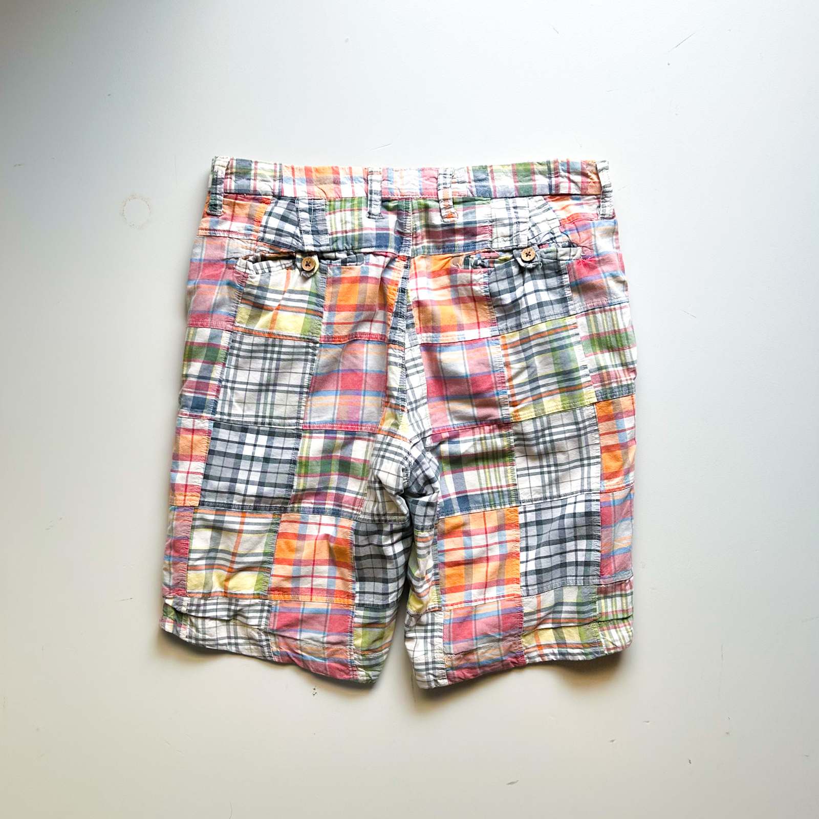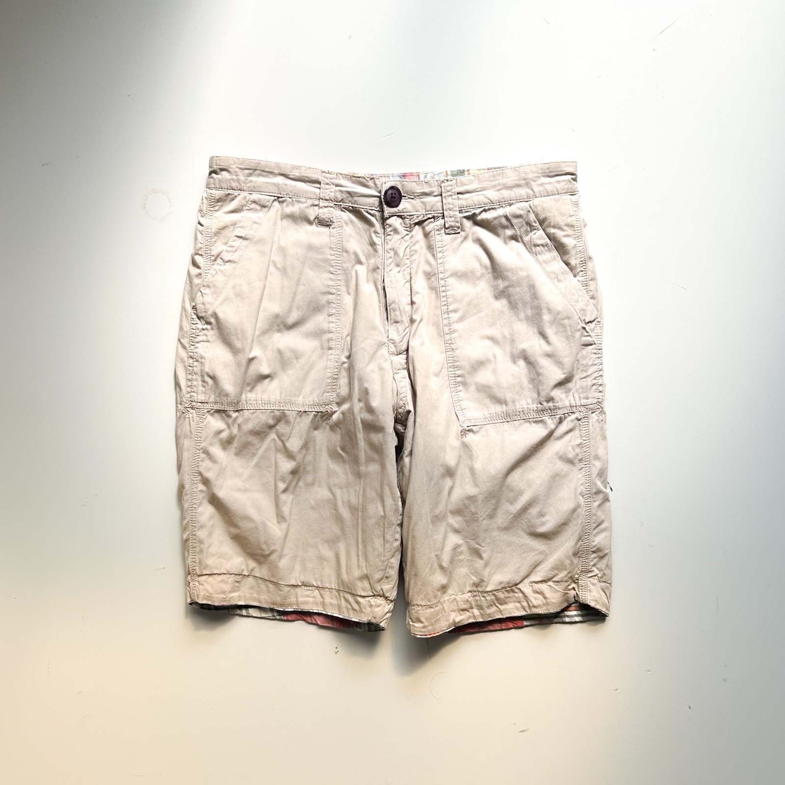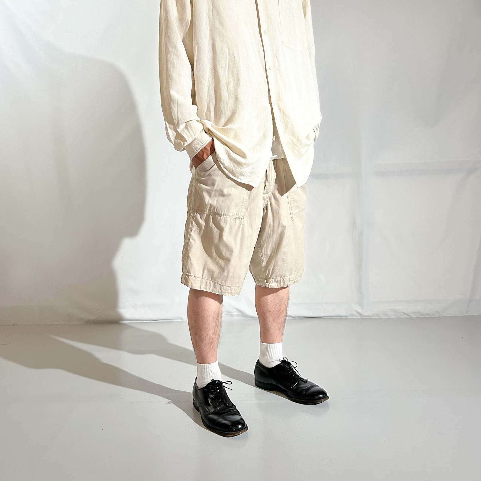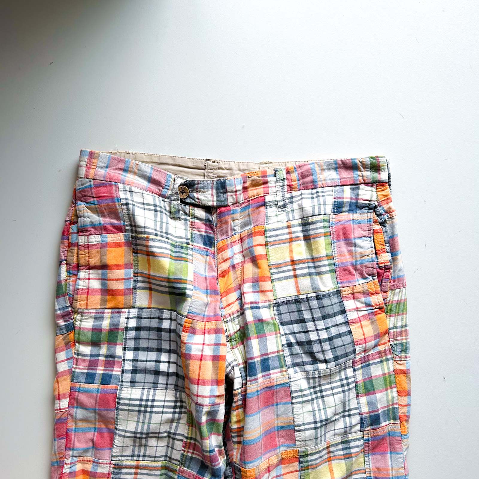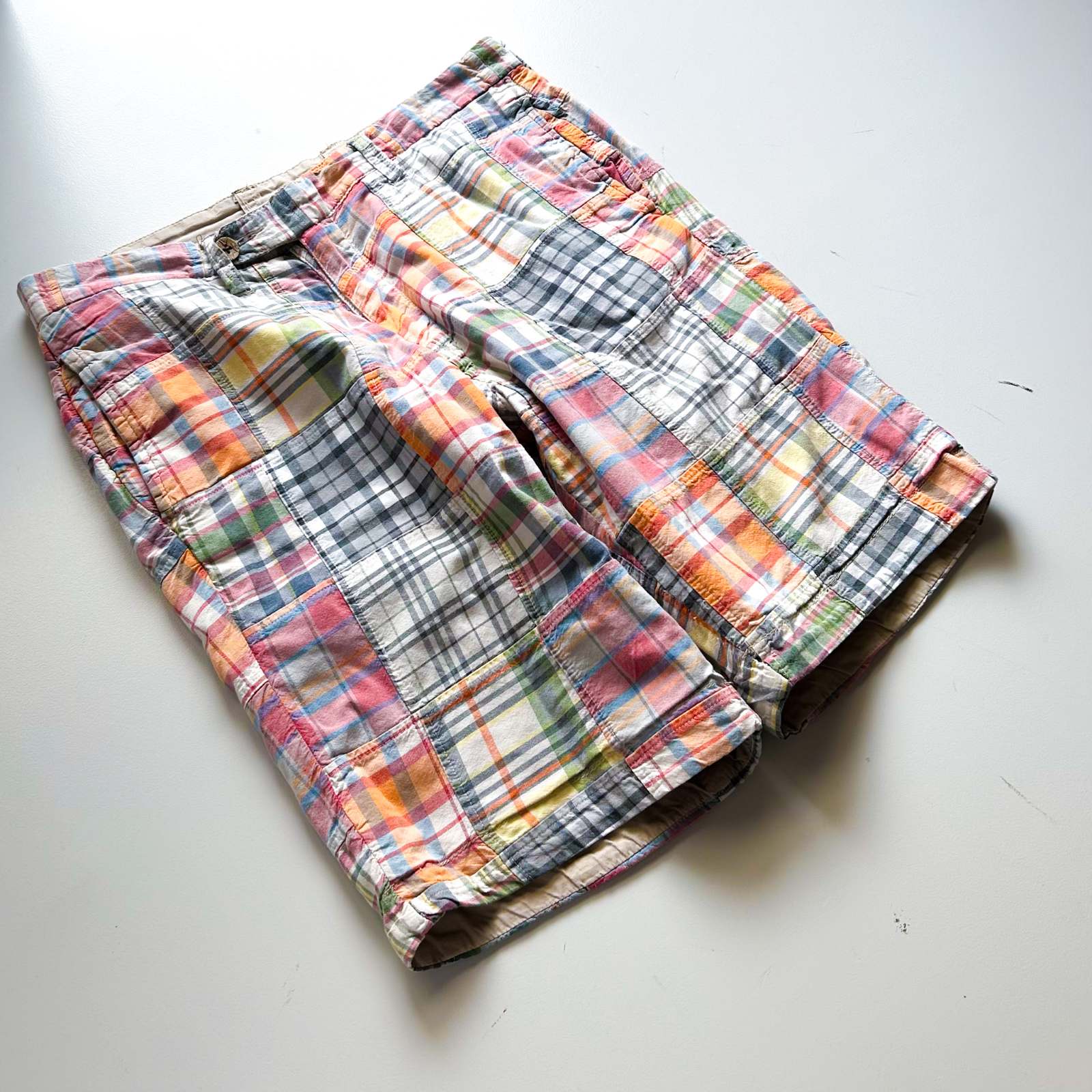 マドラスチェック×コットンブロード無地のリバーシブルショーツ。 なんといってもショーツでリバーシブル仕様というのが珍しい。気分やスタイリングに合わせて表裏どちらも主役として使える優れモノ。 マドラスチェック面はインド製ならではの風合いで、伝統的な本場感のあるテキスタイル。もう一方は無地のブロード生地で、すっきりとした印象に切り替え可能。 縫製は正直ラフですが、そこも古着らしい“抜け”の魅力。完璧じゃないからこそ、力の抜けたスタイリングにハマります。 「作りが雑なのに、そこが良い」──そんな“違和感”すら愛せる玄人向けの1本です。