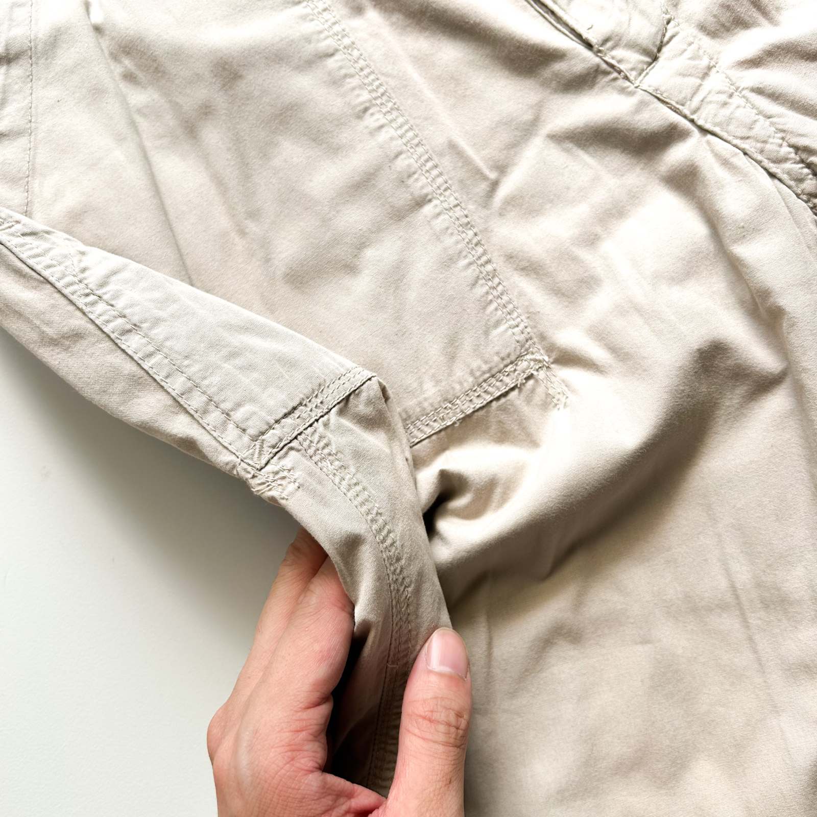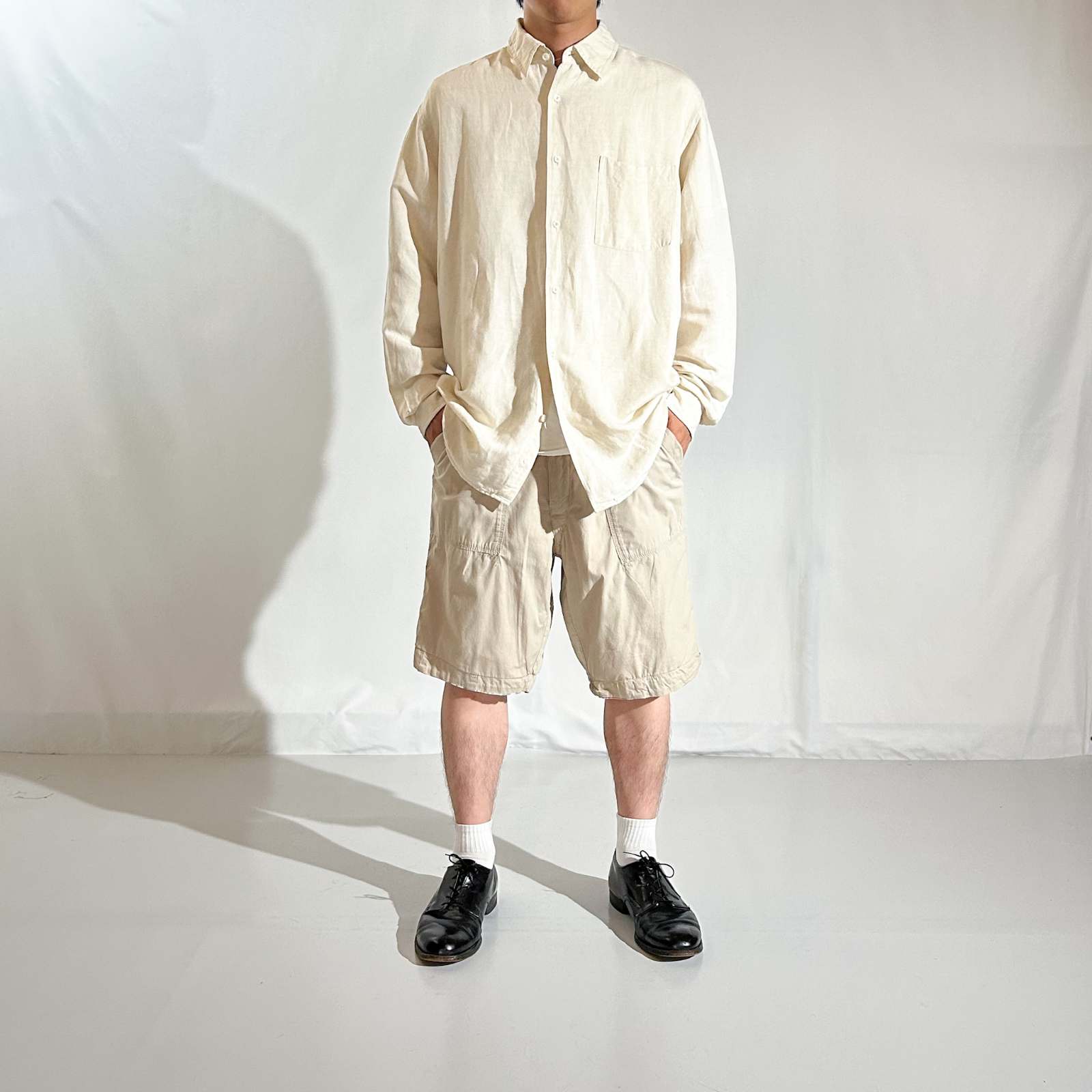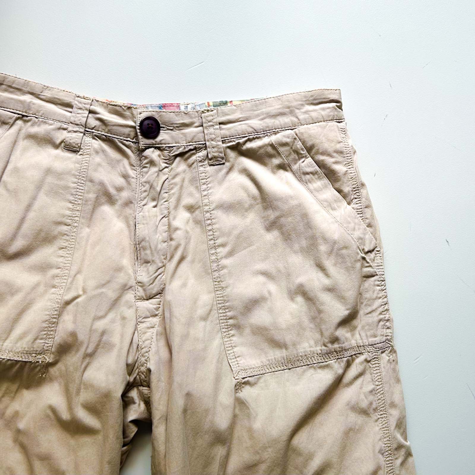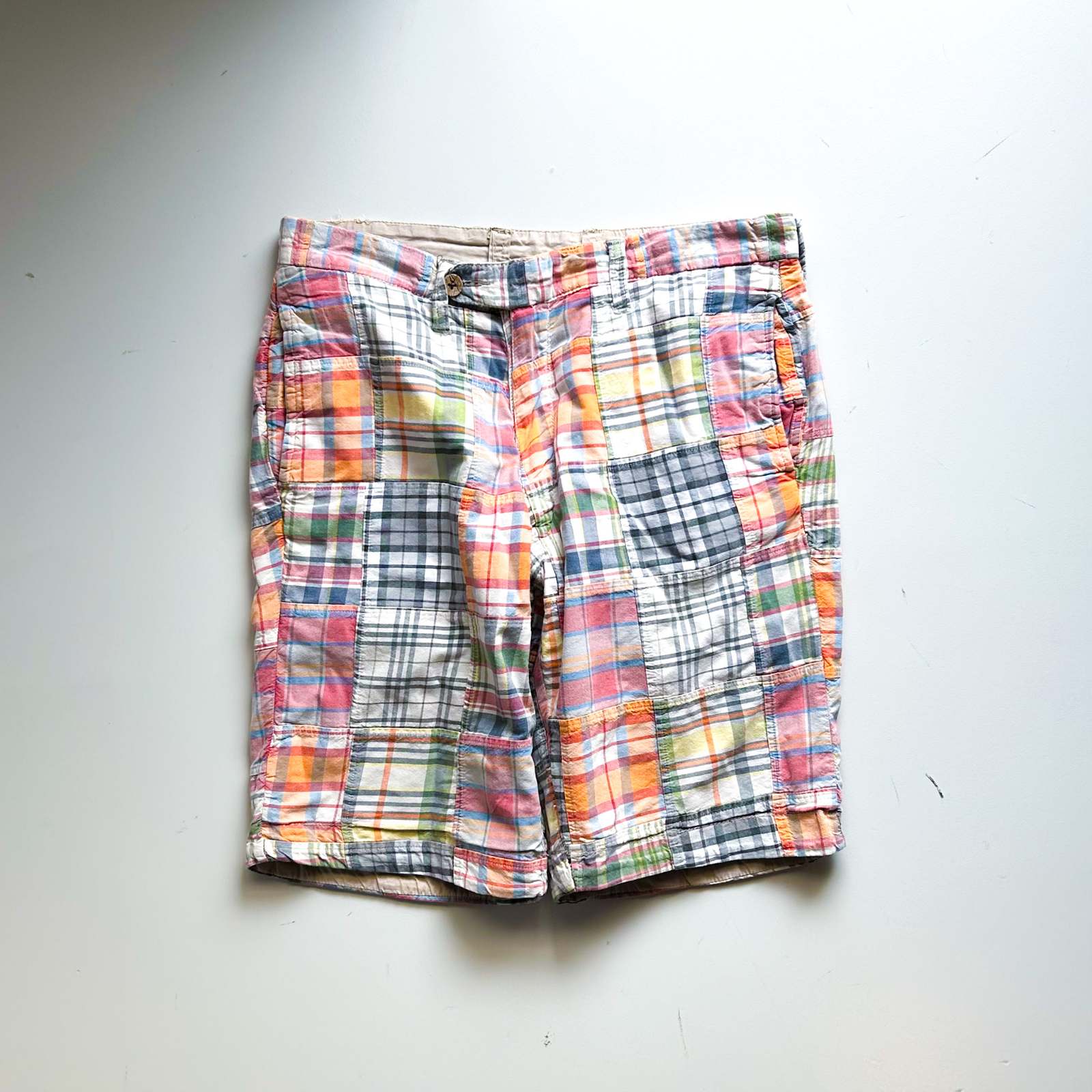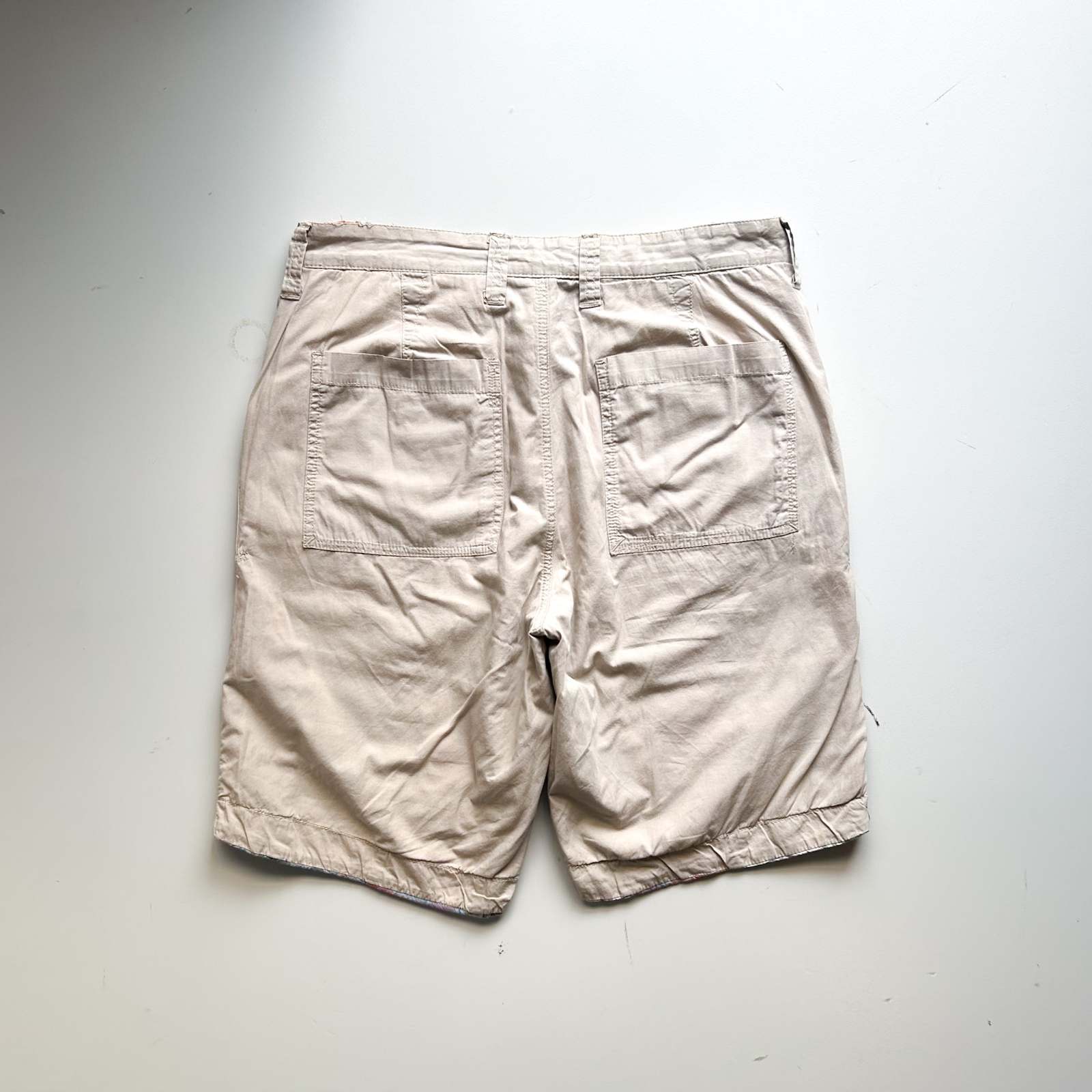 マドラスチェック×コットンブロード無地のリバーシブルショーツ。 なんといってもショーツでリバーシブル仕様というのが珍しい。気分やスタイリングに合わせて表裏どちらも主役として使える優れモノ。 マドラスチェック面はインド製ならではの風合いで、伝統的な本場感のあるテキスタイル。もう一方は無地のブロード生地で、すっきりとした印象に切り替え可能。 縫製は正直ラフですが、そこも古着らしい“抜け”の魅力。完璧じゃないからこそ、力の抜けたスタイリングにハマります。 「作りが雑なのに、そこが良い」──そんな“違和感”すら愛せる玄人向けの1本です。