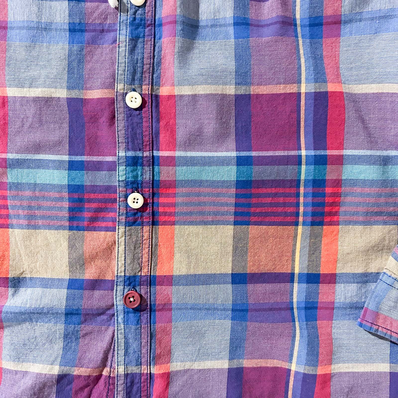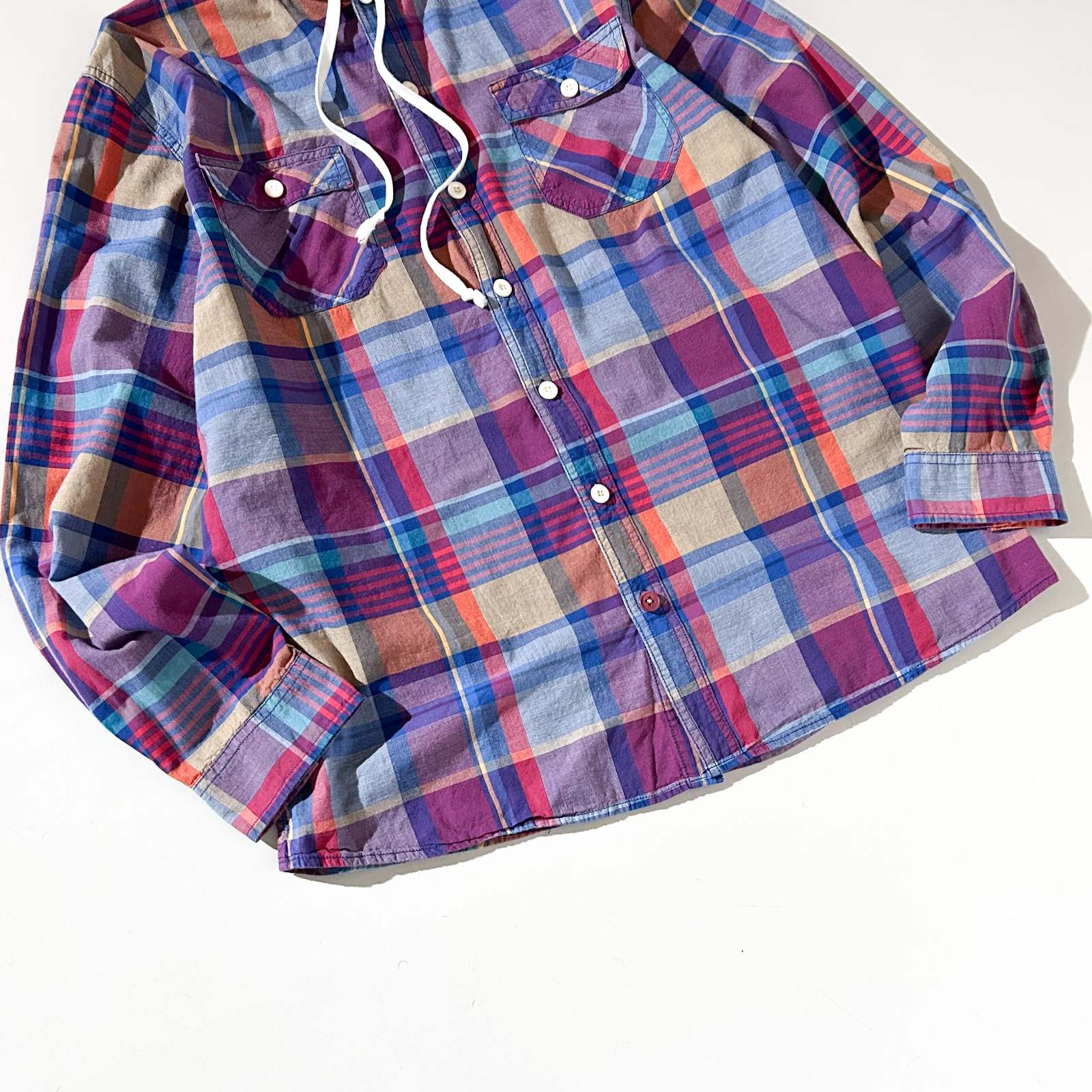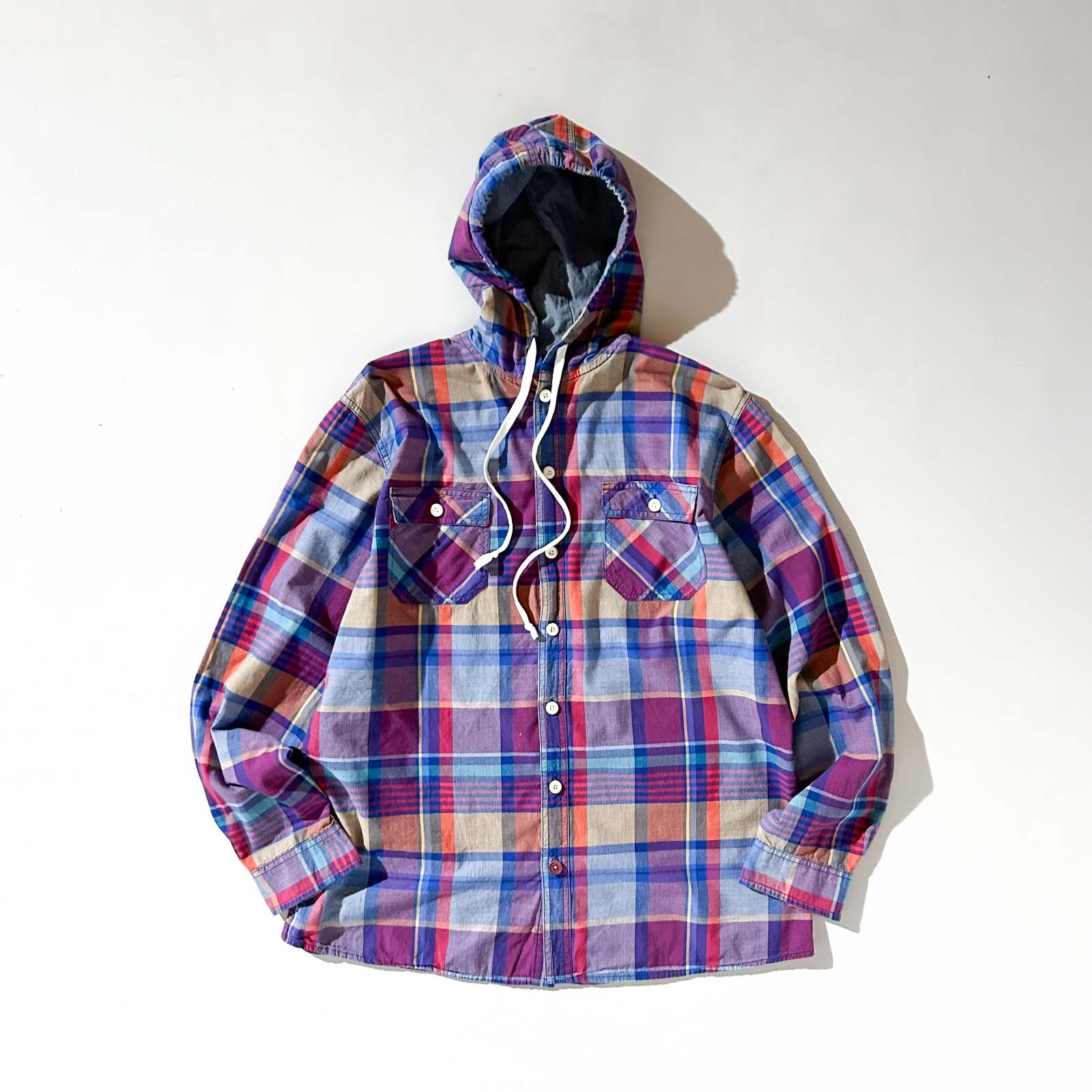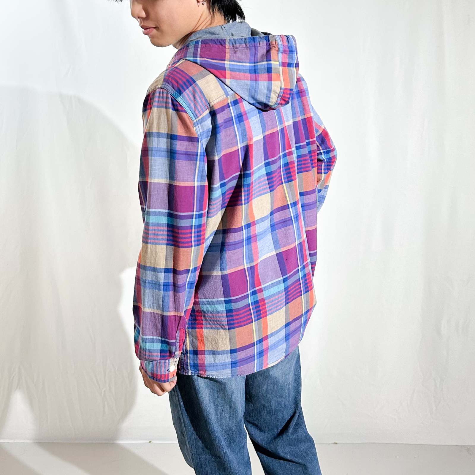90年代、西海岸ストリートブランドとして人気を集めた Mossimo(モッシモ)。 こちらはマドラスチェックにフードを組み合わせた、シャツとパーカーの中間のようなデザインで西海岸らしいラフな雰囲気が魅力の1枚です。 Tシャツの上から羽織るだけでも雰囲気の出る、気の利いたレギュラー古着。