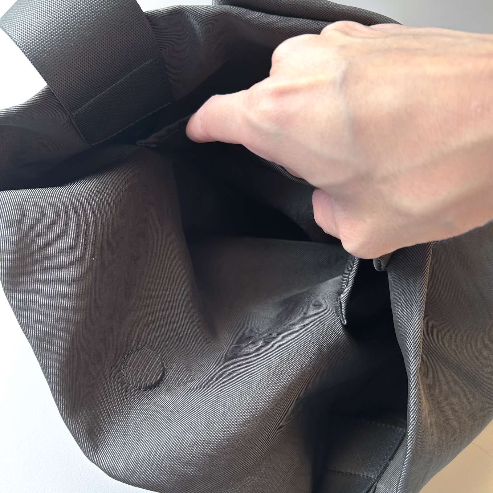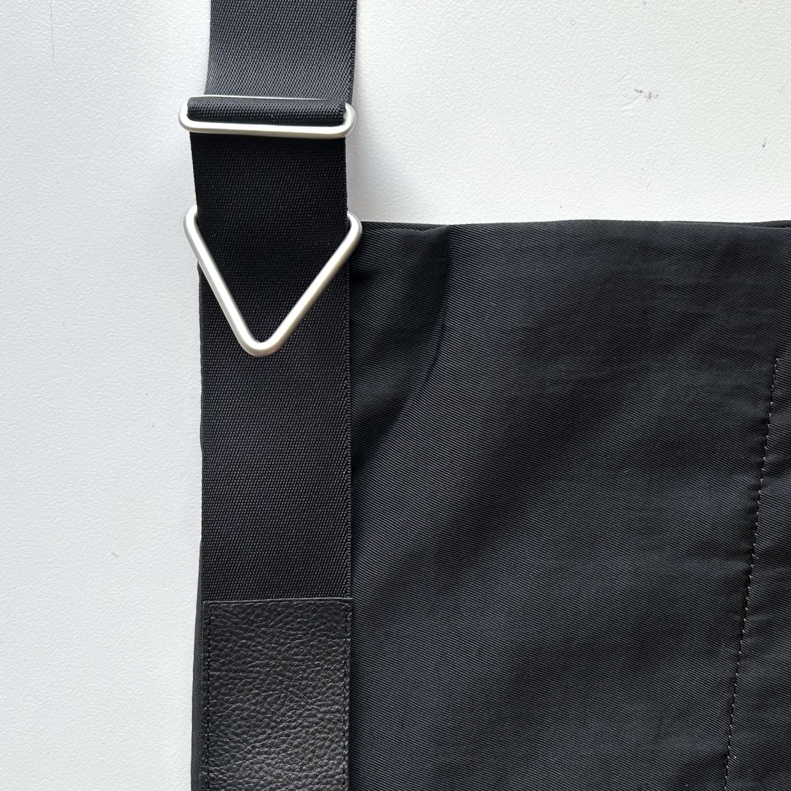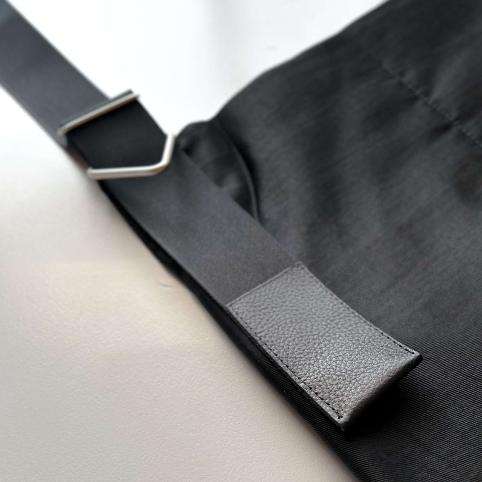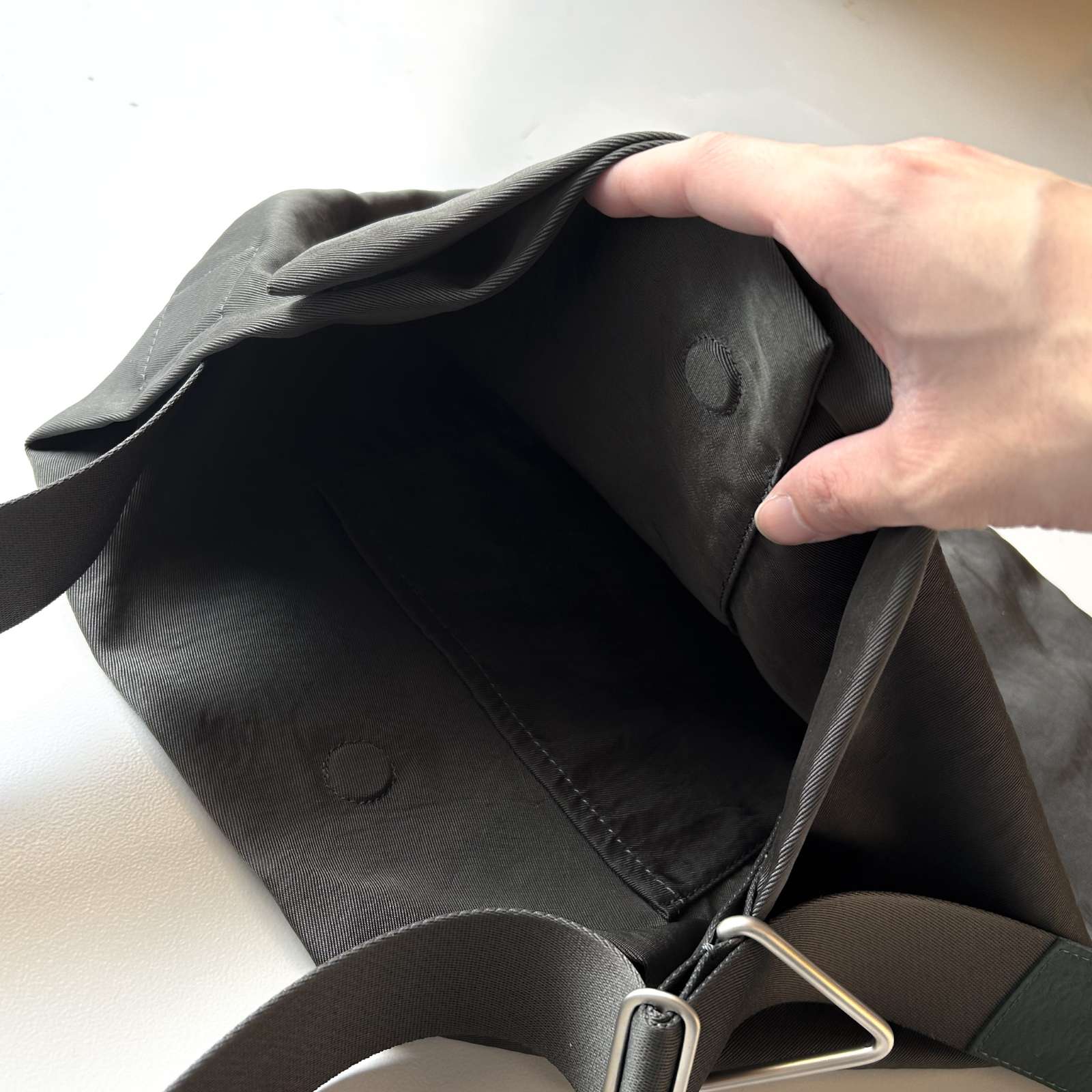 フロントはマグネットで開閉できるポケット仕様です。口元にもマグネットを配し、内側にもポケットを1つ備えています。 底にしっかりマチをとることで容量を確保。ショルダーテープの先端はレザーでまとめられ、サイドには存在感のある特大の三角カンが付きます。