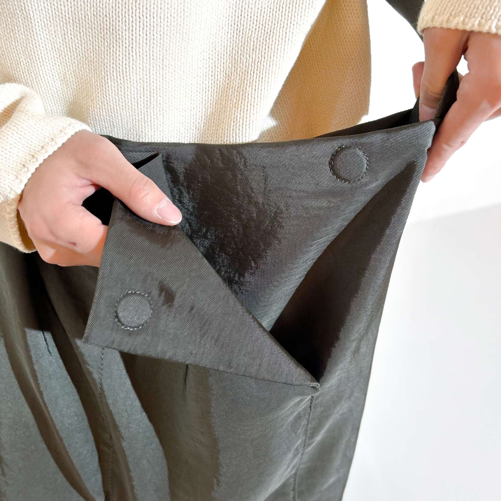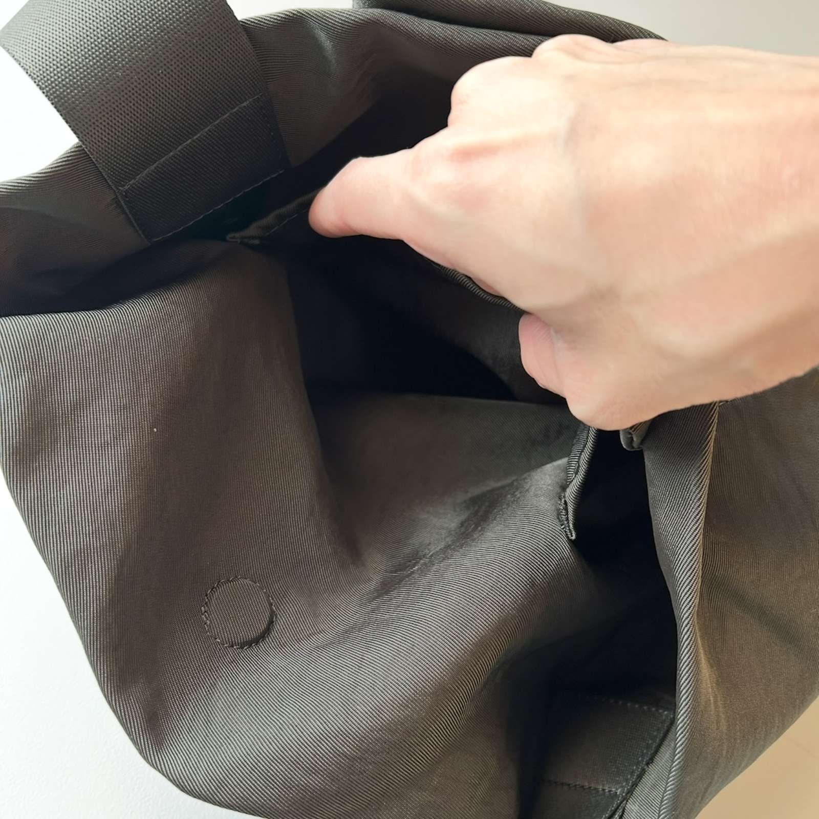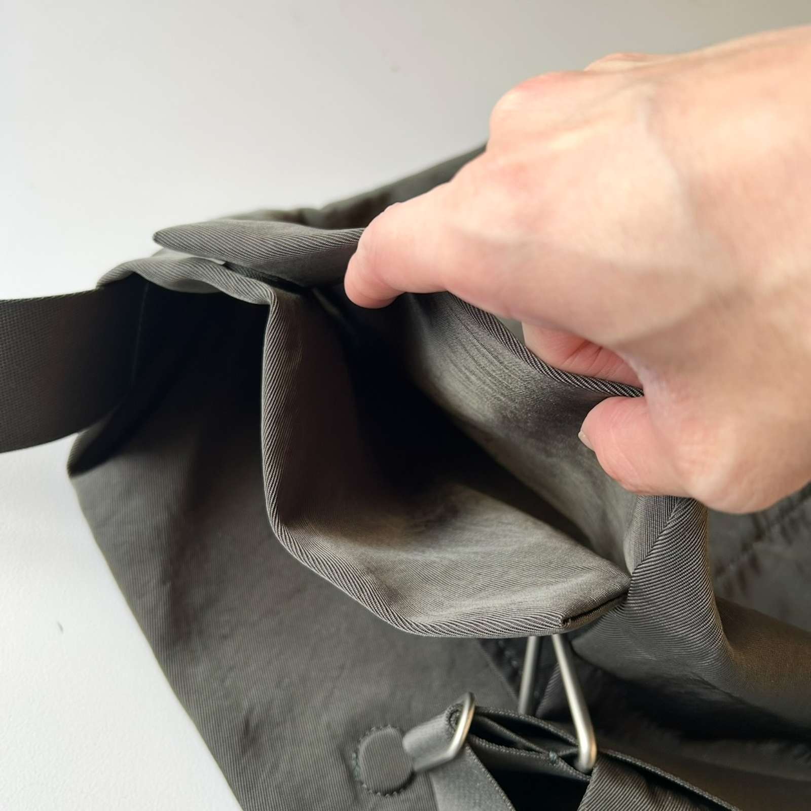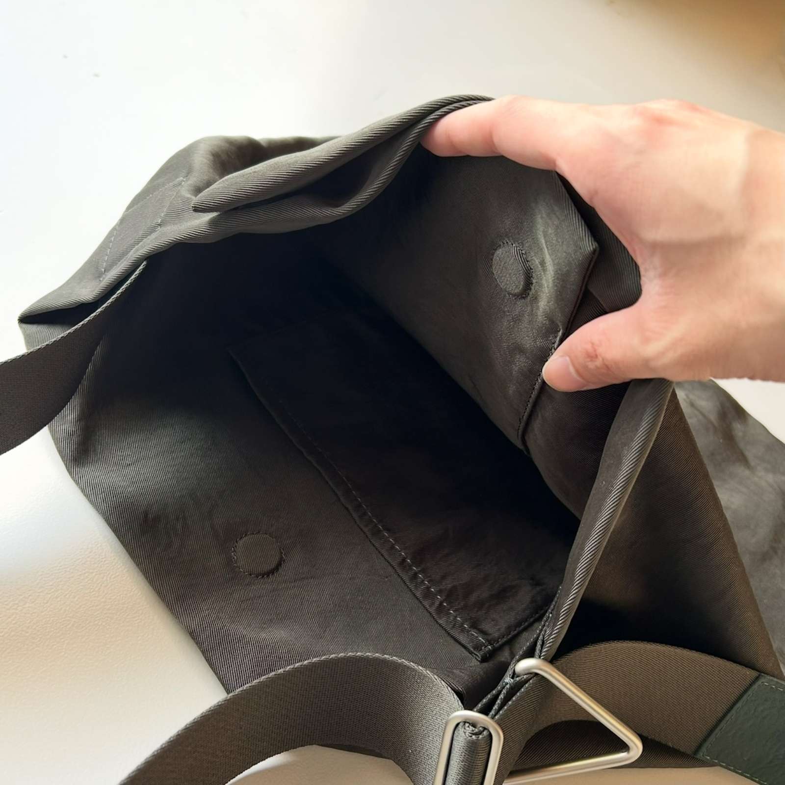 フロントはマグネットで開閉できるポケット仕様です。口元にもマグネットを配し、内側にもポケットを1つ備えています。 底にしっかりマチをとることで容量を確保。ショルダーテープの先端はレザーでまとめられ、サイドには存在感のある特大の三角カンが付きます。