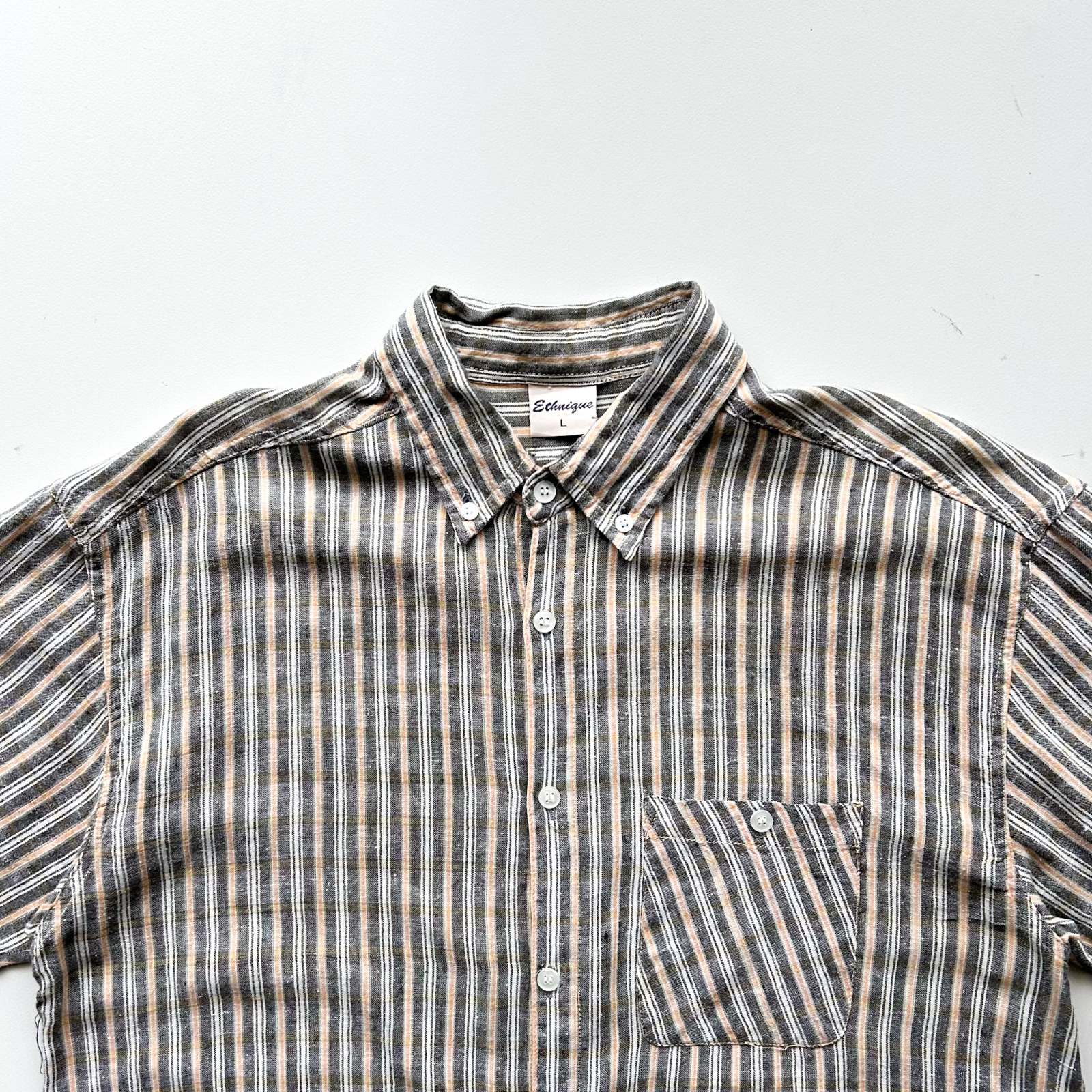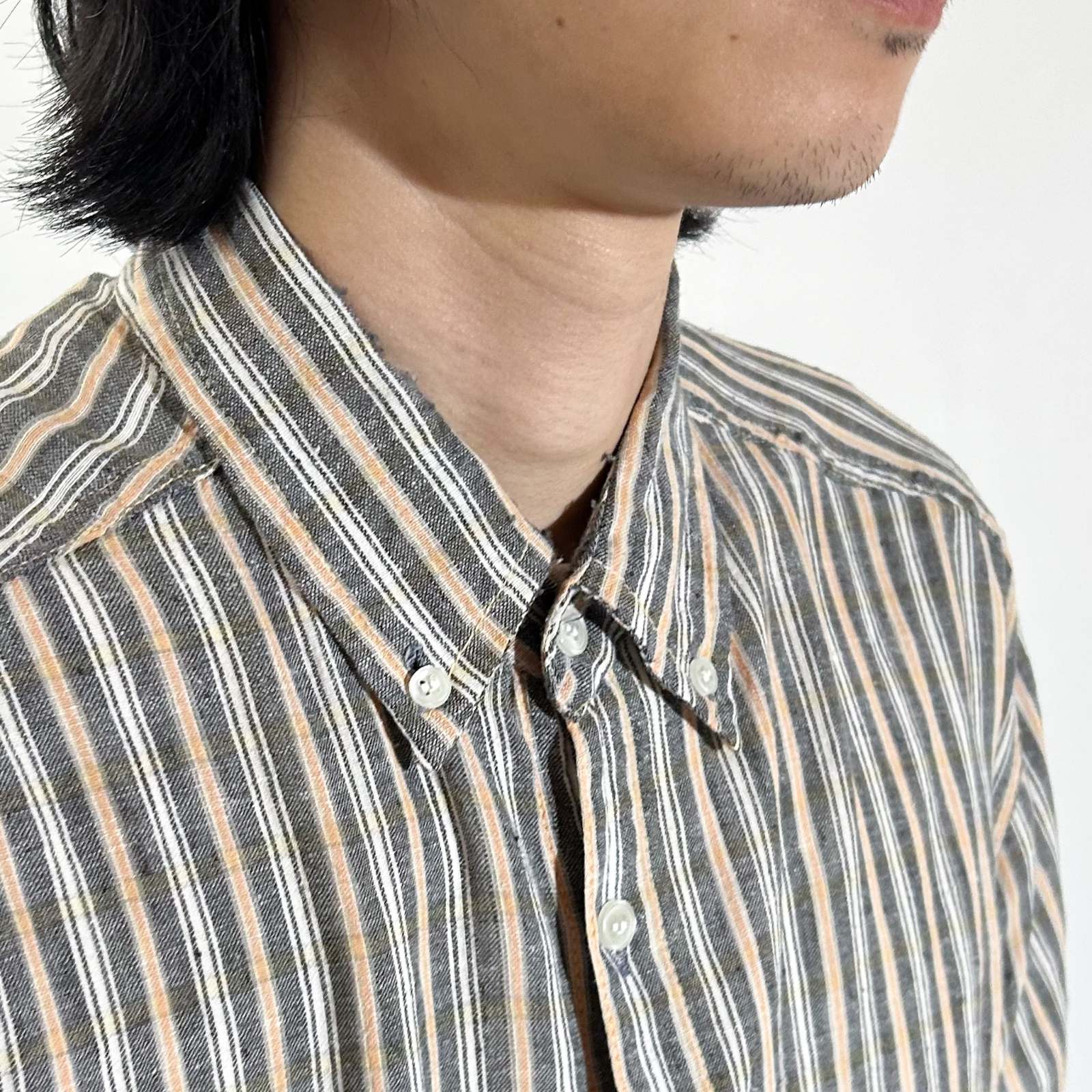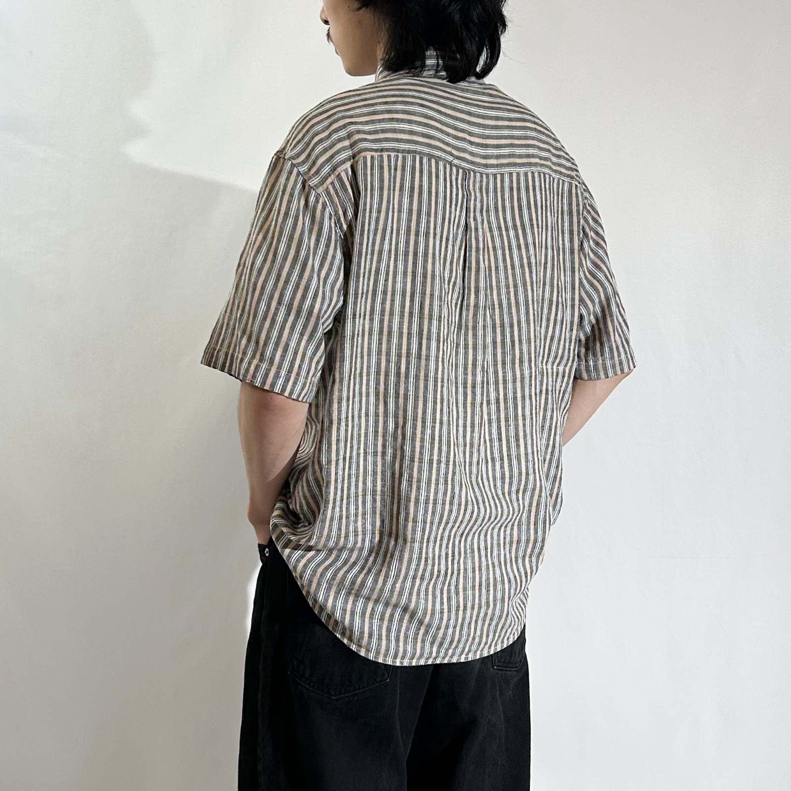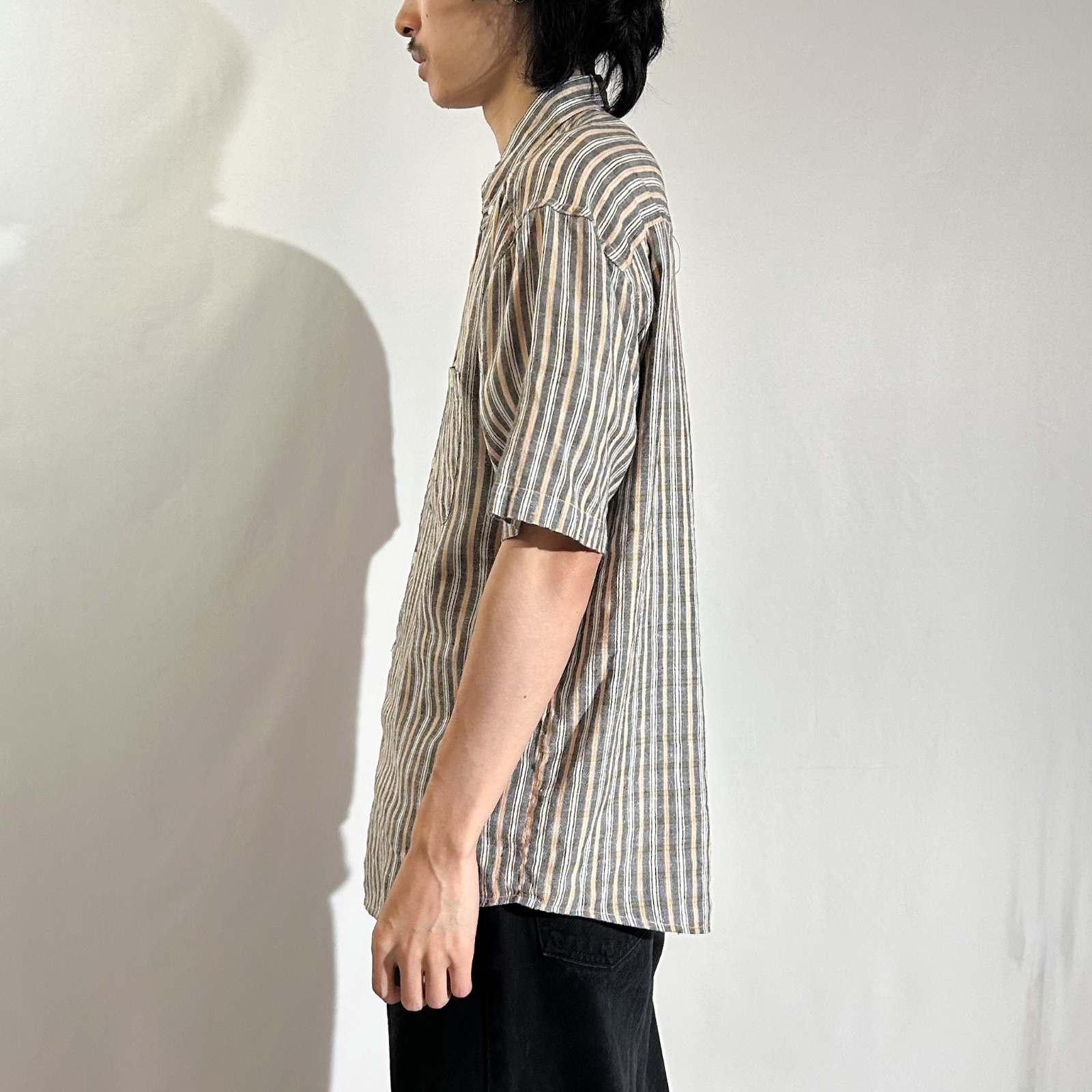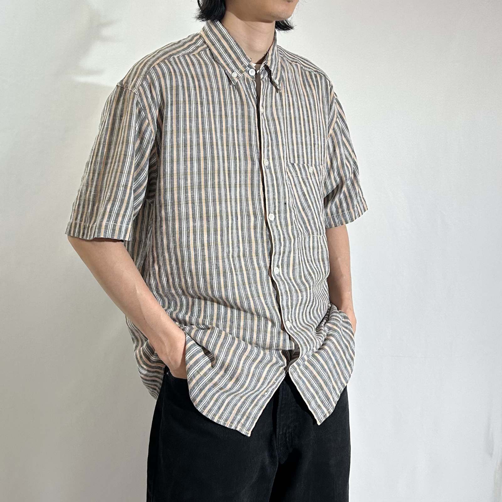 90's~ インドコットン×リネン ストライプ ボタンダウン S/Sシャツ