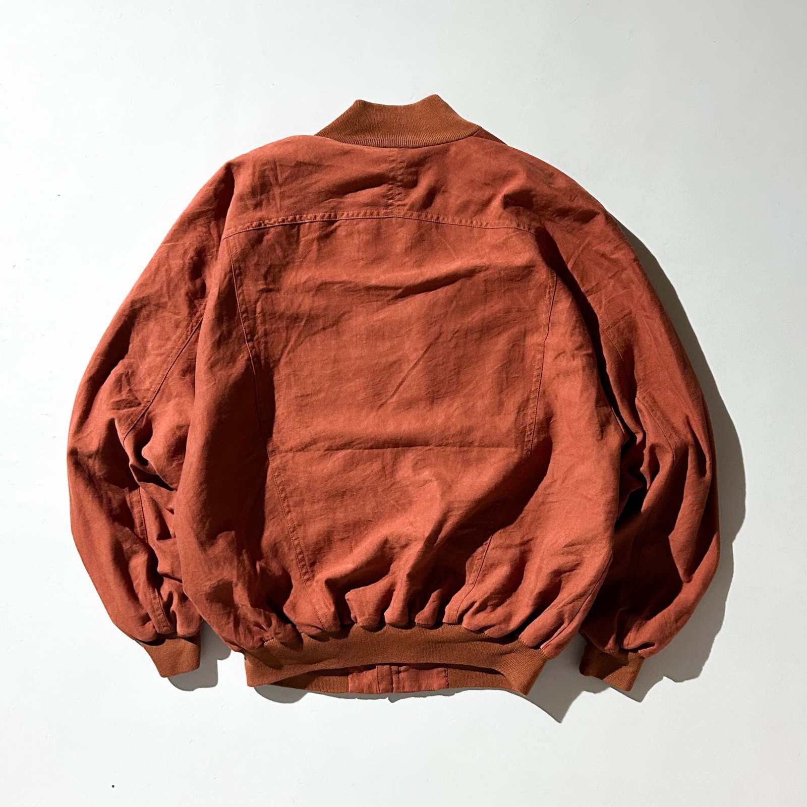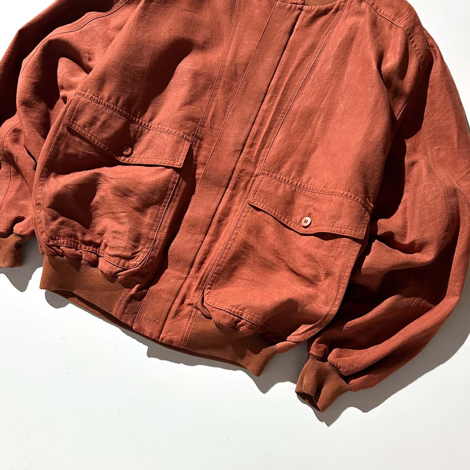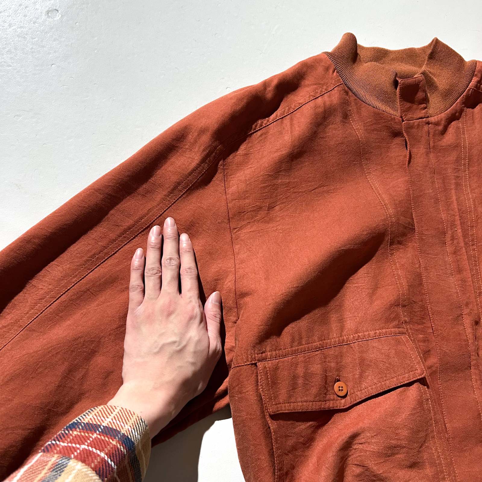 アメリカの高級ニットブランドとして知られるセントクロワから、まさかのピーチスキンブルゾンをチョイス。私物でもこのブランドを持っていますが、とにかく生地のクオリティが段違い。しなやかでドレープ感があり、着たときの“落ち”が本当に美しいです。 ニットブランドのイメージが強いですが、実はスラックスやジャケット類も非常に完成度が高い。素材選びや仕立ての良さはさすがの一言です。 こちらはアーム太め、身幅ゆったり、着丈は短丈の好バランス。今の気分にしっかりハマる神サイズ。スウェットやニットを中に着ても着膨れせず、シルエットが崩れません。 カラーは古着市場ではなかなか出てこないオレンジ。 ブラウン同様、この色味自体が本当に少ない。派手すぎない、深みのあるトーンなので意外と馴染みも良く、デニムやスラックスとも好相性。