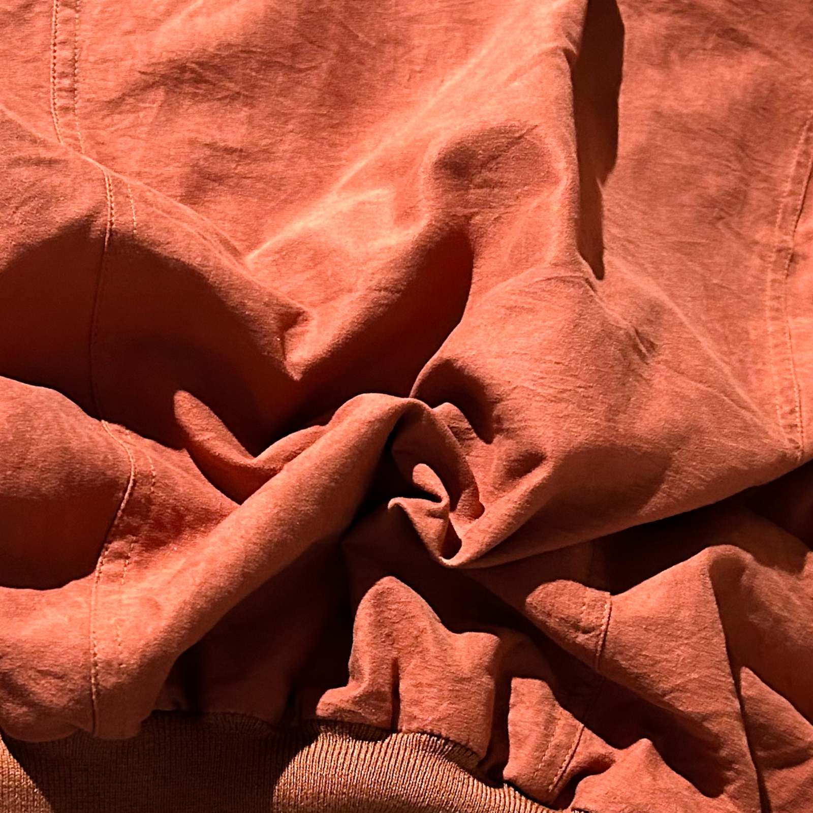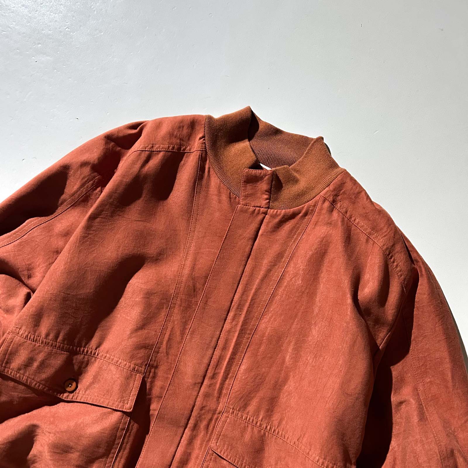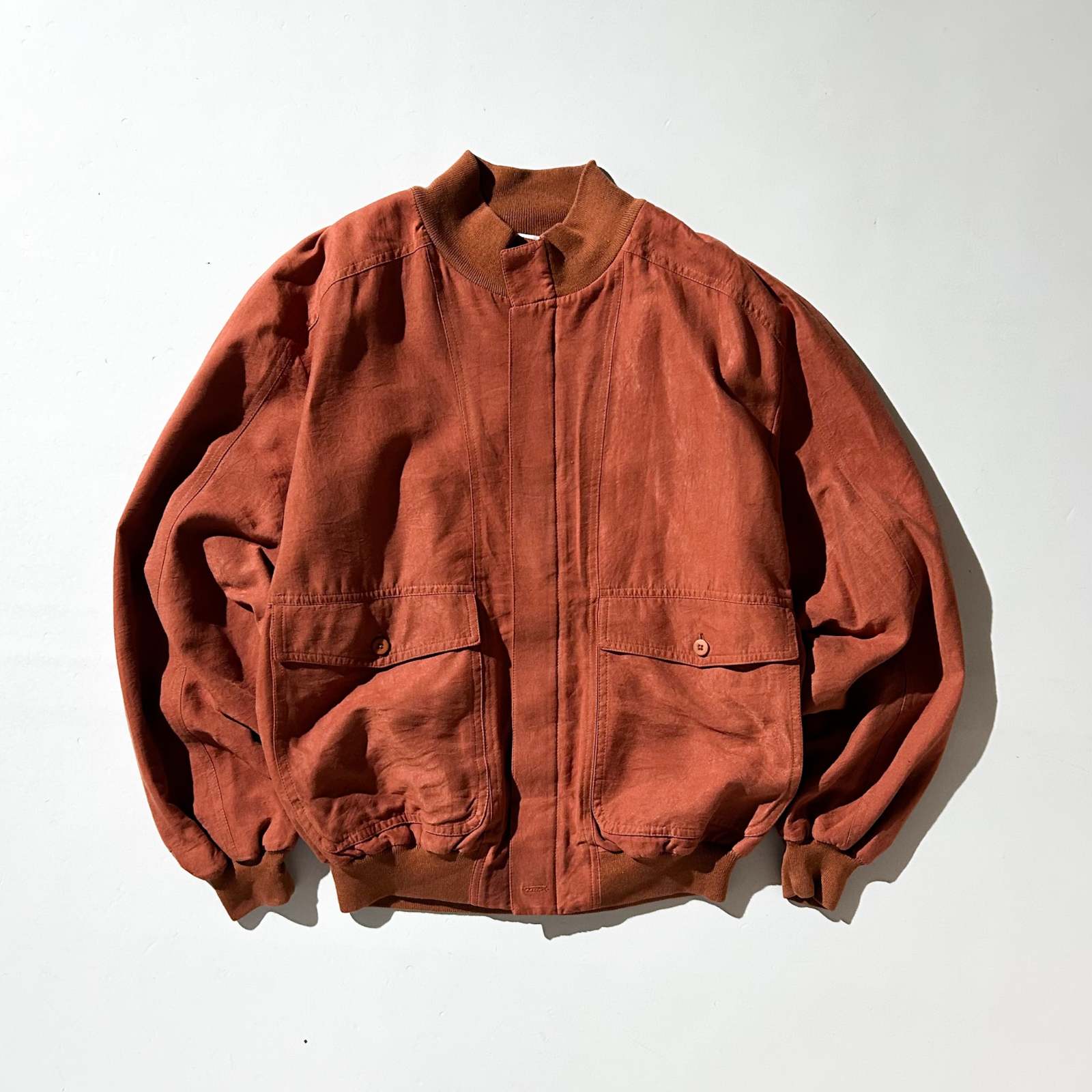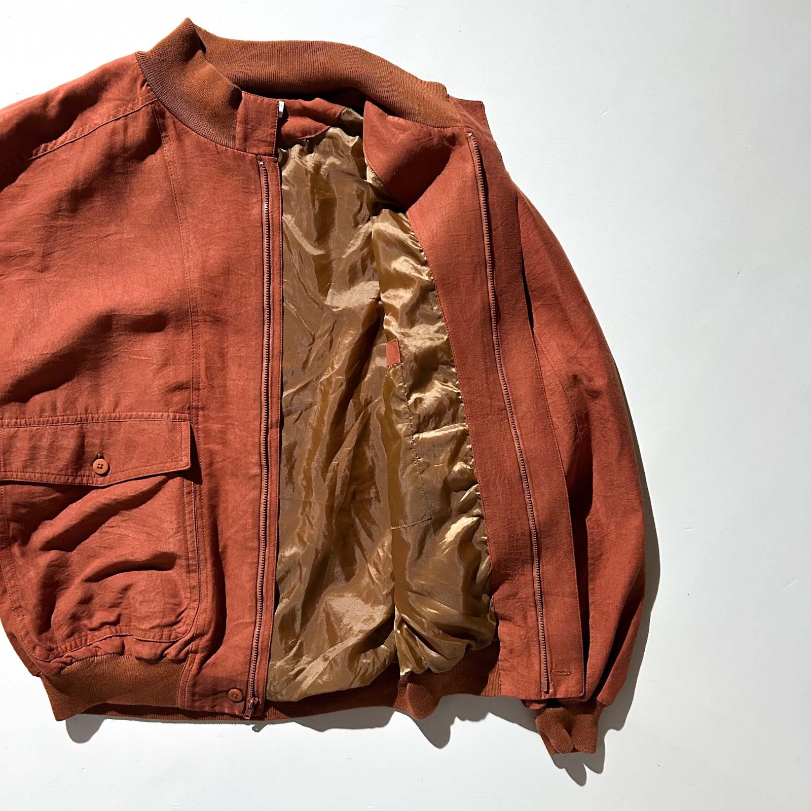 アメリカの高級ニットブランドとして知られるセントクロワから、まさかのピーチスキンブルゾンをチョイス。私物でもこのブランドを持っていますが、とにかく生地のクオリティが段違い。しなやかでドレープ感があり、着たときの“落ち”が本当に美しいです。 ニットブランドのイメージが強いですが、実はスラックスやジャケット類も非常に完成度が高い。素材選びや仕立ての良さはさすがの一言です。 こちらはアーム太め、身幅ゆったり、着丈は短丈の好バランス。今の気分にしっかりハマる神サイズ。スウェットやニットを中に着ても着膨れせず、シルエットが崩れません。 カラーは古着市場ではなかなか出てこないオレンジ。 ブラウン同様、この色味自体が本当に少ない。派手すぎない、深みのあるトーンなので意外と馴染みも良く、デニムやスラックスとも好相性。