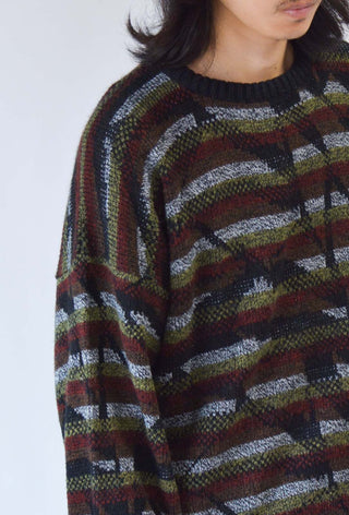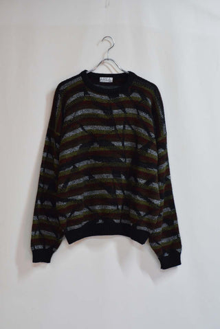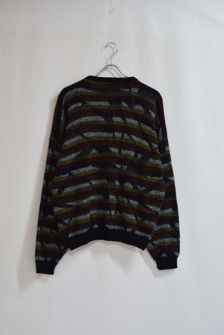 ボーダーの総柄ニットになります。 80年代らしい幾何学模様がアクセントの1着です。 アメリカ製なのも古着好きには嬉しいポイントですね。