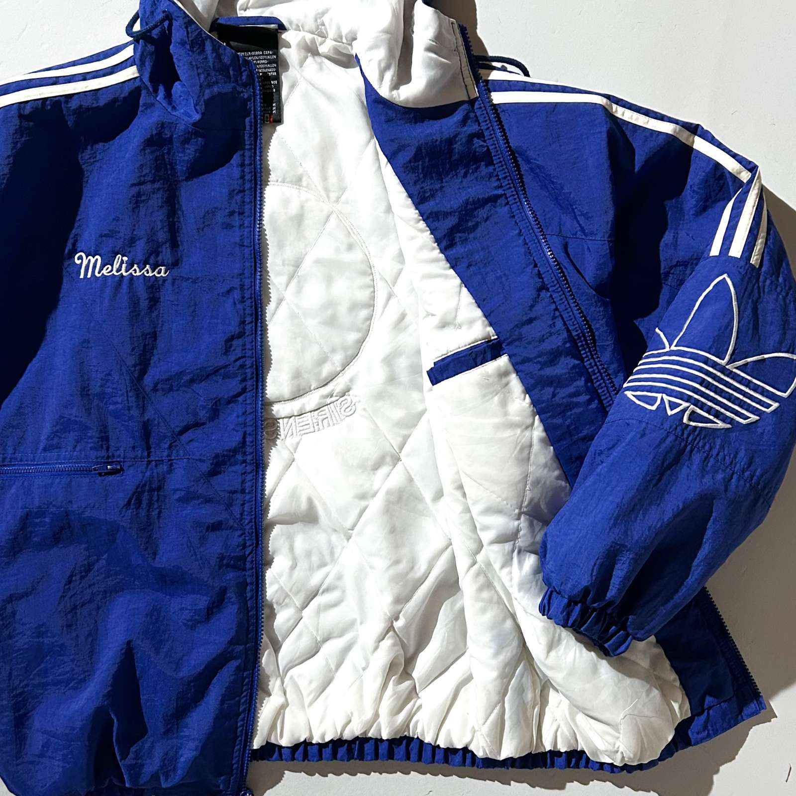 〈adidas〉のナイロン フーデッドジャケット。 ネイビーとブルーの2色展開で入荷しました。 裏地はキルティング仕様になっており、軽いのにしっかり暖かい仕上がり。 袖には大きめのトレフォイルマークが入り、 adidasらしい3本ラインが映えるデザイン。 シルエットは身幅たっぷり・着丈60cm前半で留まる短丈バランス。 アーム幅もかなり広めで、スウェット・ニット・厚手インナーなど どんなアイテムを中に着ても着膨れしない安心感のあるサイズ感です。 ストリートにもスポーツMIXにもハマる万能な1着。