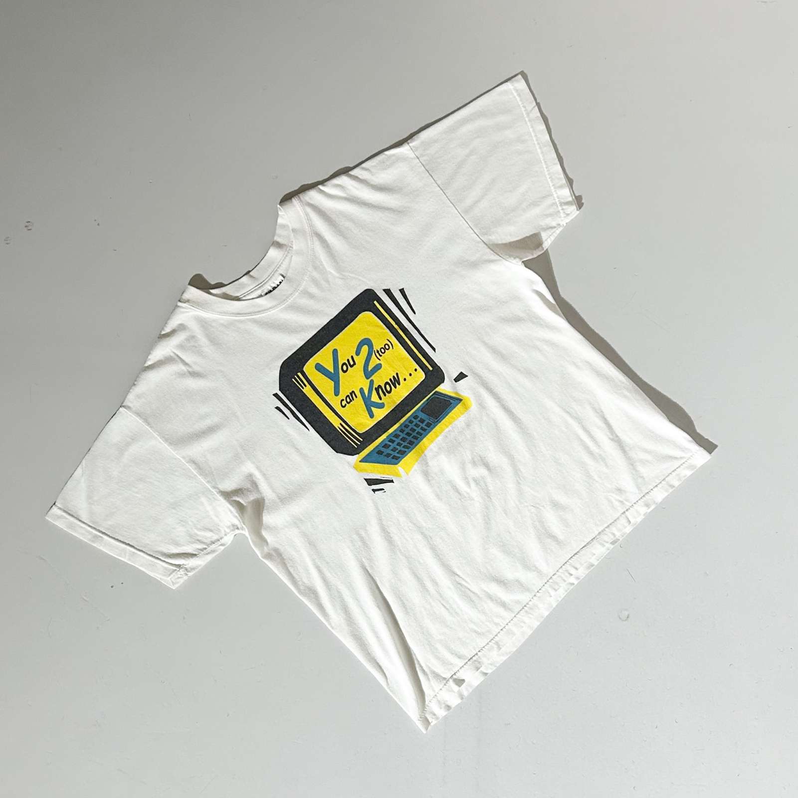 フロントは「Y2K(you too can know⋯)」というメッセージの入るポップなデザイン。 バックプリントはジーザス系。フロントプリントからは想像できないデザインで、両面楽しめるGoodなTシャツ。