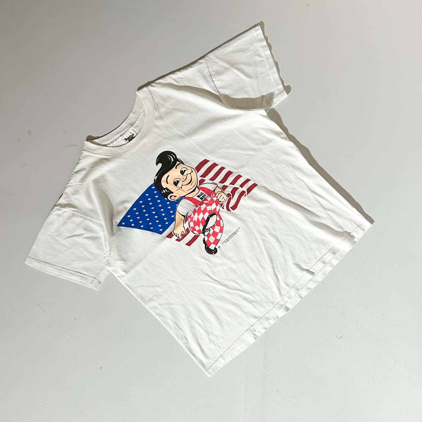 ビックボーイのTシャツになります。 ビックボーイのマスコットキャラクターの彼。 名前は「ボビーくん」。アメリカらしいプリントデザインで◎、アメカジのファッションのお供にいかが??