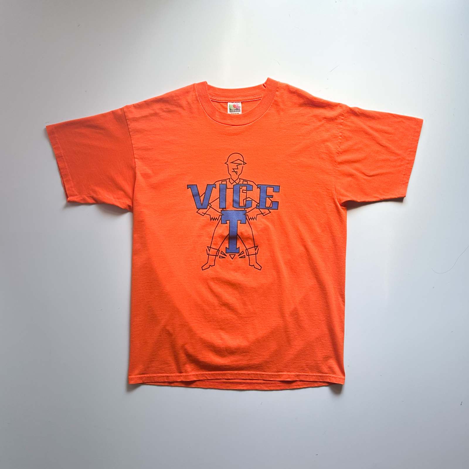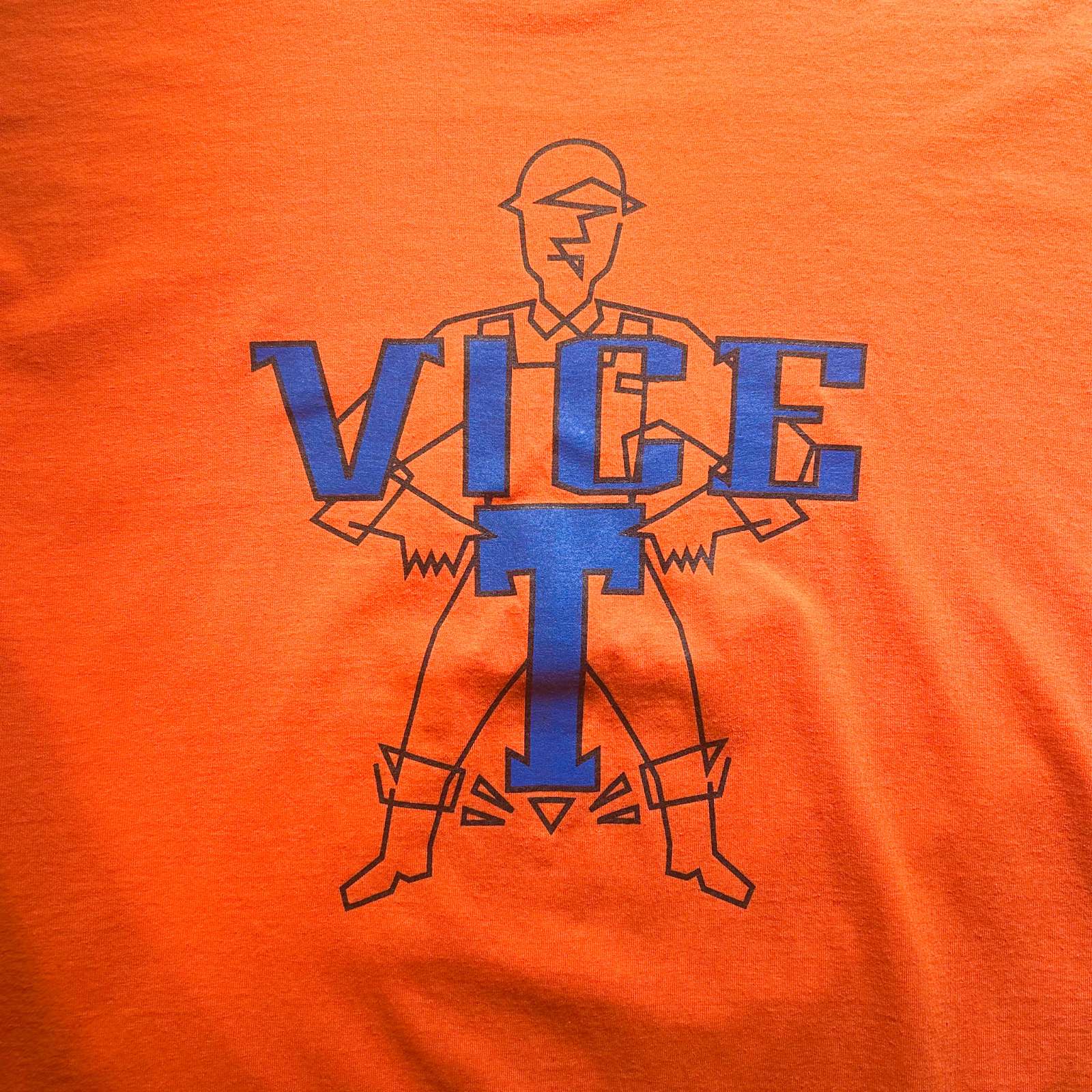 調べてみましたが、結局なんのTシャツかが見つからず。シンプルにノリがいいからおすすめしたい1枚。Tをドリル?に見立てたユーモアのあるフロント、スラングで"悪徳"や"悪癖"を意味するVICEが好バランス。なんのも大事ですが、なんだか好きだなって感覚が大事かと。Tシャツを選ぶときはなおのこと、それでよし。むしろそれが良いですね。