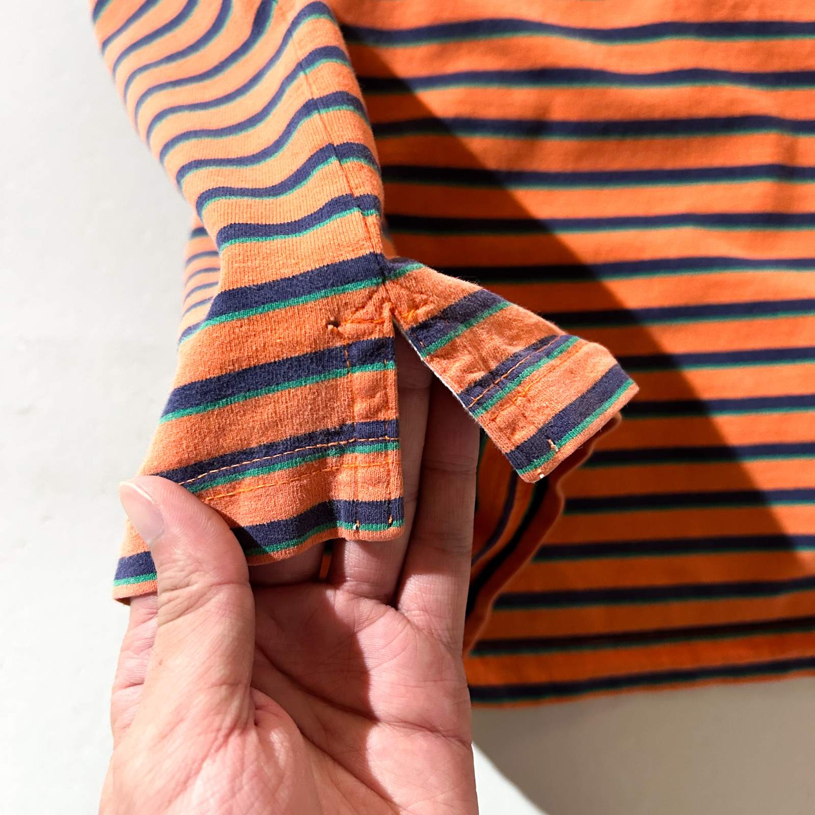 Bランク 裾スリット小穴、脇に色褪せ、首元ステッチ抜けが見られます