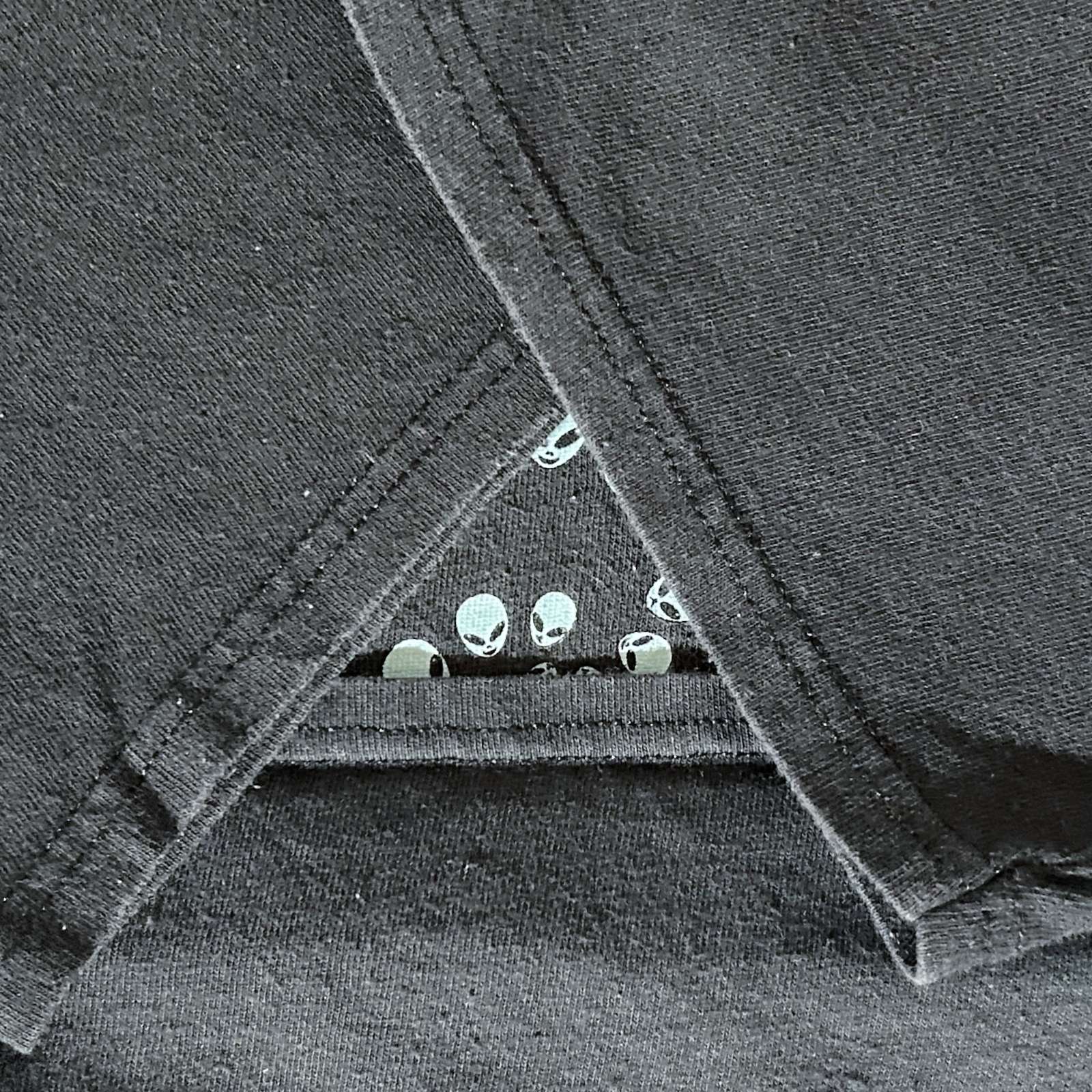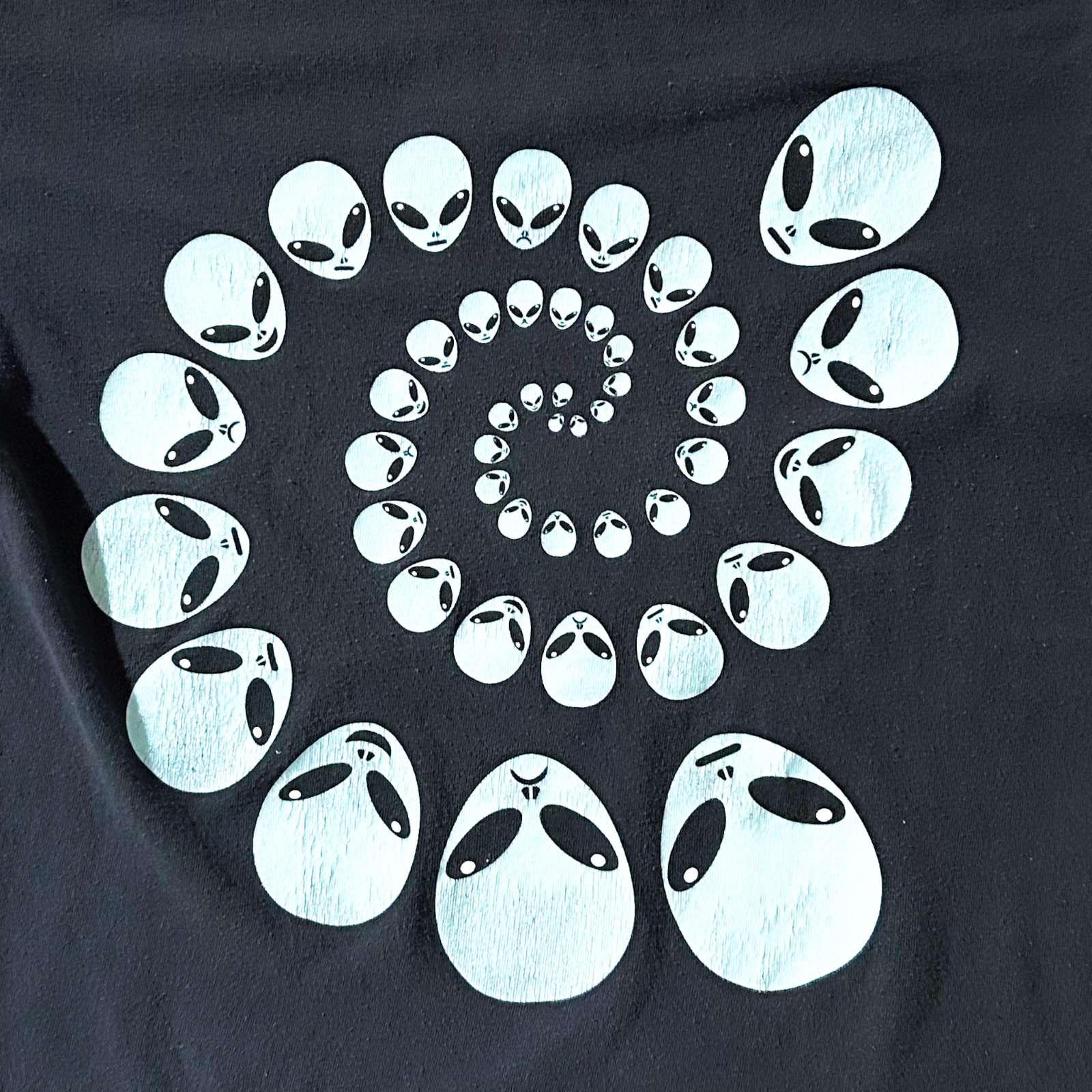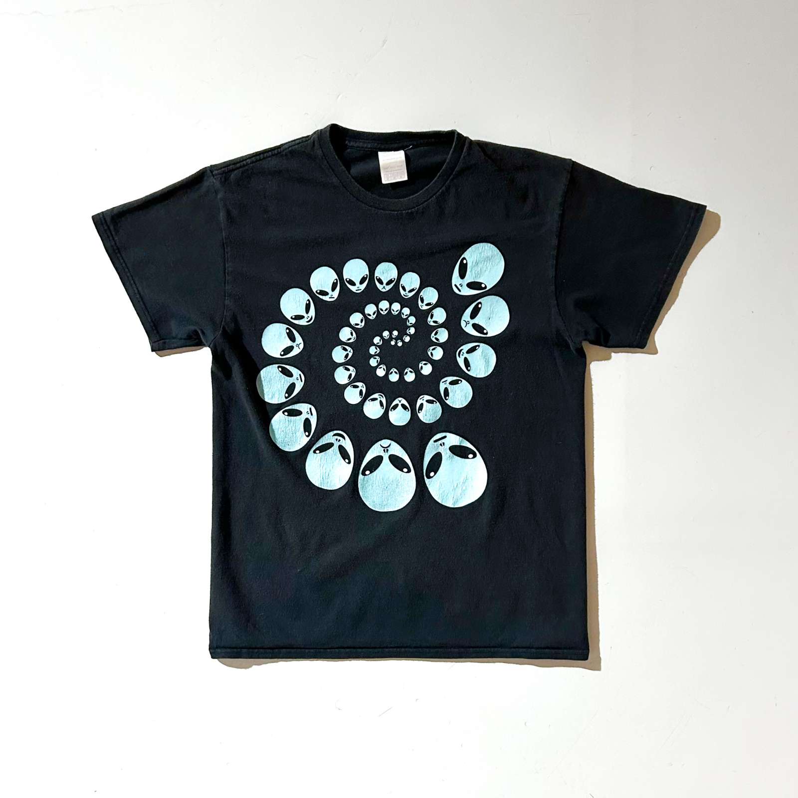 未知との遭遇をファッションに。 Tシャツ全面に描かれたエイリアンの顔が、螺旋状に歪みながら迫ってくるインパクト大のデザイン。 サイケデリックアートやSF映画を思わせる独特の世界観は、見る角度によって印象が変化します。 個性的なプリントは、ストリートファッションやフェスコーデのアクセントにも最適です。