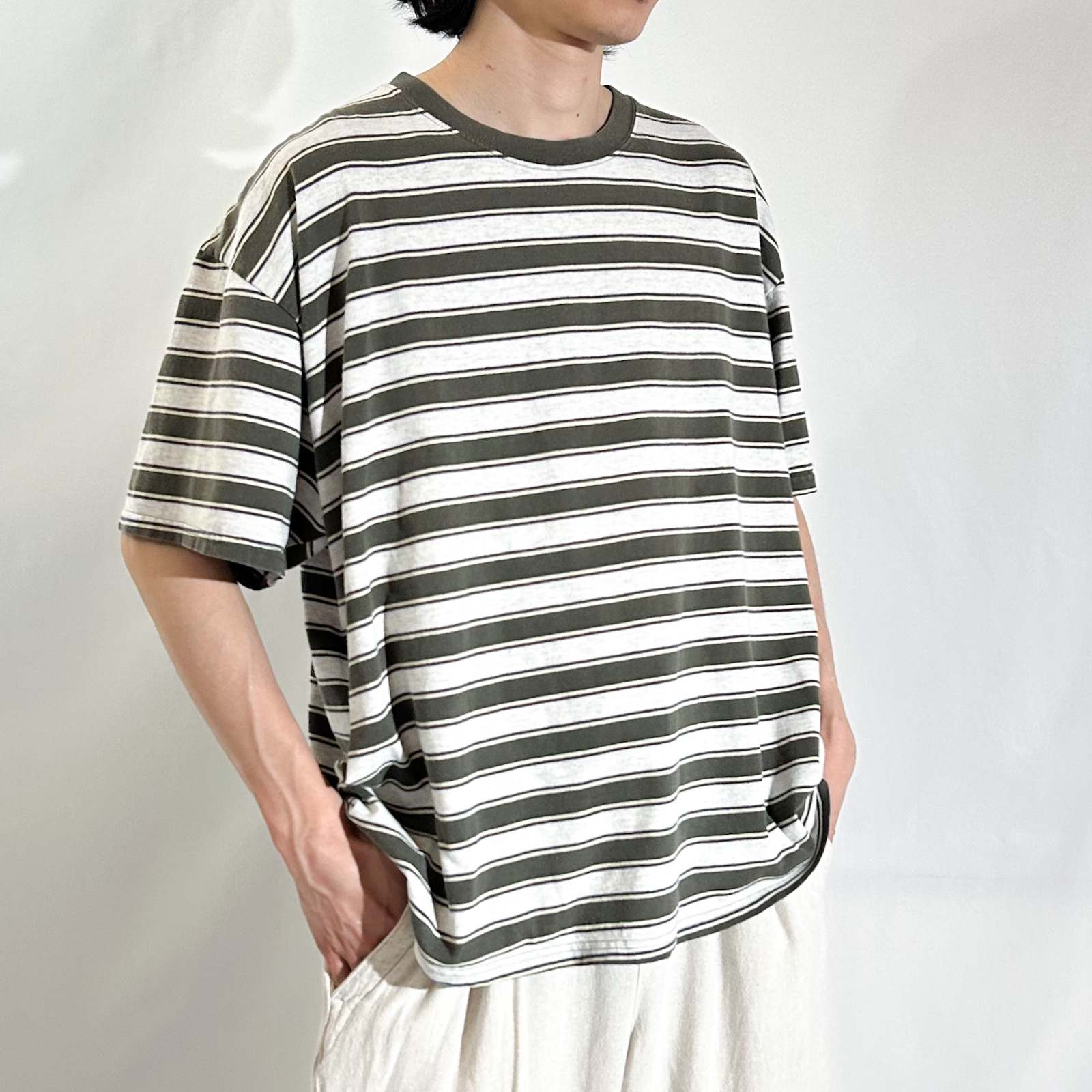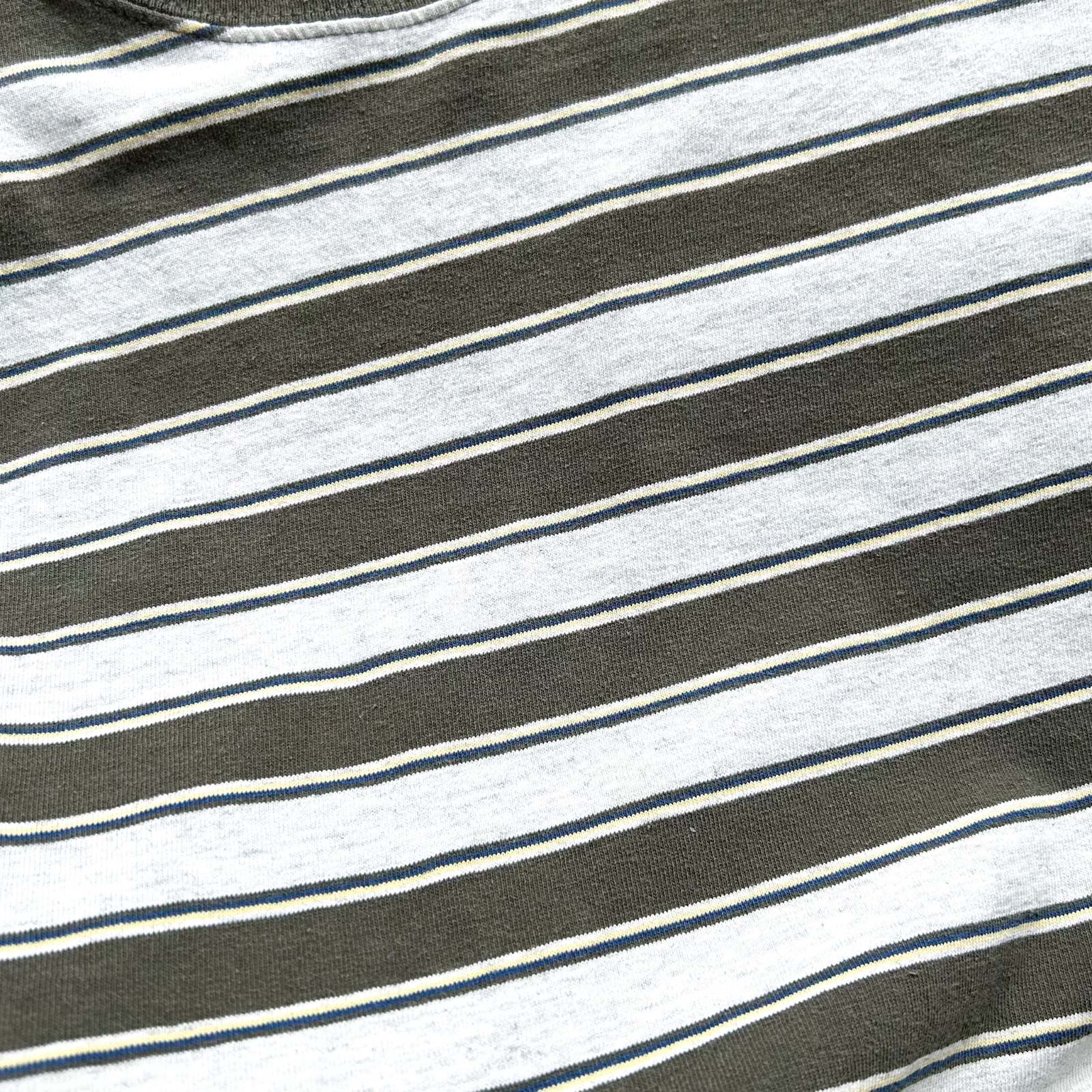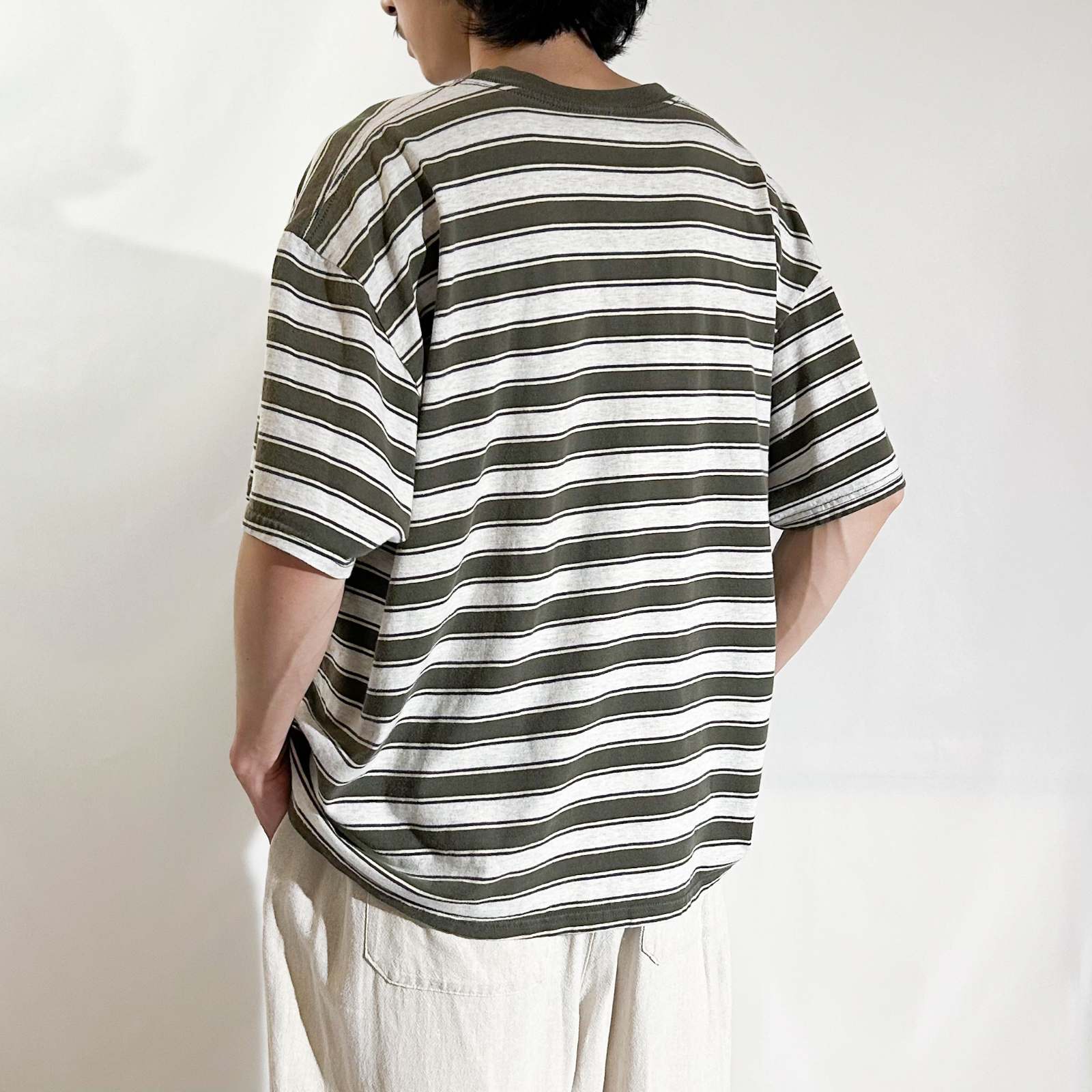 【Webスタッフ齋藤のおすすめ商品】ボーダーTシャツでオススメしたブランドの一つpuritan。puritanのボーダーTシャツって90年代ってこともあってシルエットがボックスでバランスがいいんですよね。緑とグレーのマルチなボーダーの感じも個人的に好きです。