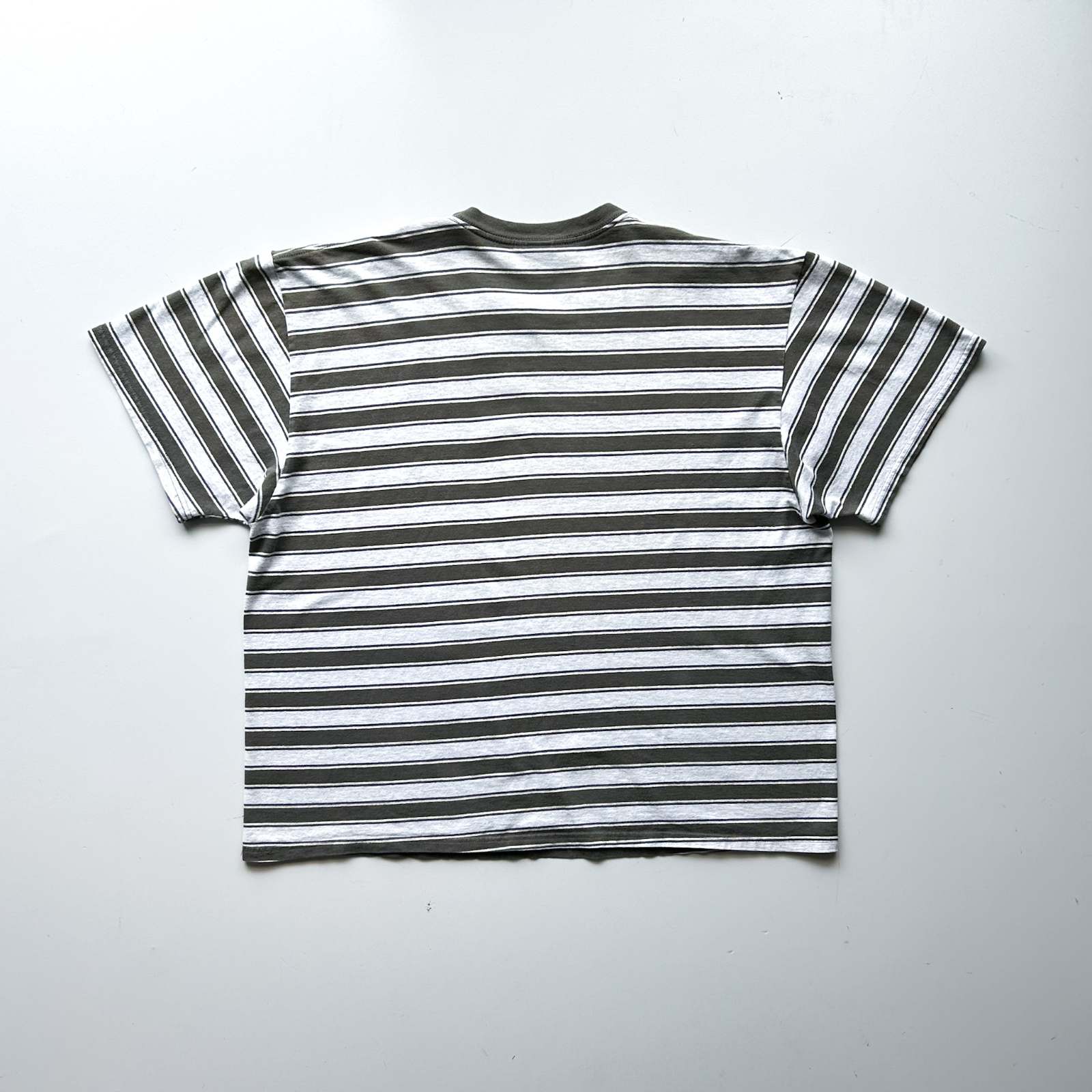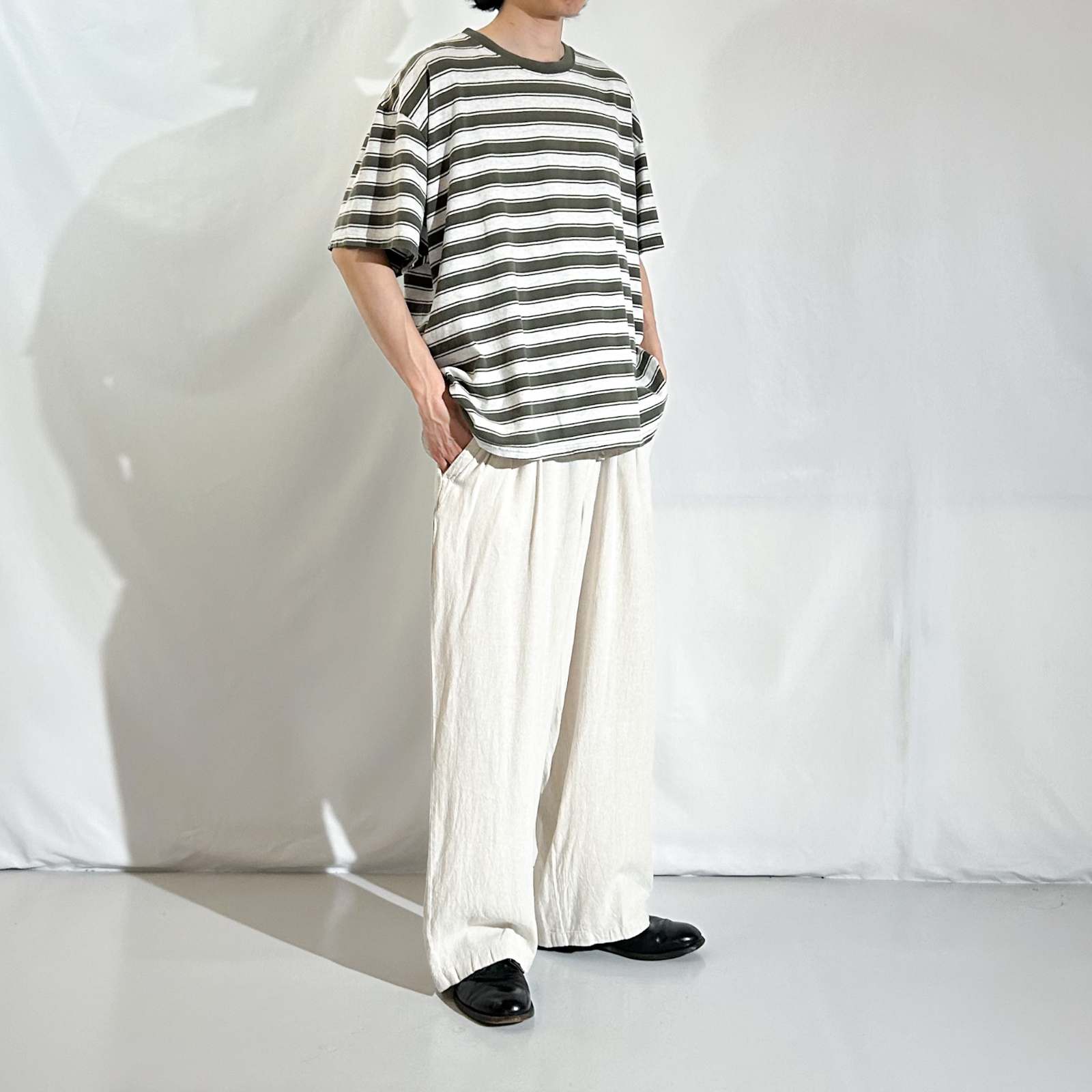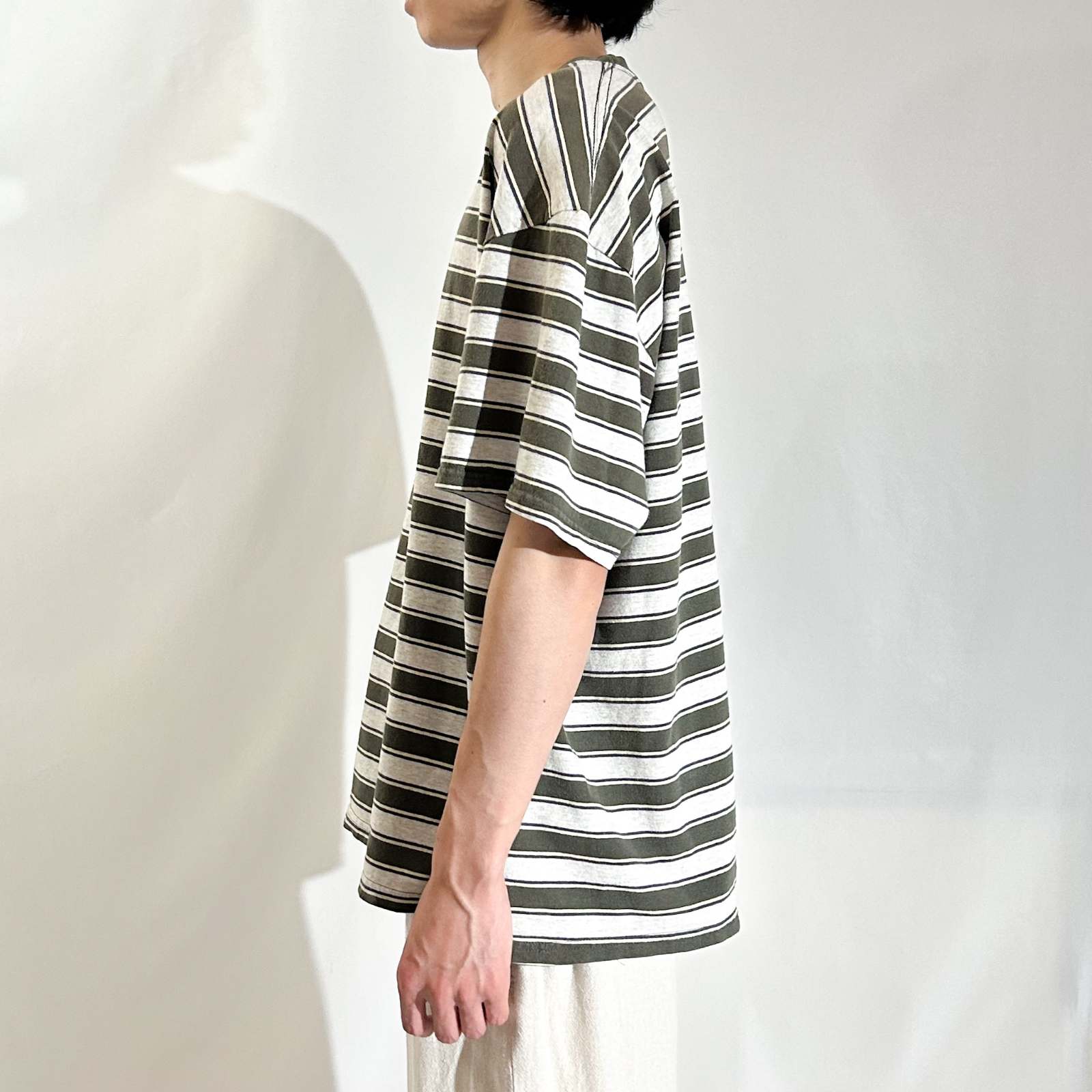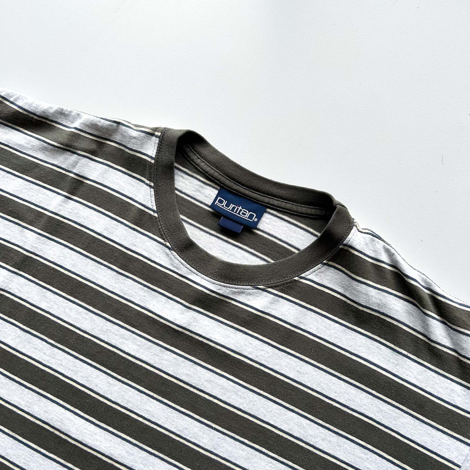 【Webスタッフ齋藤のおすすめ商品】ボーダーTシャツでオススメしたブランドの一つpuritan。puritanのボーダーTシャツって90年代ってこともあってシルエットがボックスでバランスがいいんですよね。緑とグレーのマルチなボーダーの感じも個人的に好きです。