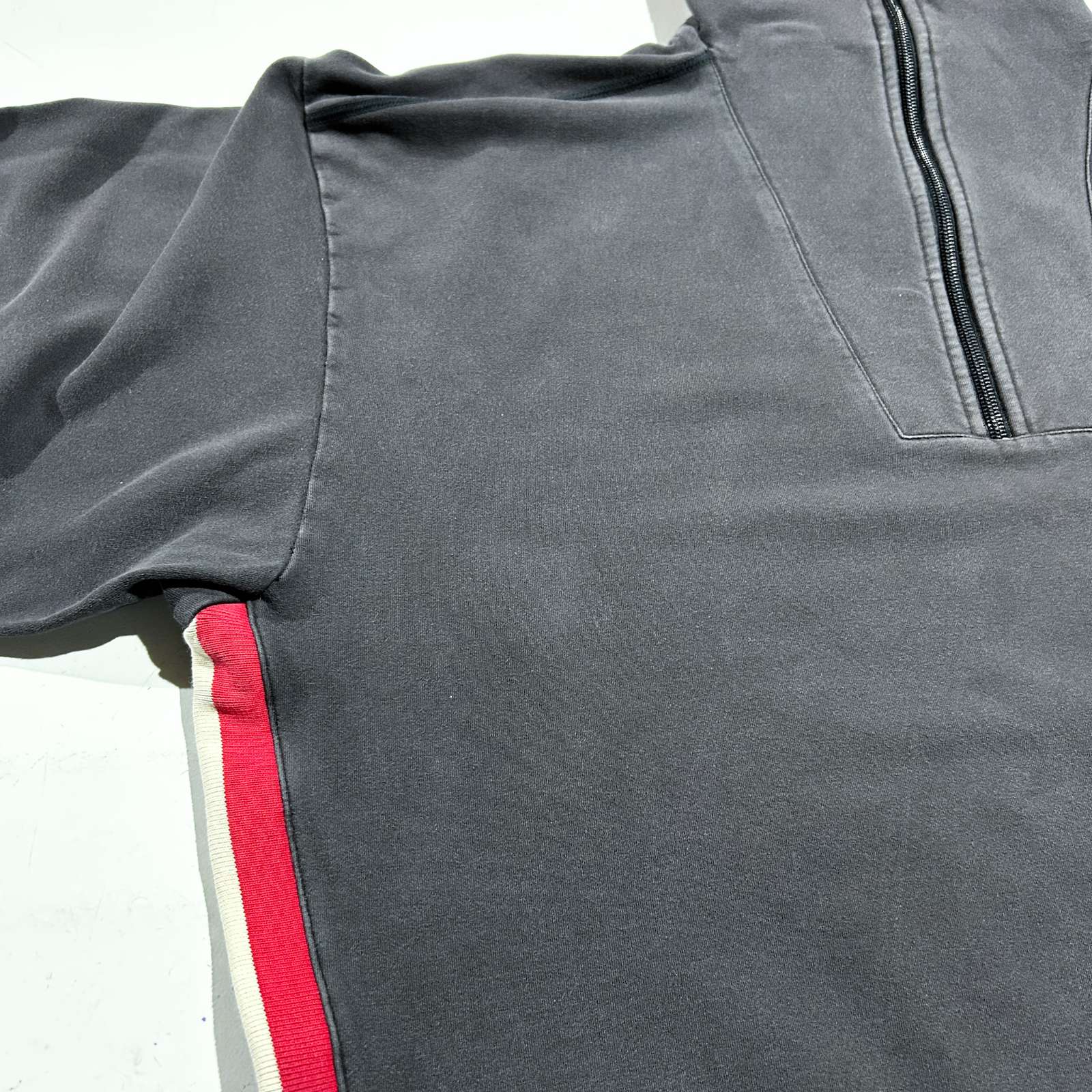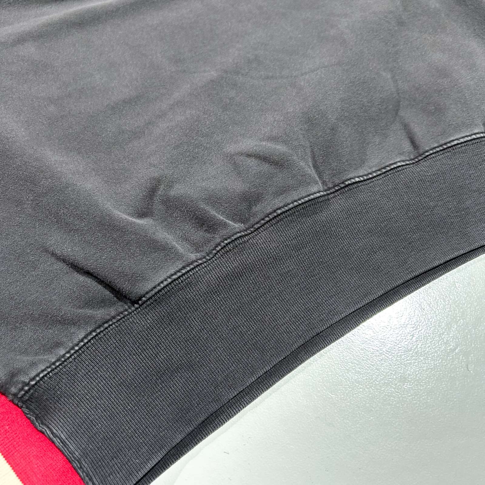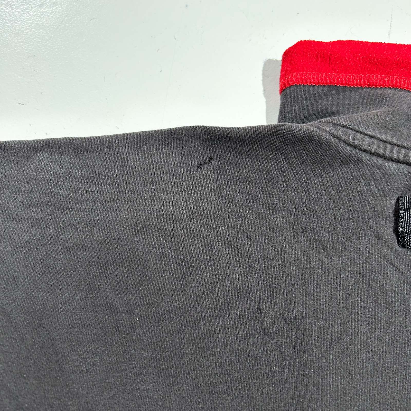 〈NAUTICA COMPETITION〉から、ブランドらしいスポーティなデザインのスウェットが入荷。 赤×白×ブラックをサイドリブに落とし込んだ、ストリートにも映えるカラーコントラストが魅力です。 ハイネック部分はフリース切替になっており、デザイン性だけでなく保温性も◎。 ボディはおそらくコットンポリ素材で、柔らかく肌馴染みの良い生地感。 フェードしたような墨黒のボディカラーが、程よくこなれた雰囲気を演出してくれます。 胸元には控えめなブランド刺繍ロゴ入り。