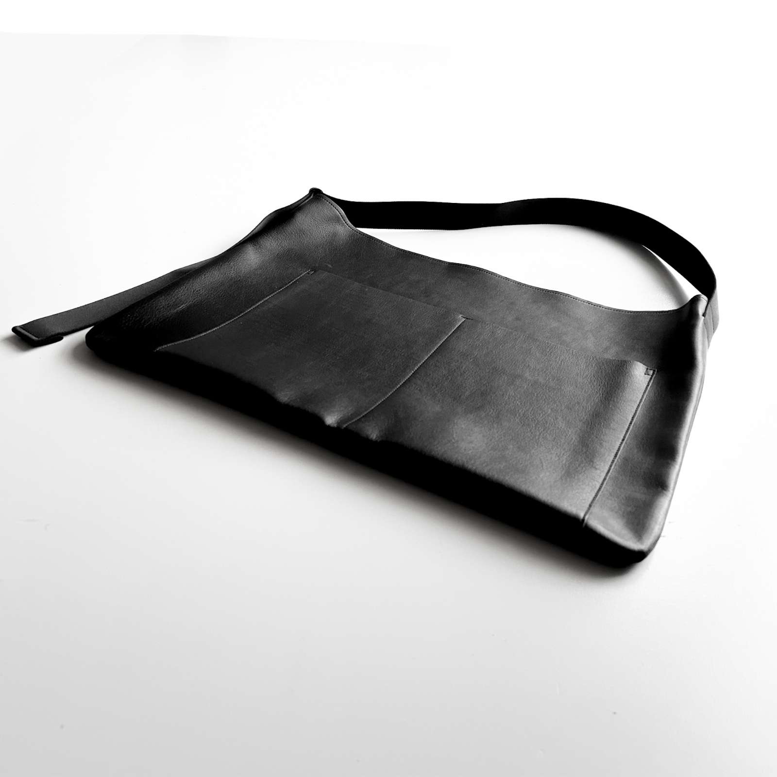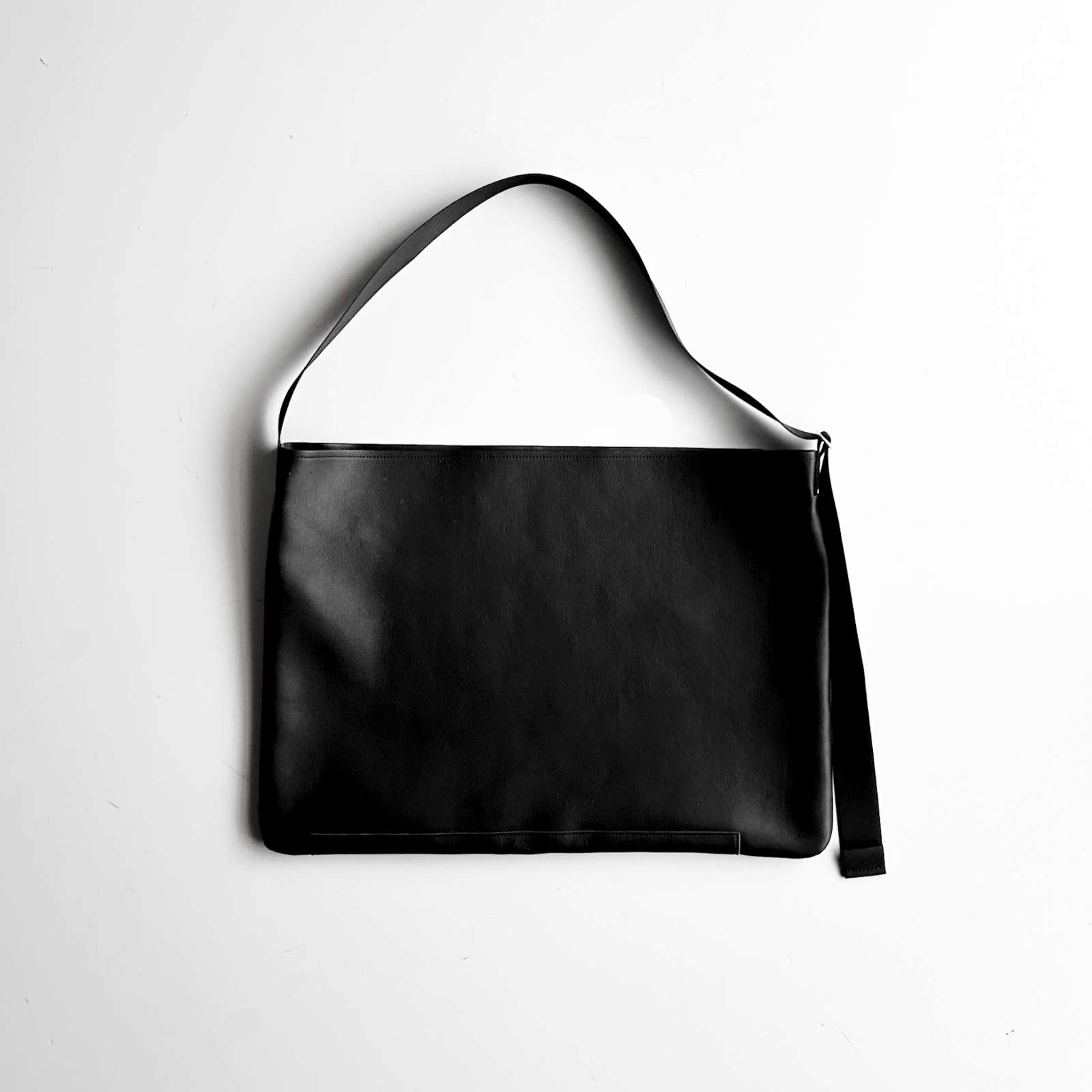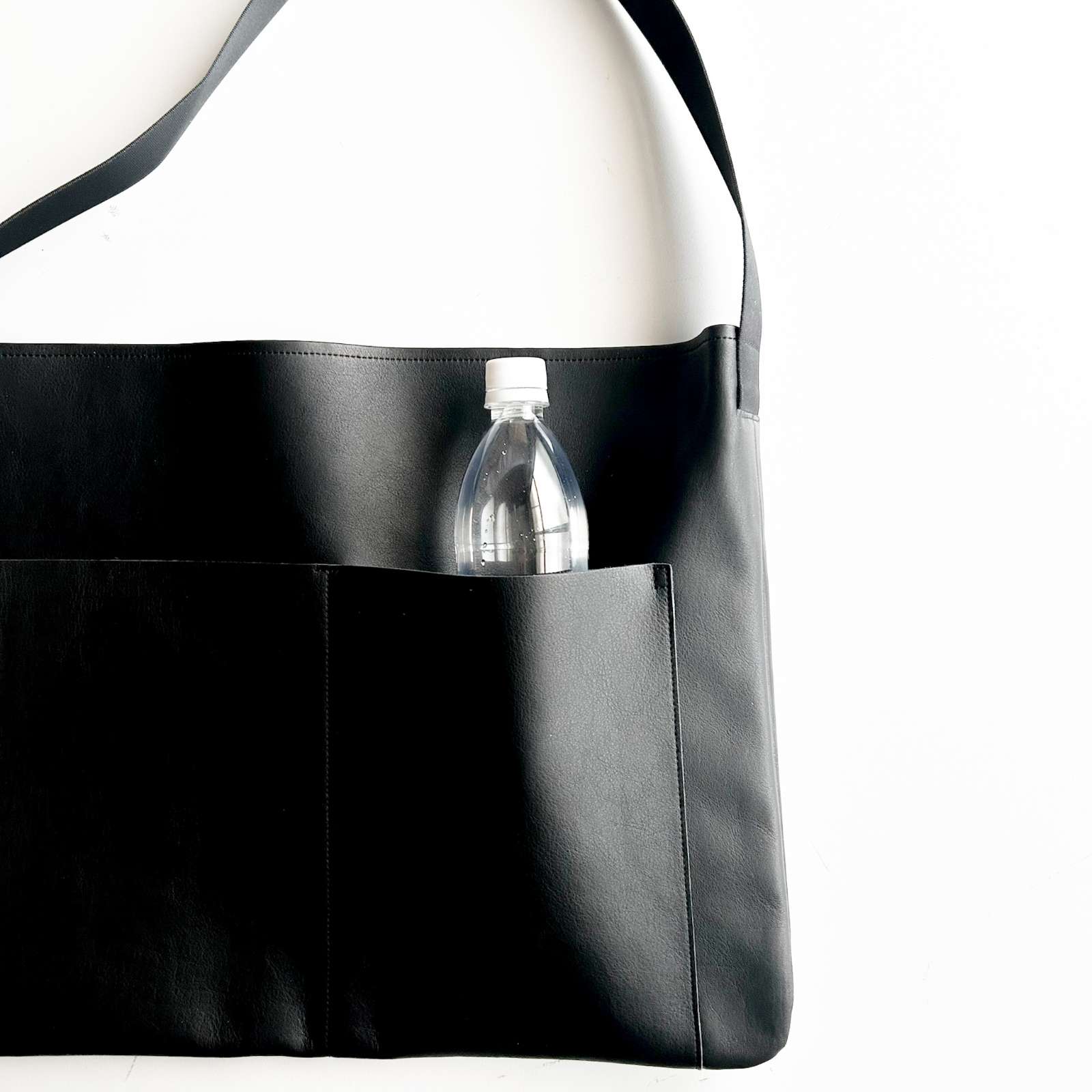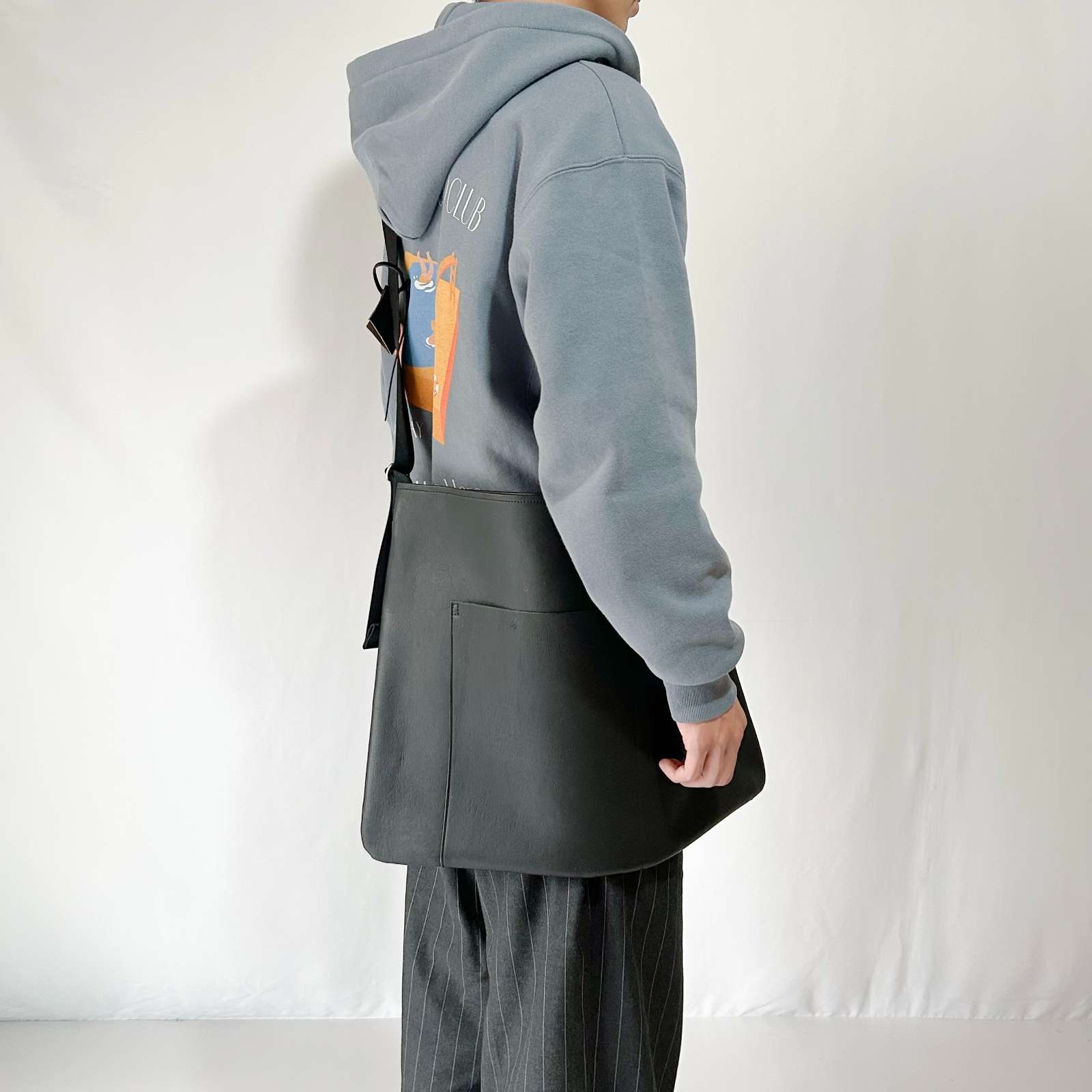 日本国内の最高級カウレザーを使用したショルダーバッグ。B3サイズまですっぽり入る大きなメインポケットと中心からあえてずらした500mlのペットボトルも収納できる深めなポケットが2つ付いています。柔らかな革質と独自のデザインにより、体のラインに沿うように着用が出来るので鞄がかさばることもありません。
