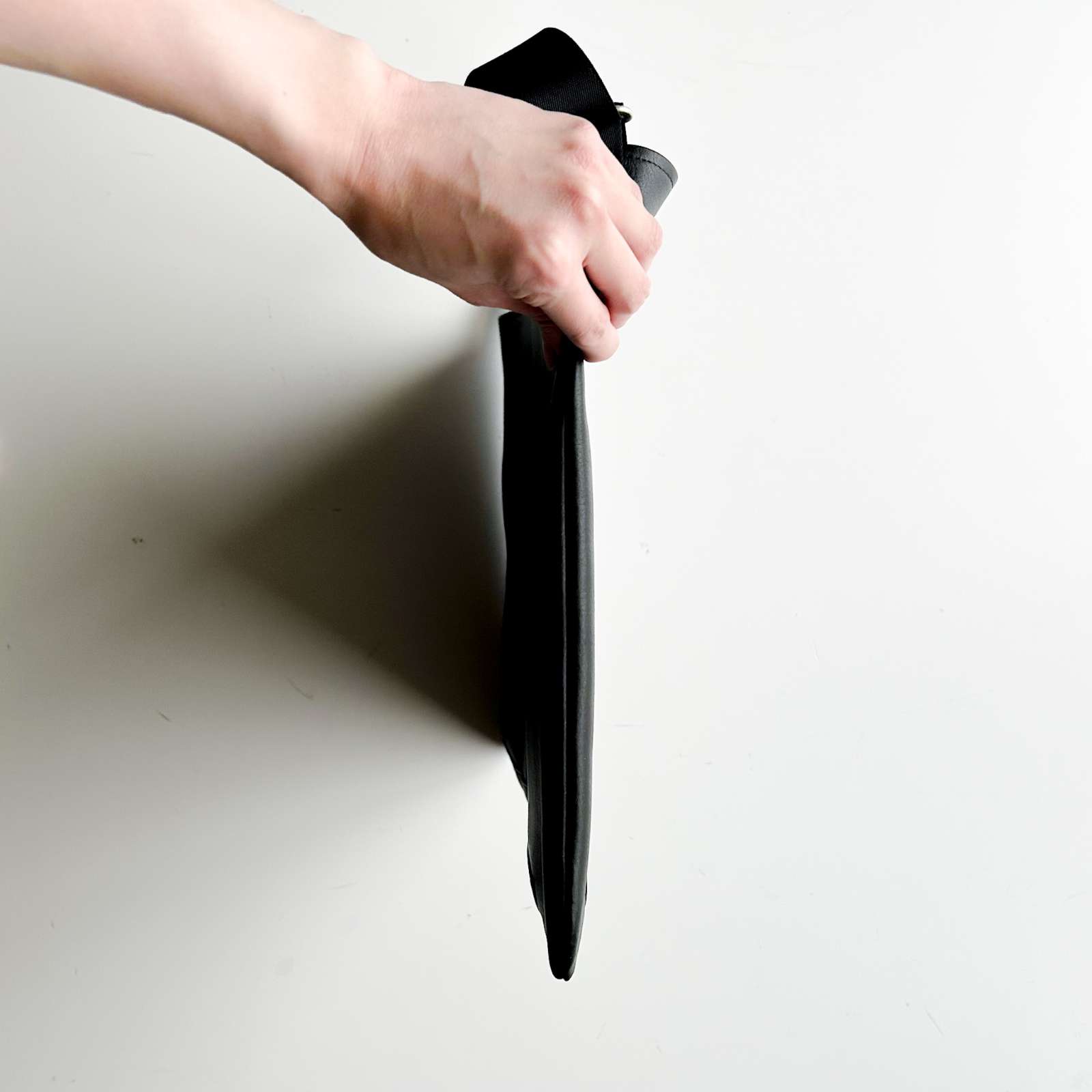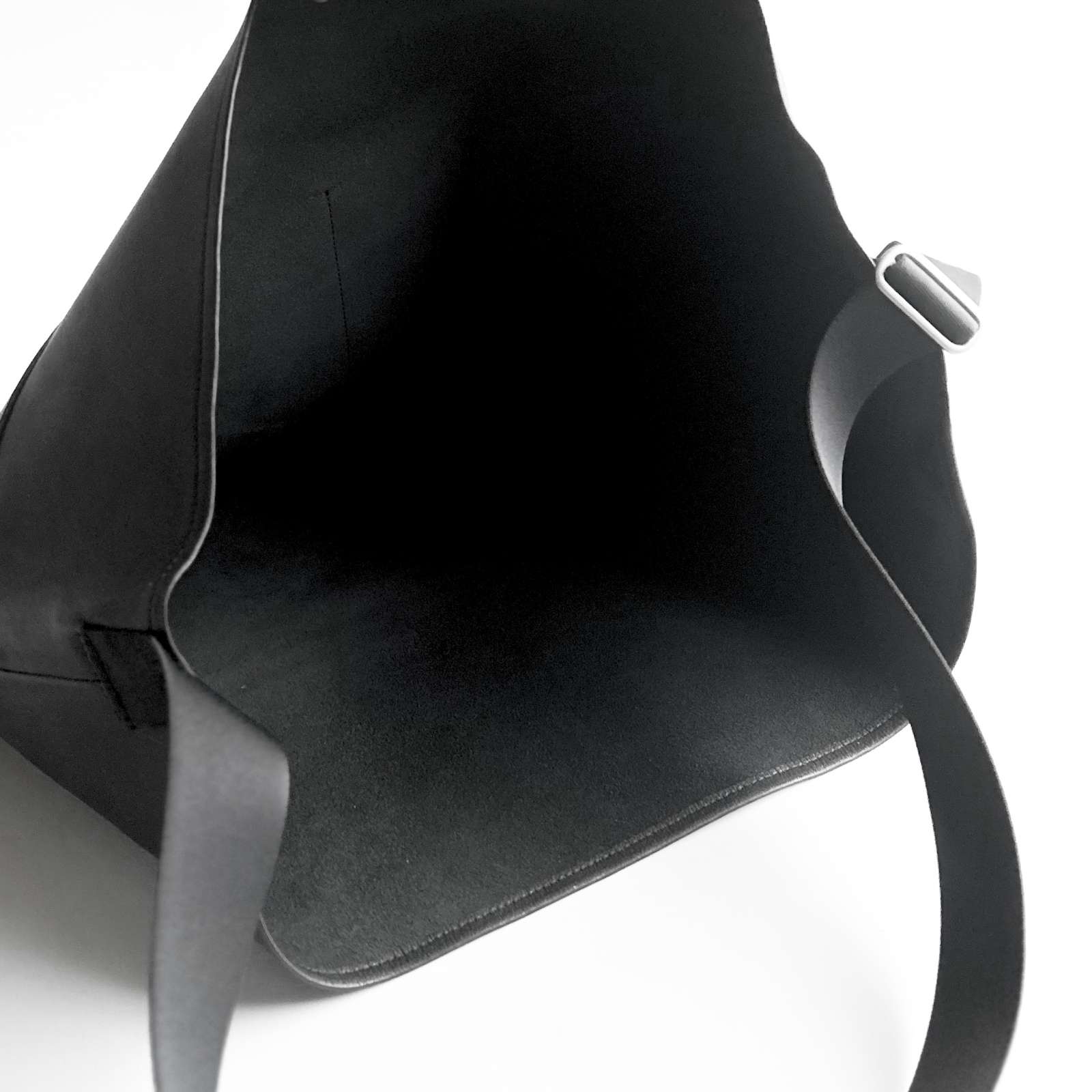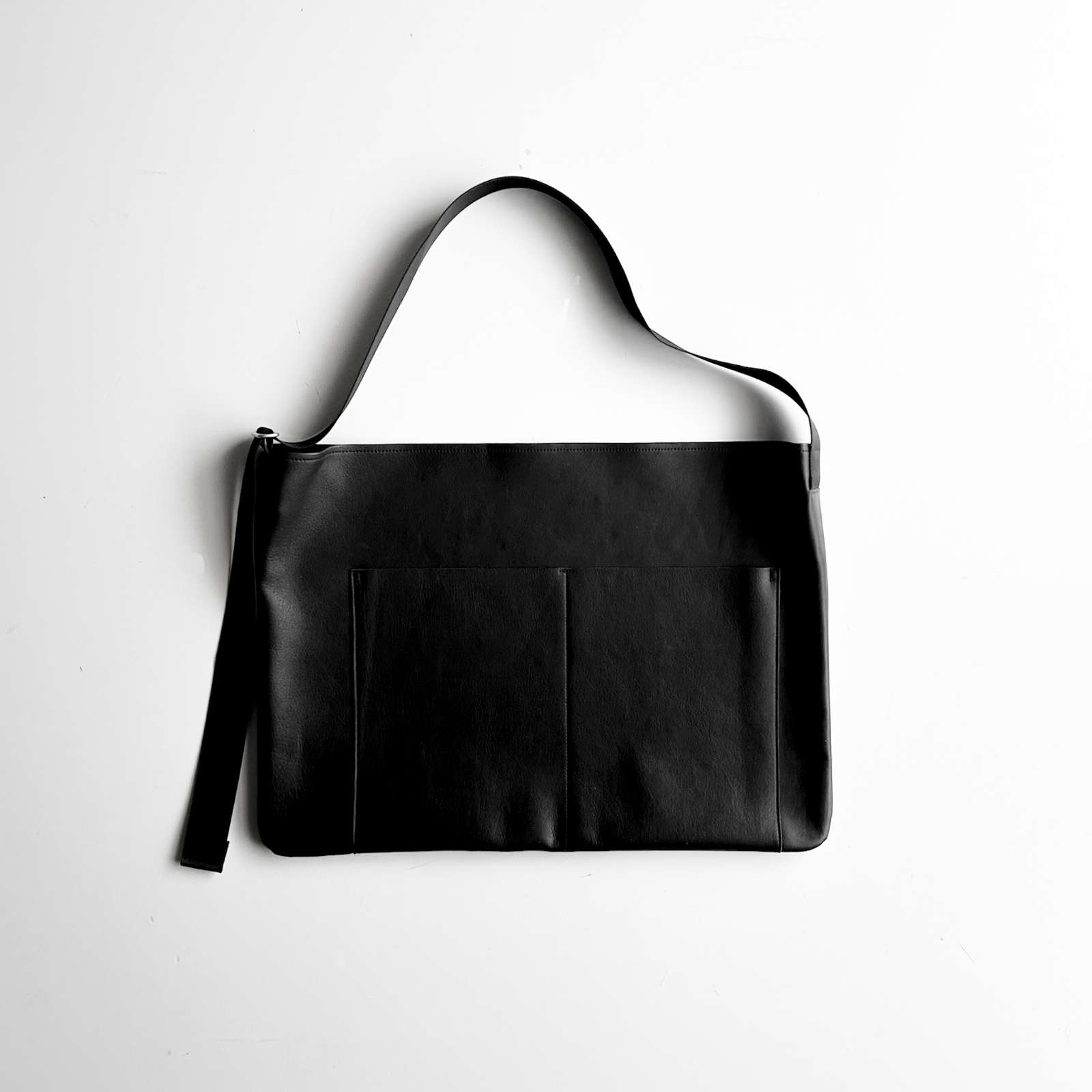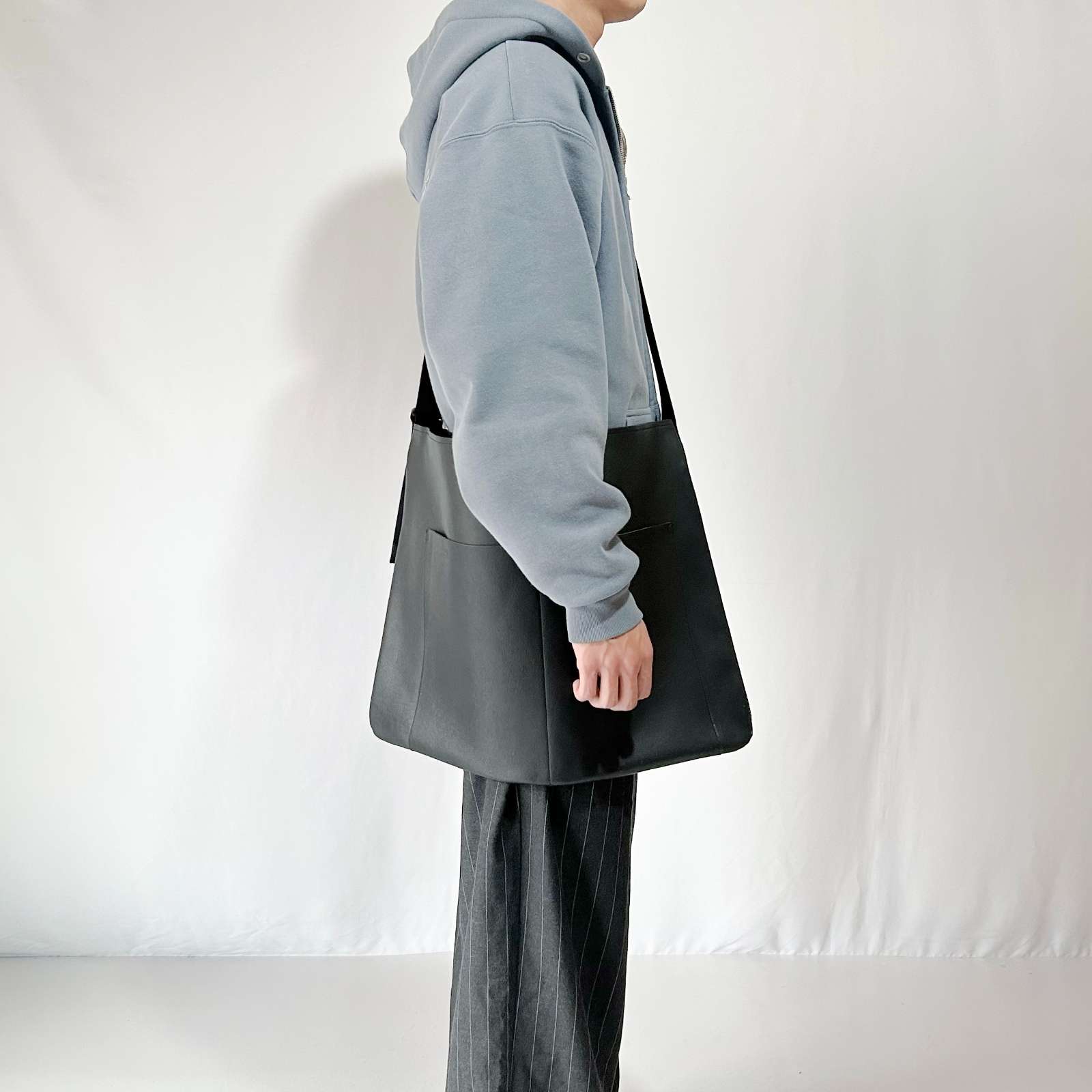 日本国内の最高級カウレザーを使用したショルダーバッグ。B3サイズまですっぽり入る大きなメインポケットと中心からあえてずらした500mlのペットボトルも収納できる深めなポケットが2つ付いています。柔らかな革質と独自のデザインにより、体のラインに沿うように着用が出来るので鞄がかさばることもありません。