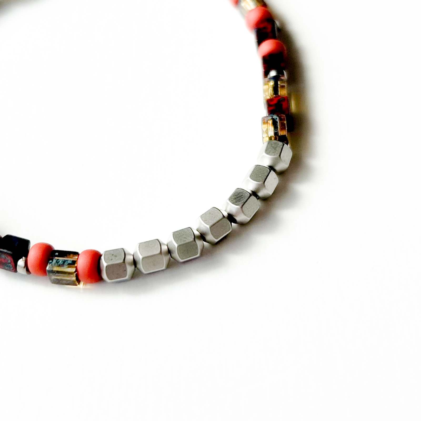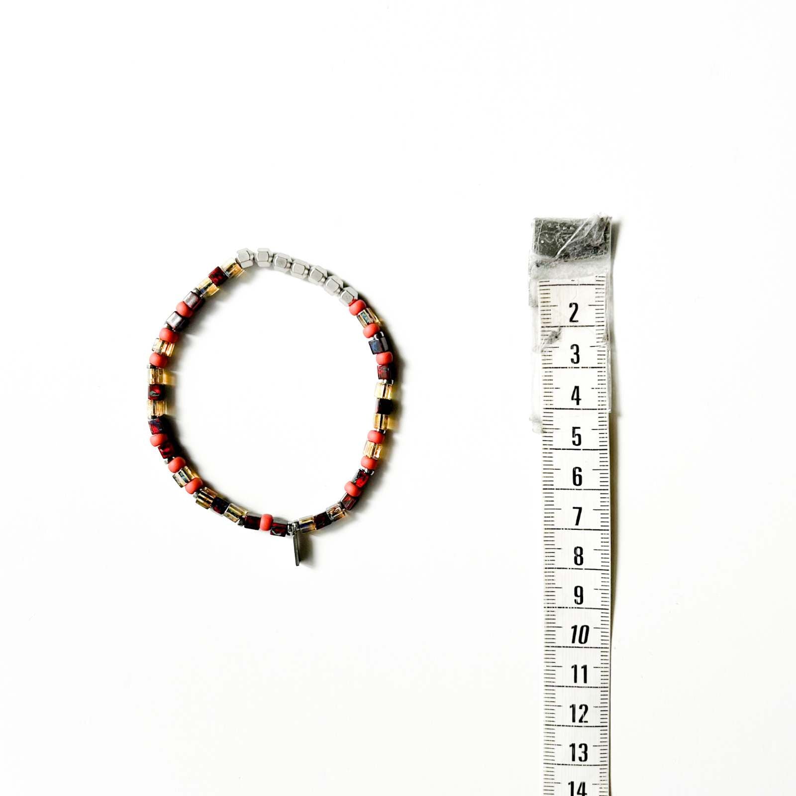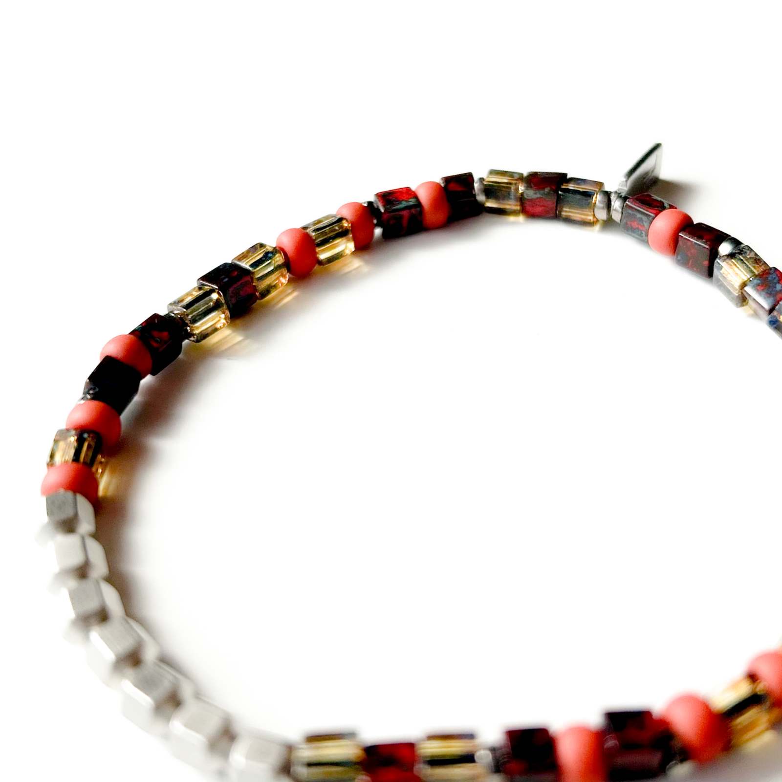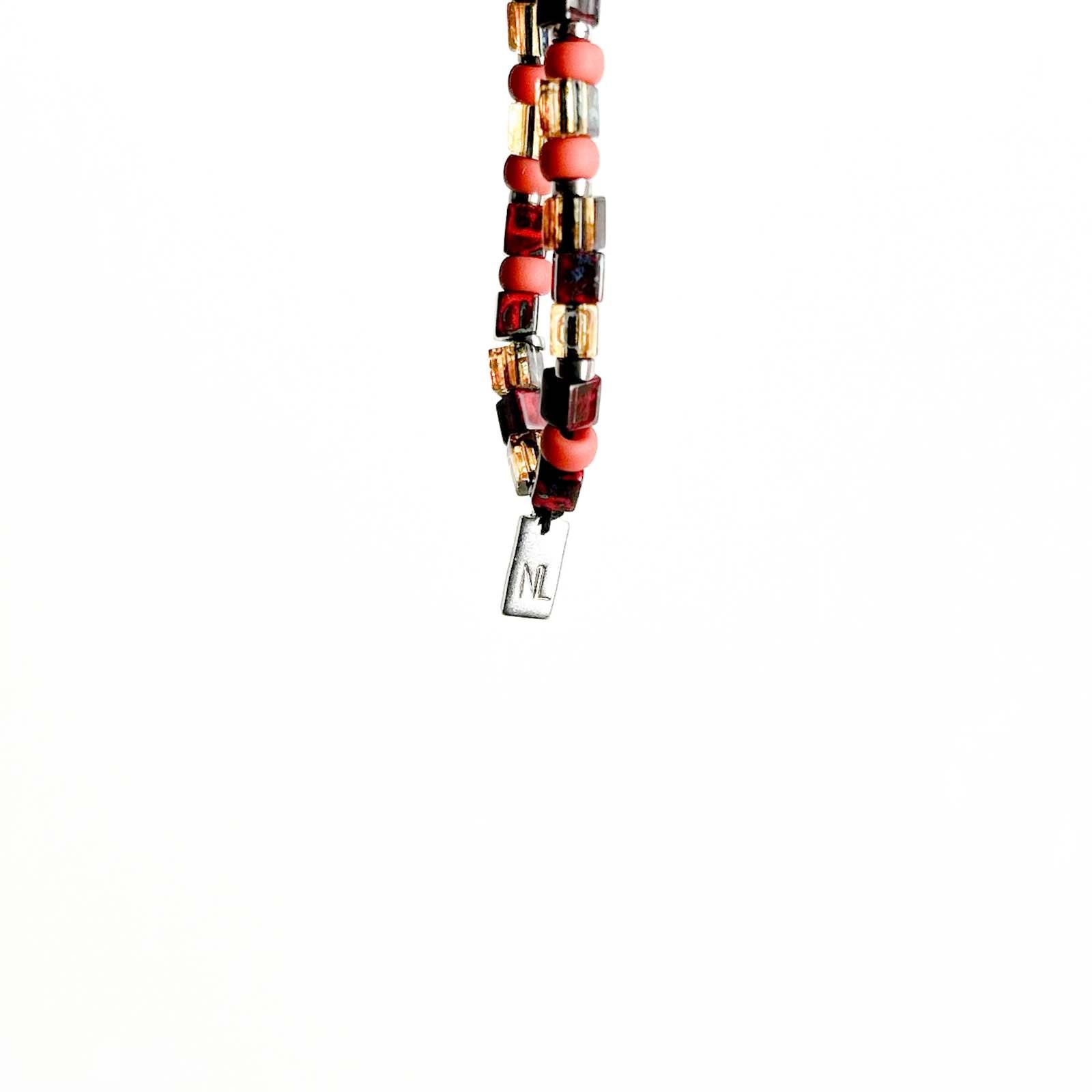 NLの人気シリーズの新作。色味をそろえたミックスビーズを使用し、スクエアのマーブルビーズはチェコ製。NLロゴ入りチャーム付き。 伸縮性のあるテグスを使用しているため、着脱もスムーズ。ハンドメイド製作のため、風合いや色合いに個体差がありますが、デザインの一部としてお楽しみください。