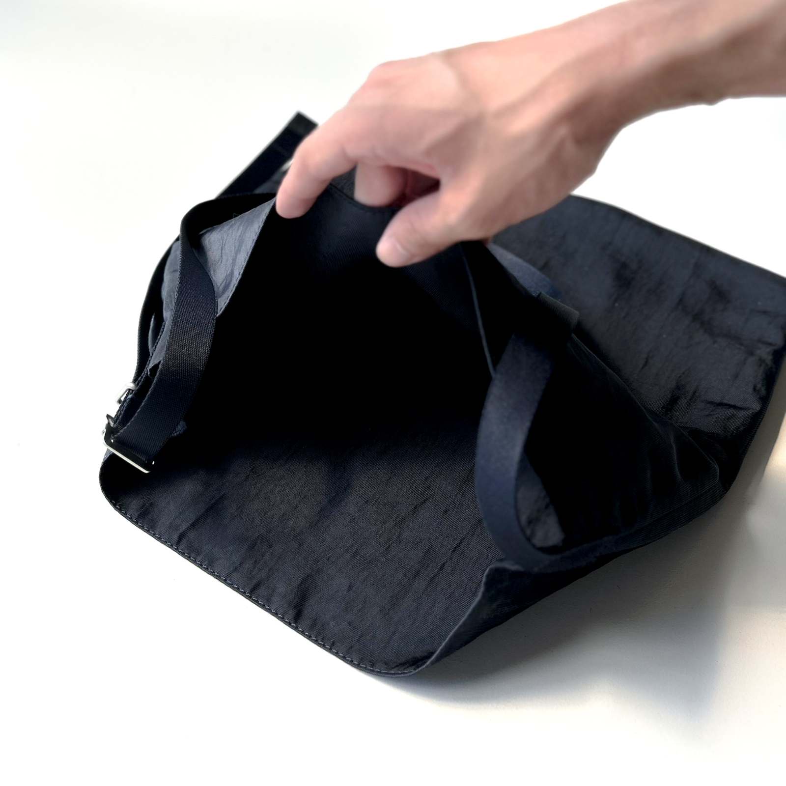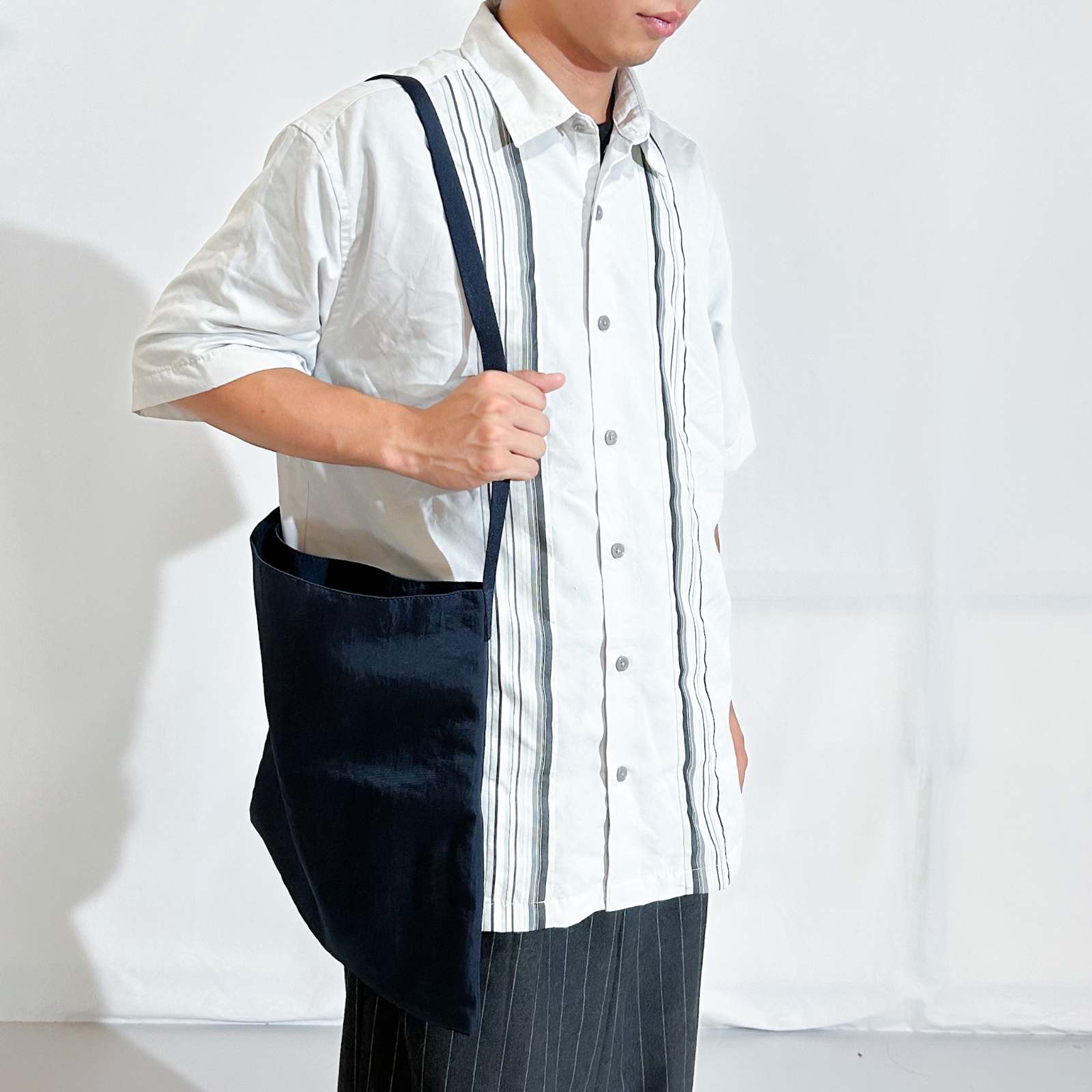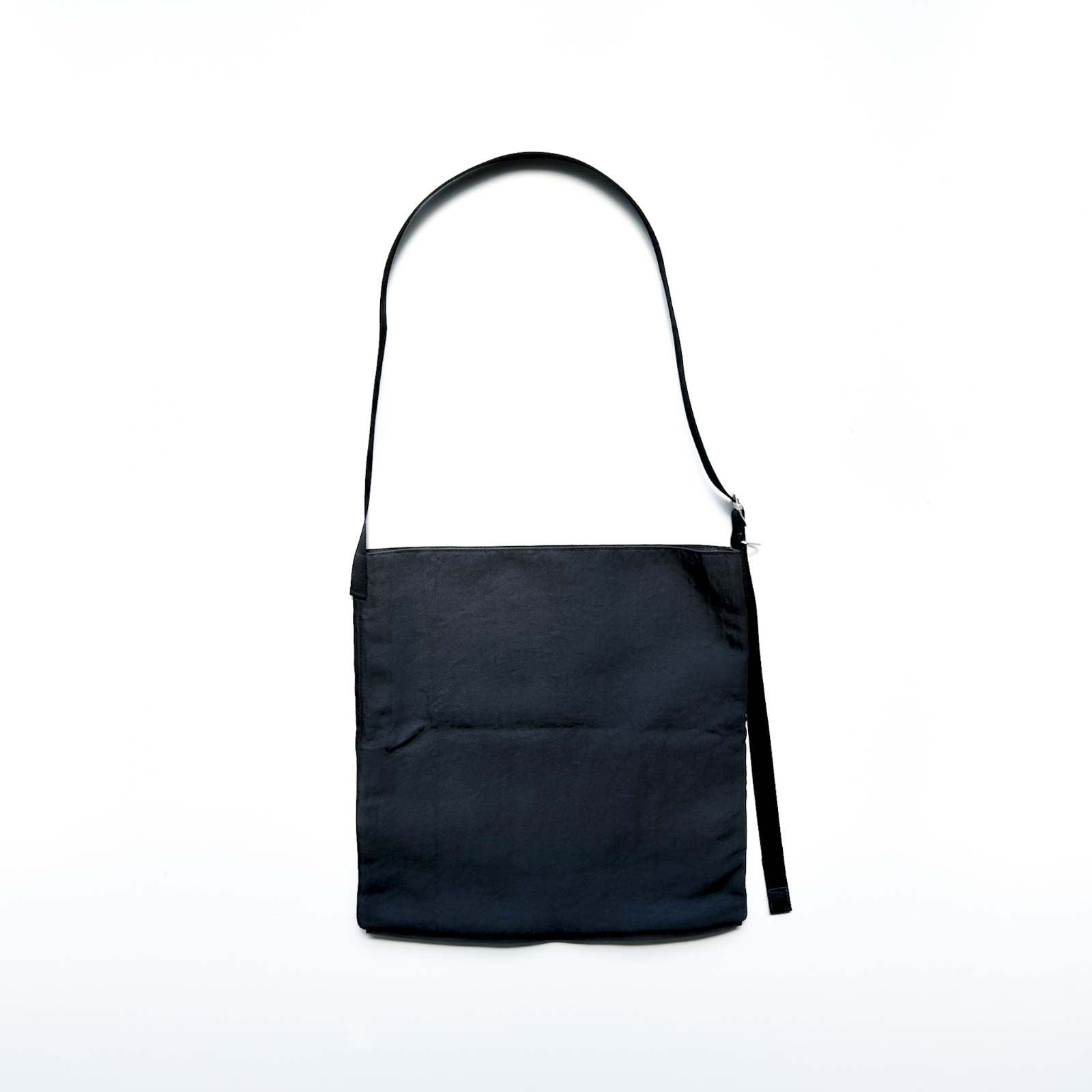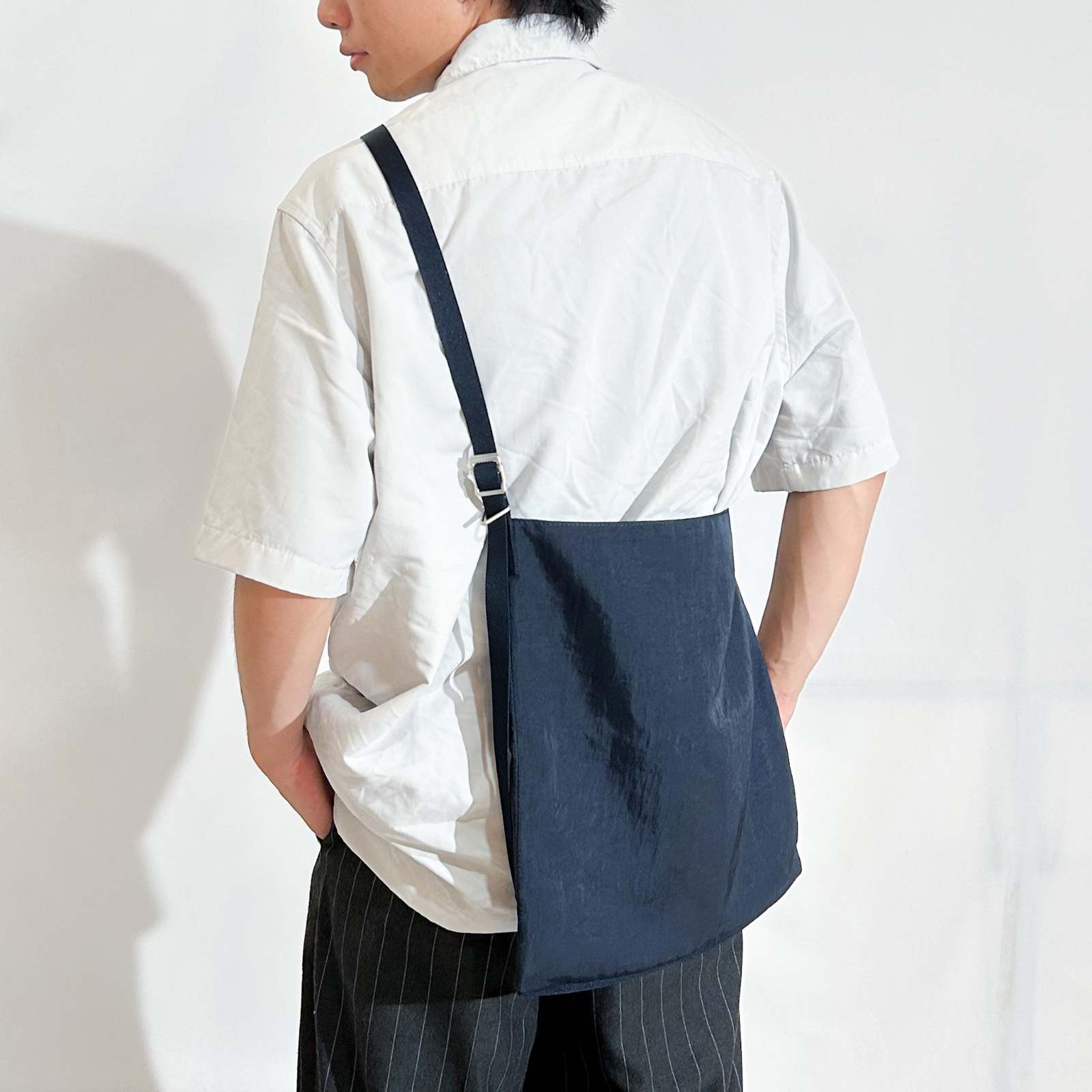 ナイロンツイル生地を使用した新型ショルダーバッグ。生地全体にナチュラルなシワ感があり、着古したようなヴィンテージ風の表情に。 撥水加工を施した柔らかい生地で、着用時に体にしなやかにフィット。 底面にはテープを配し、シルエットの安定感も◎ シンプルなデザインで、性別問わずご使用いただけます。 カラーはブラックとネイビーの2色展開。
