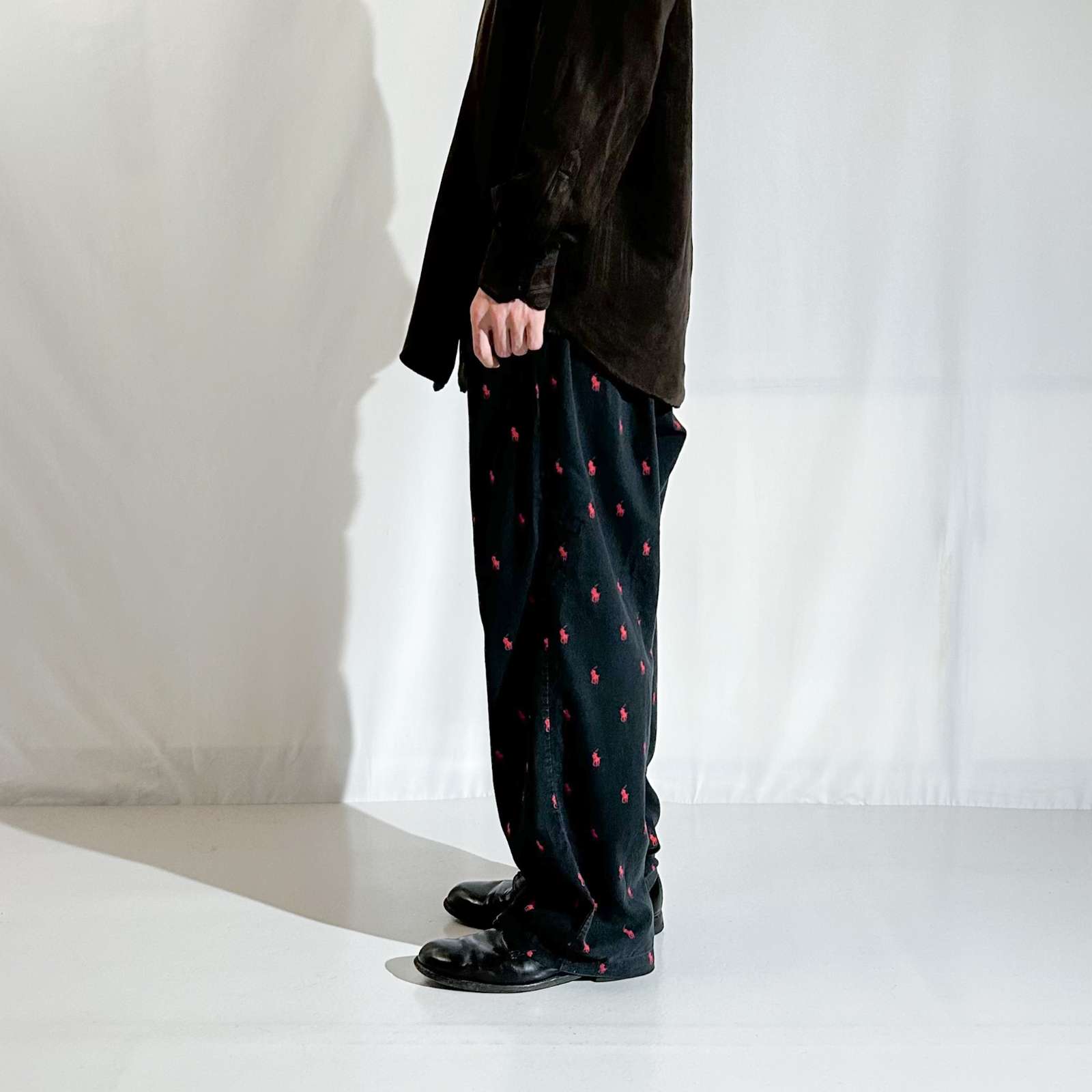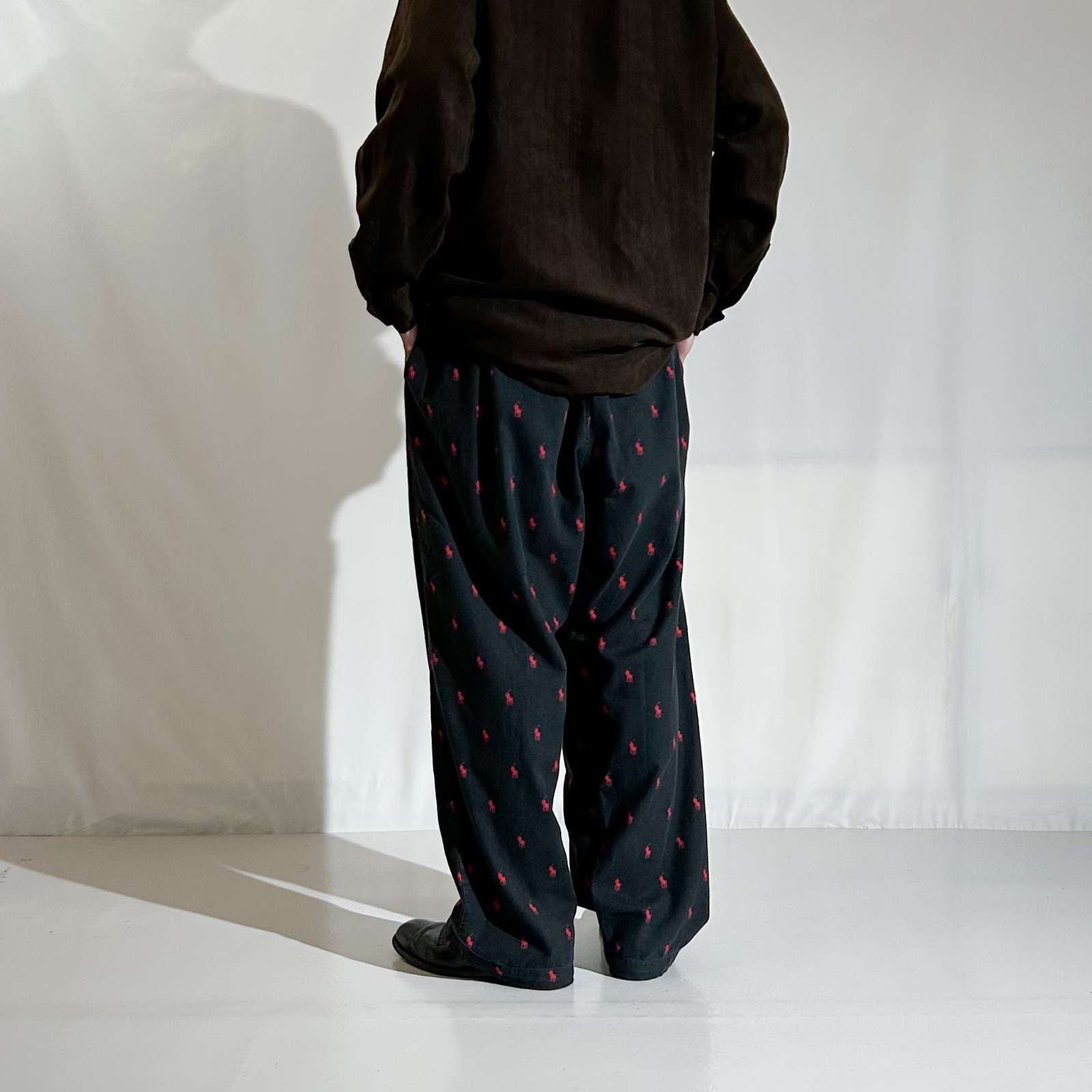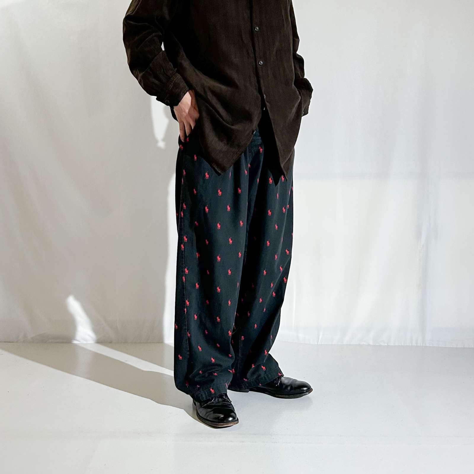 今回はテーマを”大人キレイめカジュアル”に絞り、当店人気のパジャマパンツから秋の立ち上がりに活躍するコーデュロイパンツまで10点セレクトしました。こちらは〈Ralph Lauren〉のパジャマパンツ。黒ベースに赤のポニーロゴが全面に散りばめられた総柄デザインで、ラルフらしい遊び心を感じられる一本です。 ウエストはドローコード仕様でどなたでも着用可能。さらに、パジャマパンツには珍しく両サイドポケット付きという実用的な仕様も魅力です。街使いのシーンで意外とポケットがないと不便ですが、そこをしっかりカバーしてくれるのが嬉しいポイント。シルエットは渡り脅威の41cmという極太ワイド。秋口のリラックス感ある着こなしにもってこいの存在感です。ちょい古めのラルフタグが付くのも嬉しいディテール。